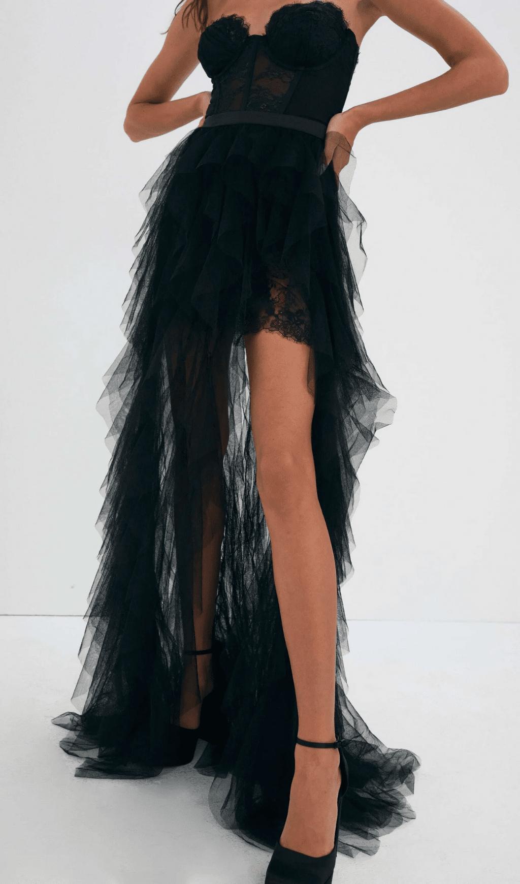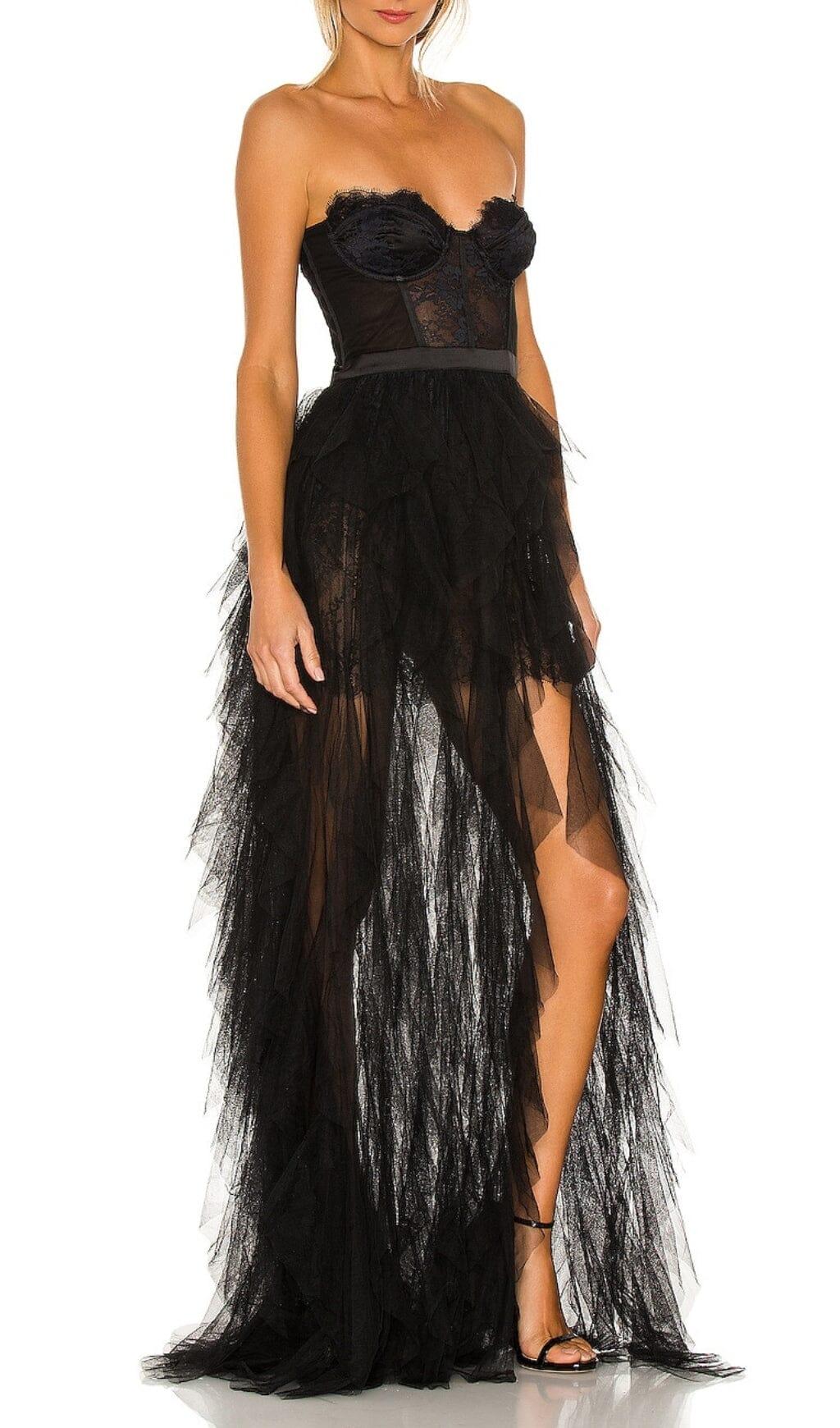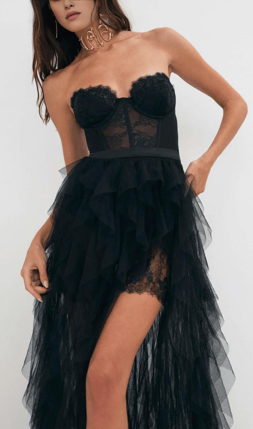 BLACK STRAPLESS LACE PATCHWORK MESH MAXI DRESS