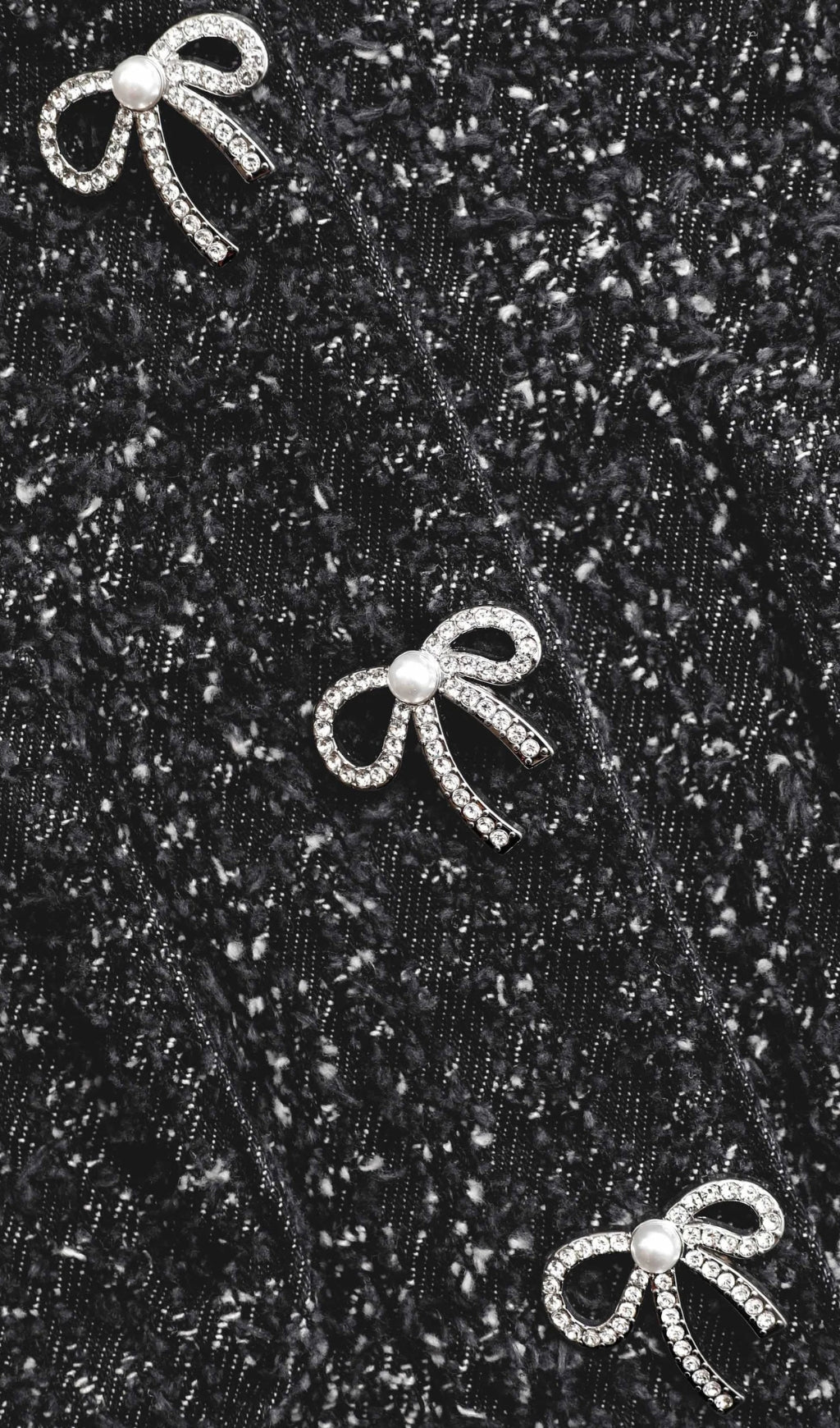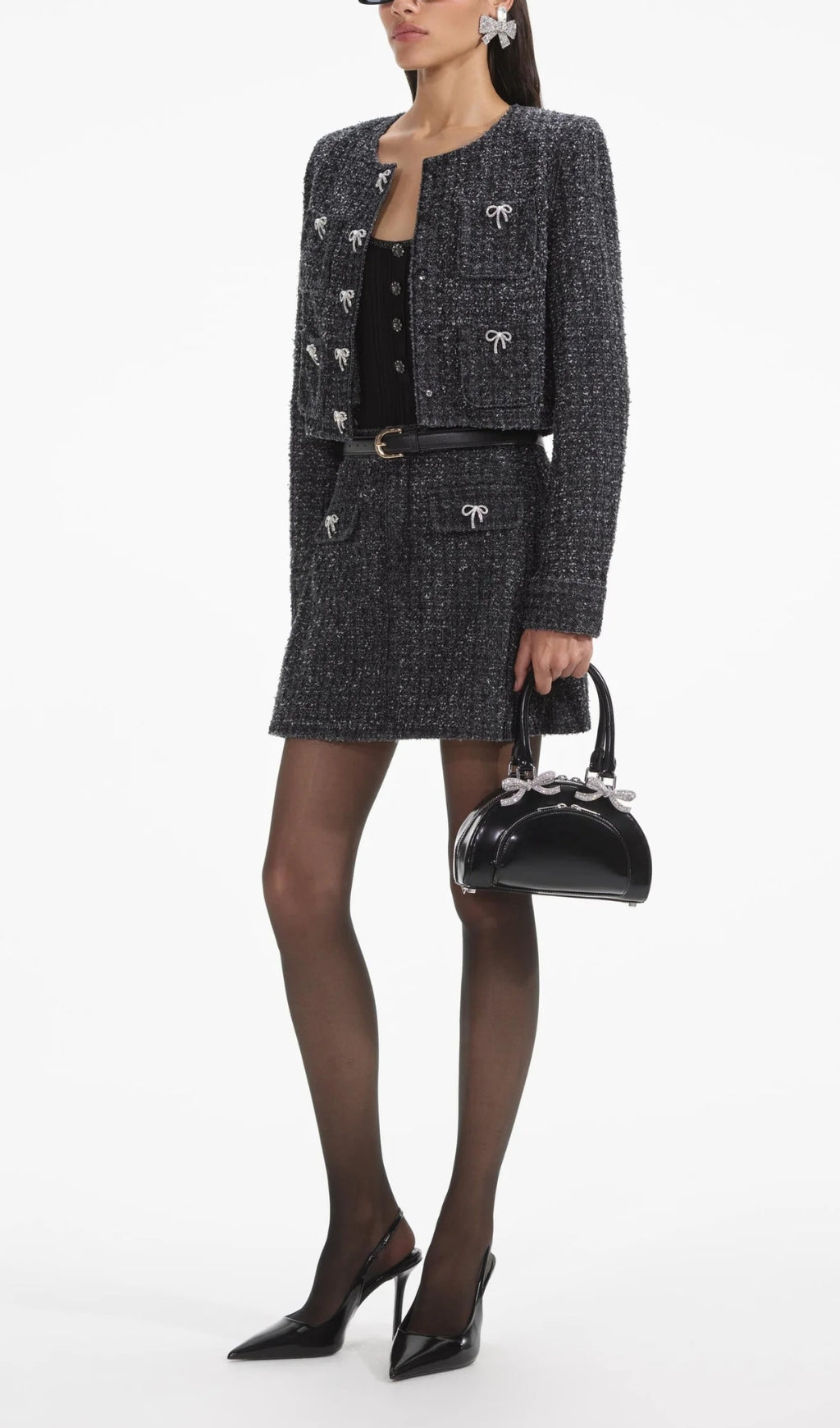 Feminine flair meets casual charm in this denim jacket, which is decorated all over with our iconic bow. Dress it up with the matching skirt and double down on the bows with our statement earrings and a mini bag.