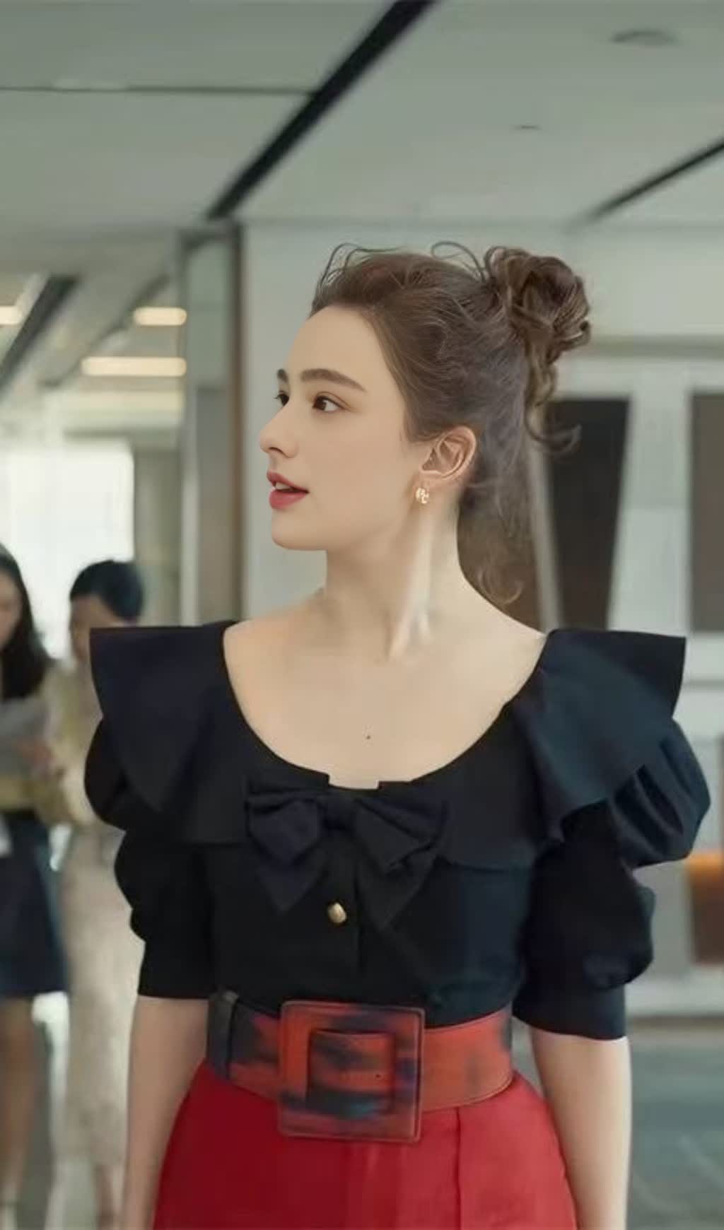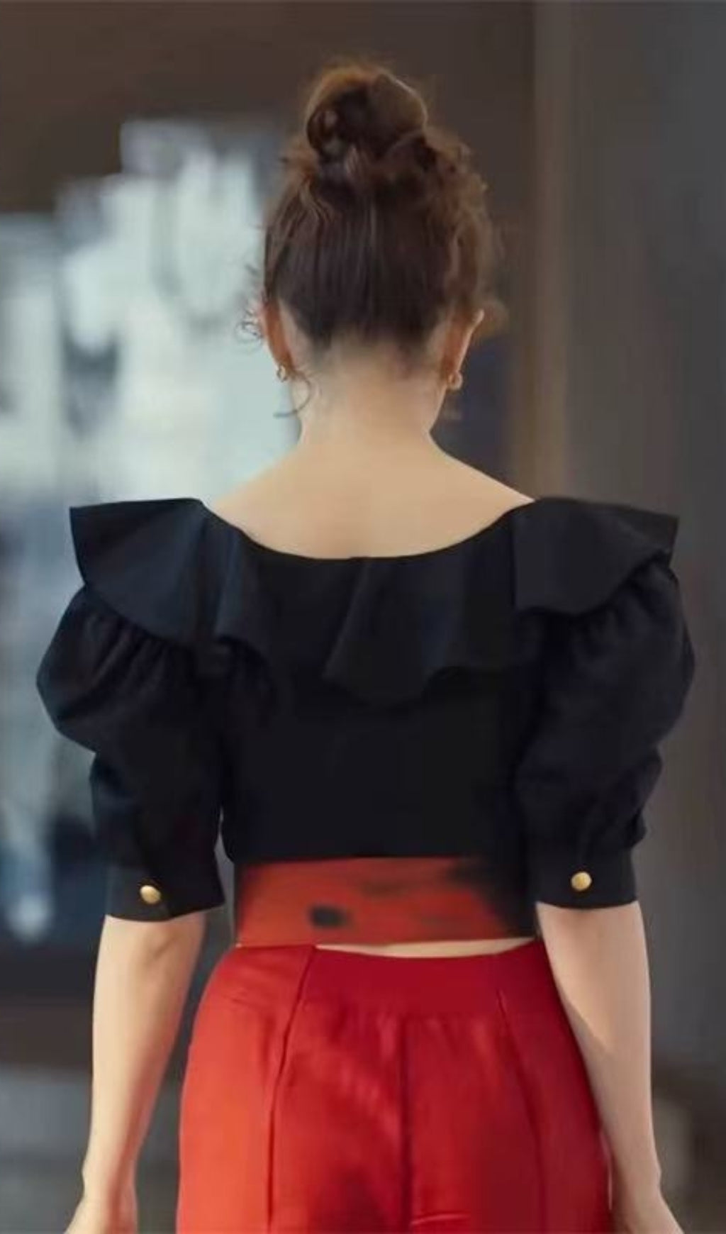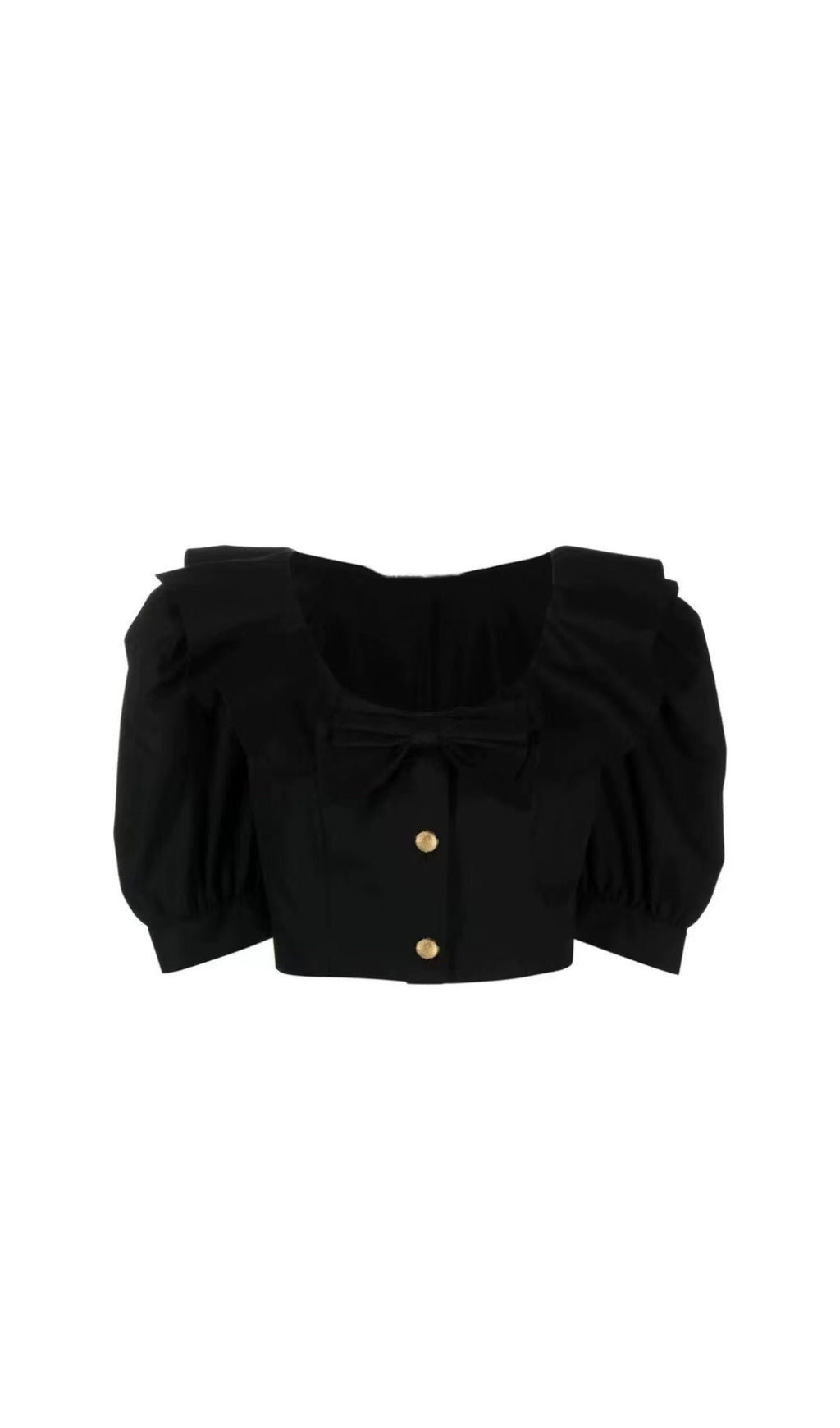 Black short - style top, with a square neckline, puff sleeves, a bowknot decoration on the chest and two golden buttons. It has a sweet and somewhat retro style, showing a unique sense of fashion and suitable for creating a variety of dressing styles.