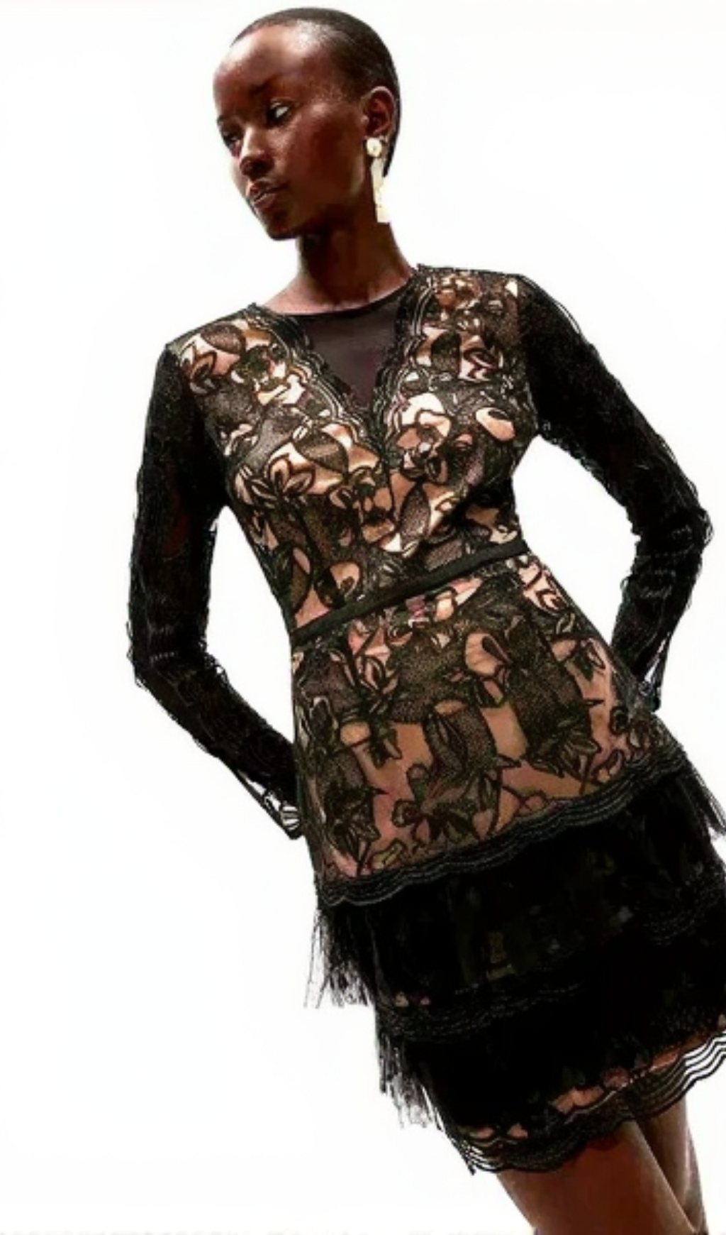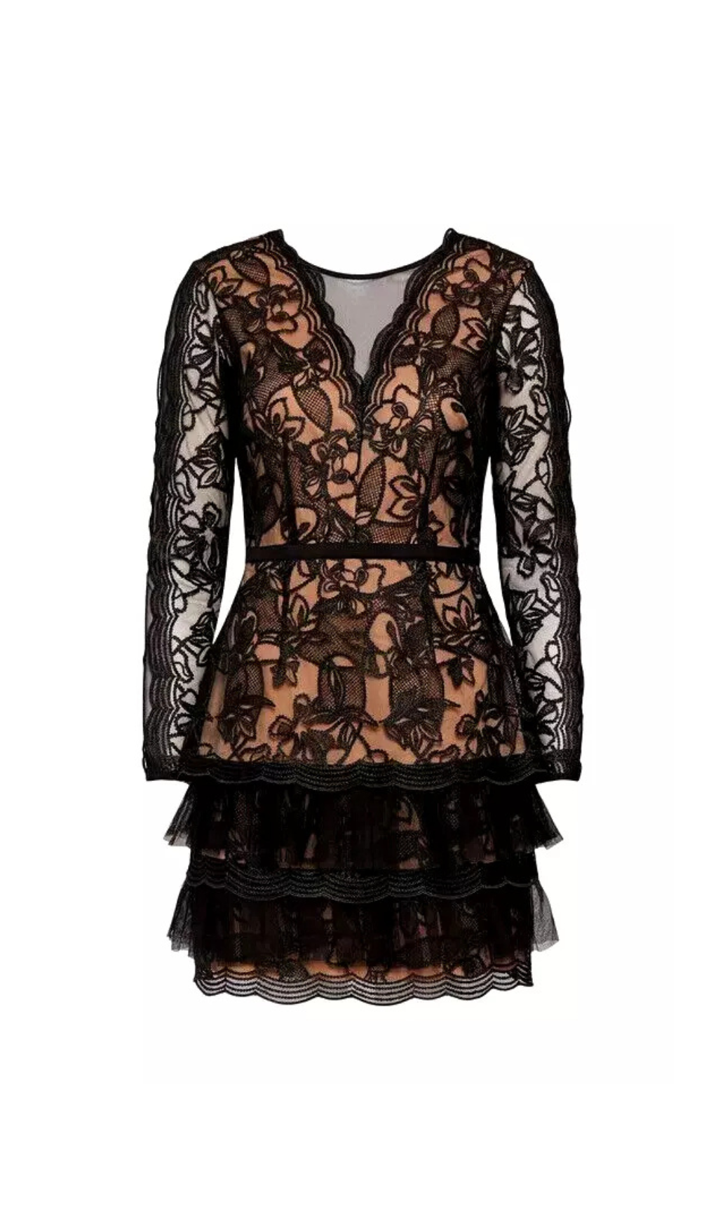 black tulle ruffle hem embroidered lace mini dress