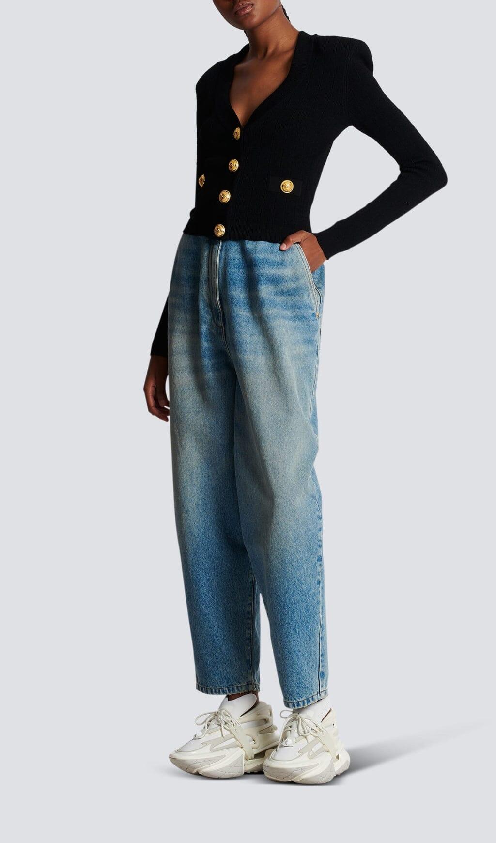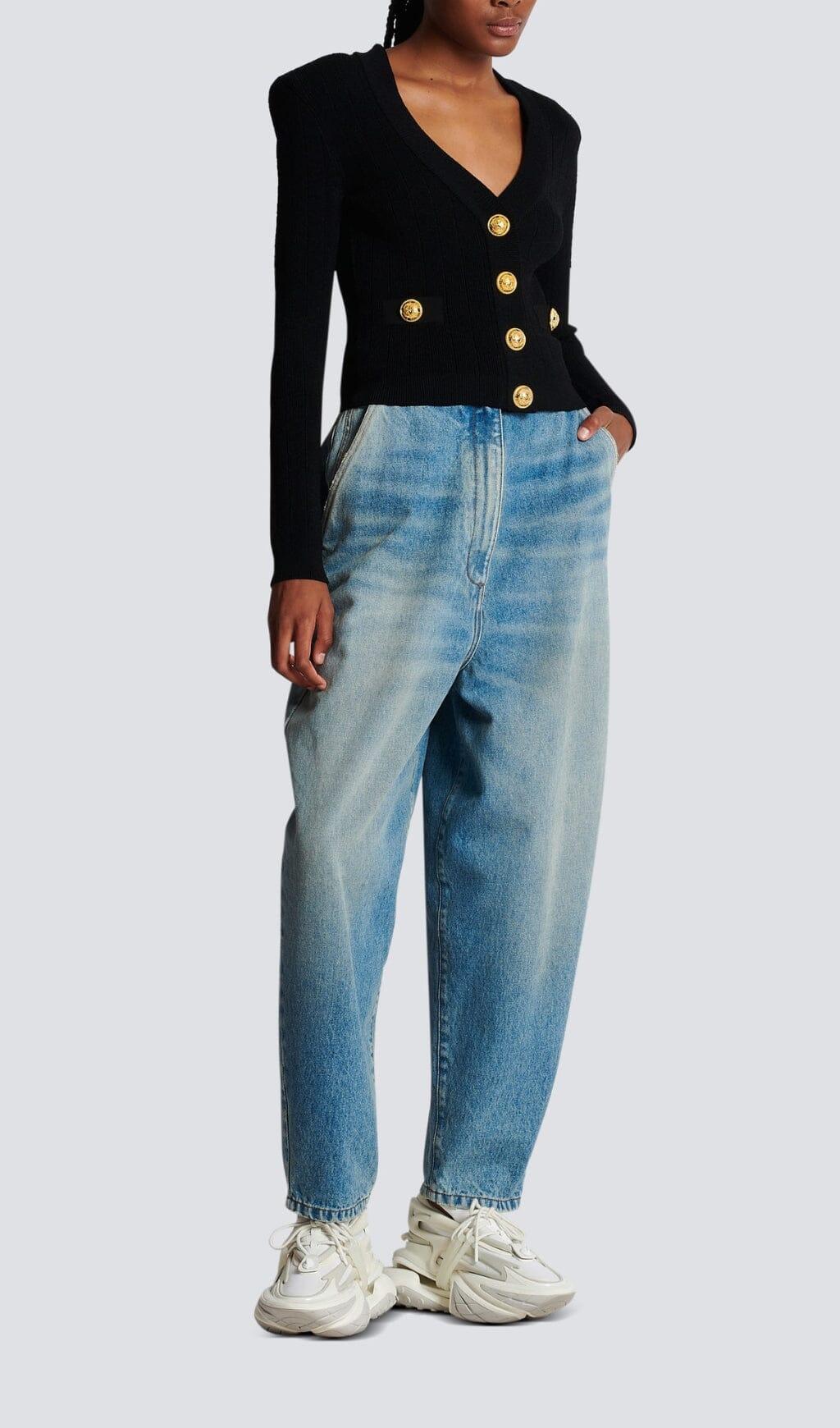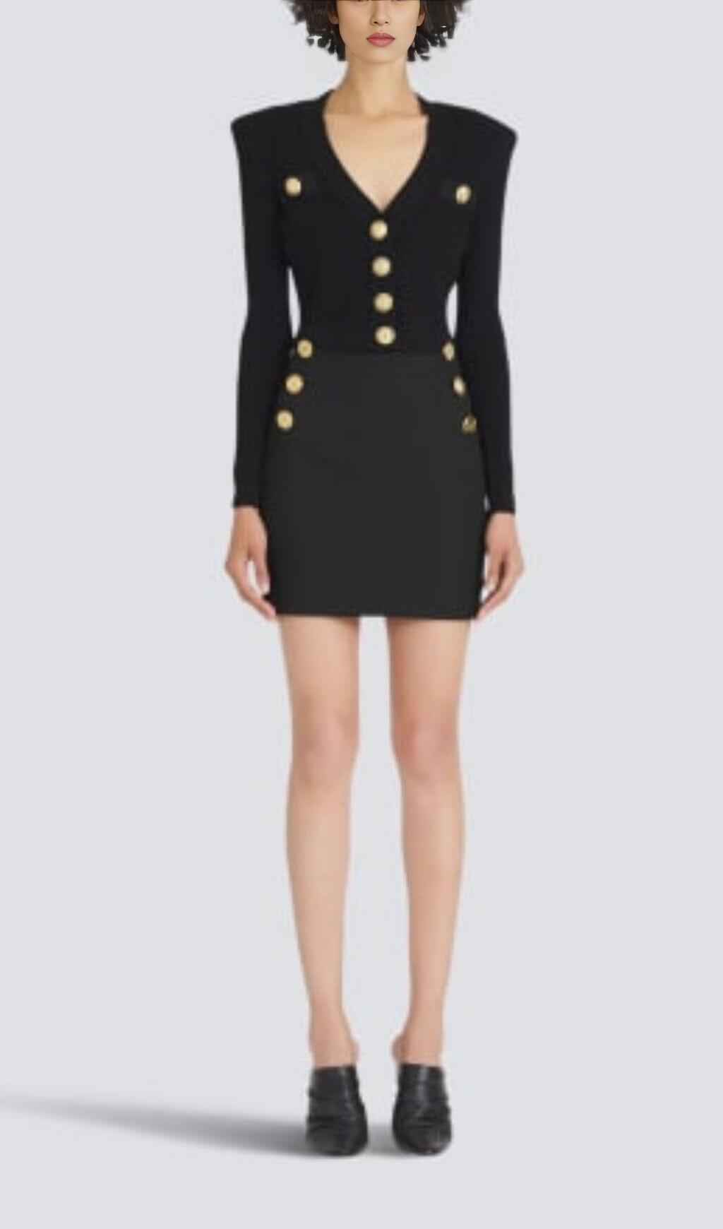 Elevate your wardrobe with this BLACK V-NECK METAL BUTTON CROPPED KNIT CARDIGAN, crafted from exquisite knit fabric for a sophisticated and stylish look. This versatile and timeless piece features a sleek V-neck, metal buttons, and a flattering cropped silhouette. A truly luxurious addition to any wardrobe.