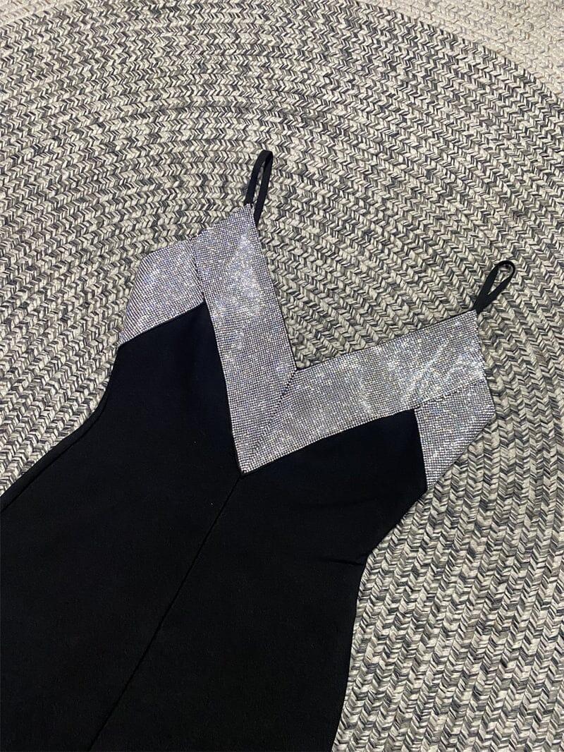 Elevate your style with our Black V-Neck Rhinestone Decorative Suspender Dress. Shop now and exude confidence and elegance at your next event!