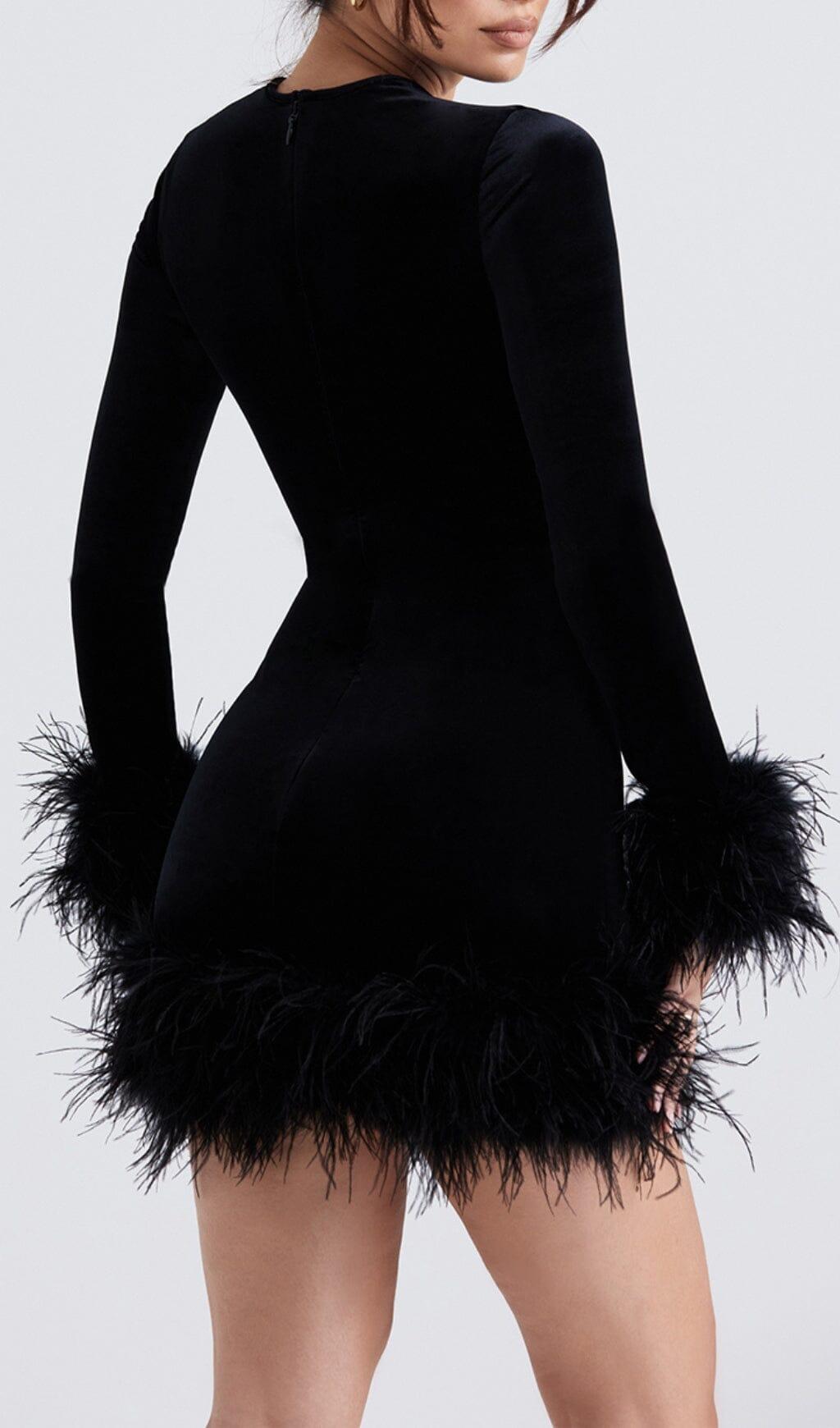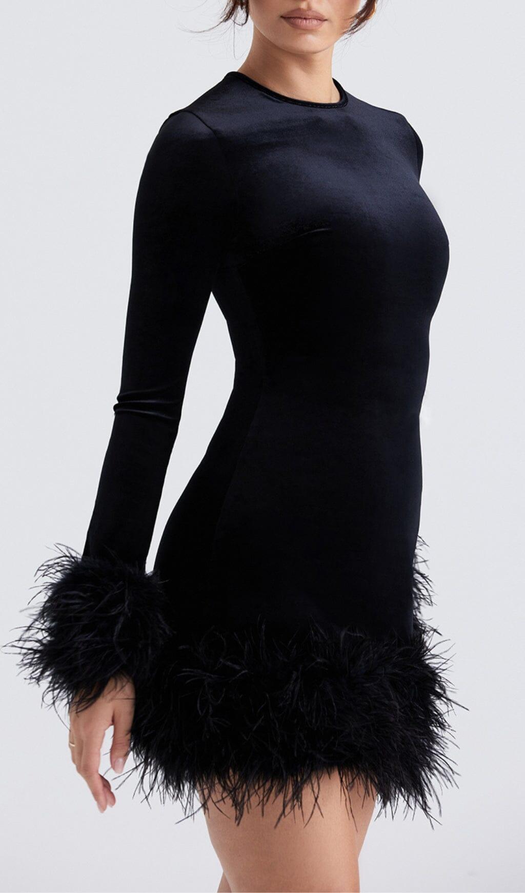 Step out in style with our glamorous black velvet mini dress. Designed to turn heads, this dress is perfect for champagne bars, parties, and special events. Made from plush black stretch velvet, it features a simple rounded neckline and a dramatic feathered hem that will make you the center of attention. As with all our HOCB dresses, the body is fully lined for a smooth and comfortable fit. The dress zips up the back for easy on and is suitable for any bust size as it has no cups.