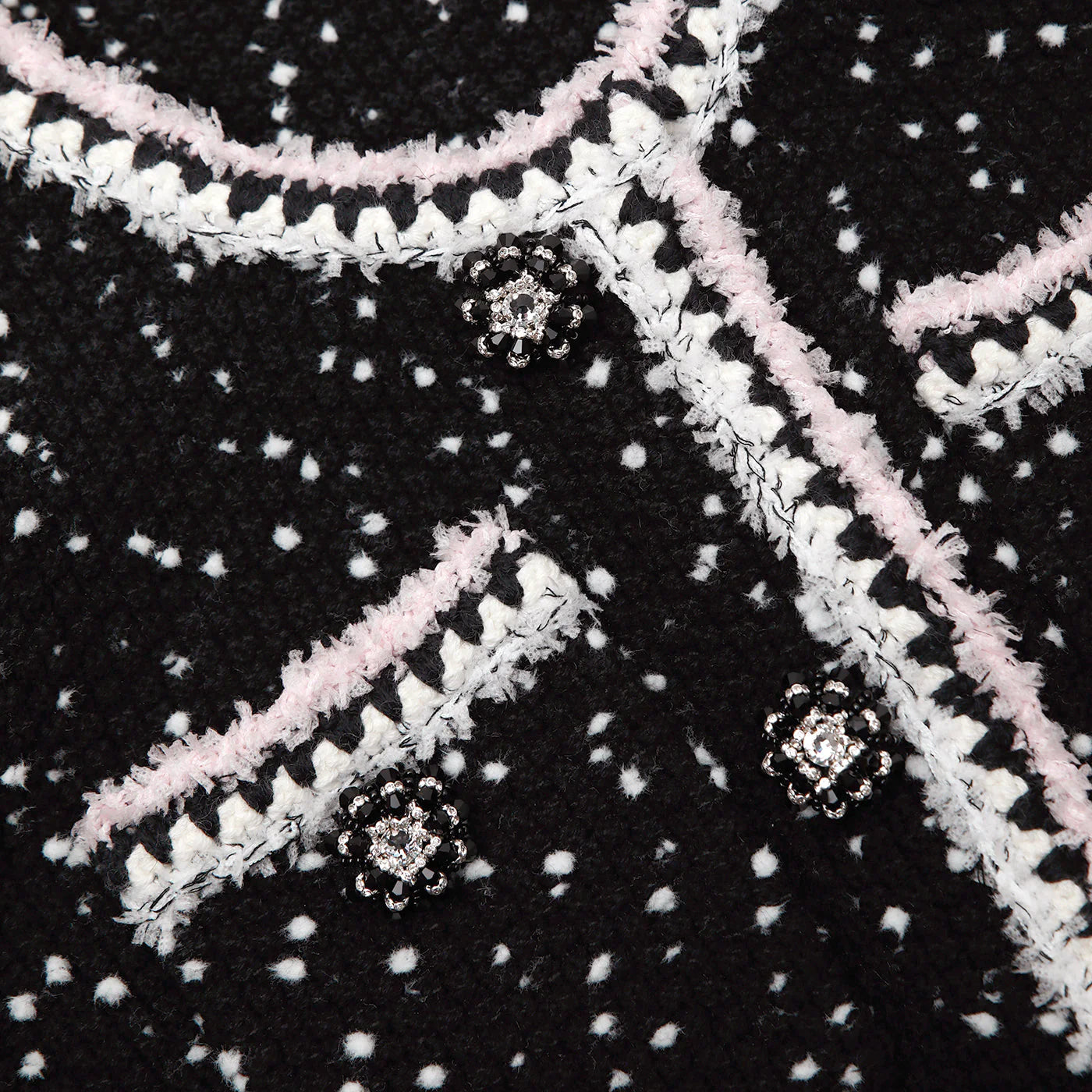 This stylish cardigan features a unique black and white knit pattern, perfect for adding a touch of playfulness to any outfit. Keep warm and on-trend with this must-have addition to your wardrobe.