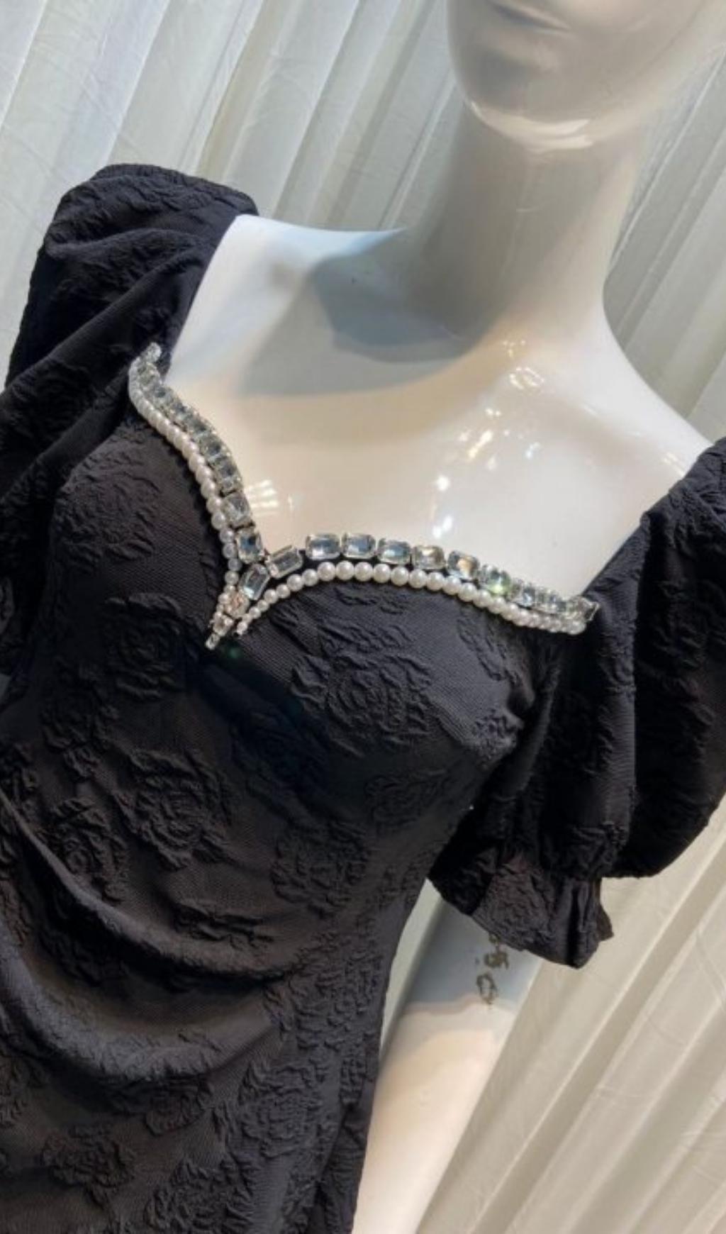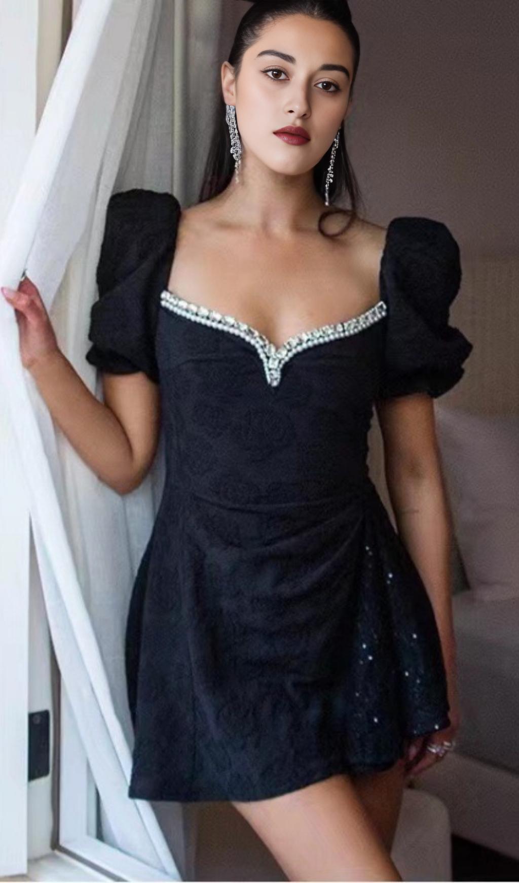 Give your wardrobe a serious update with this gorgeous princess dress. Featuring a black material with a frill hemline, puffy short sleeves, and a diamond outline along the top. Style this with simple heels and a mini bag to complete the look and catch some attention.