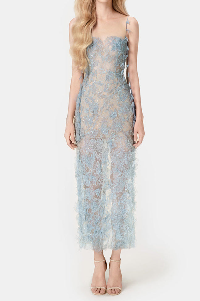 BLUE BEADED LACE PENCIL MIDI DRESS