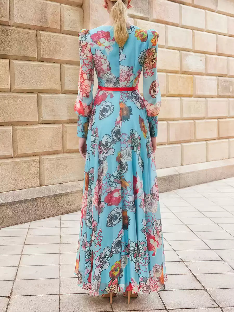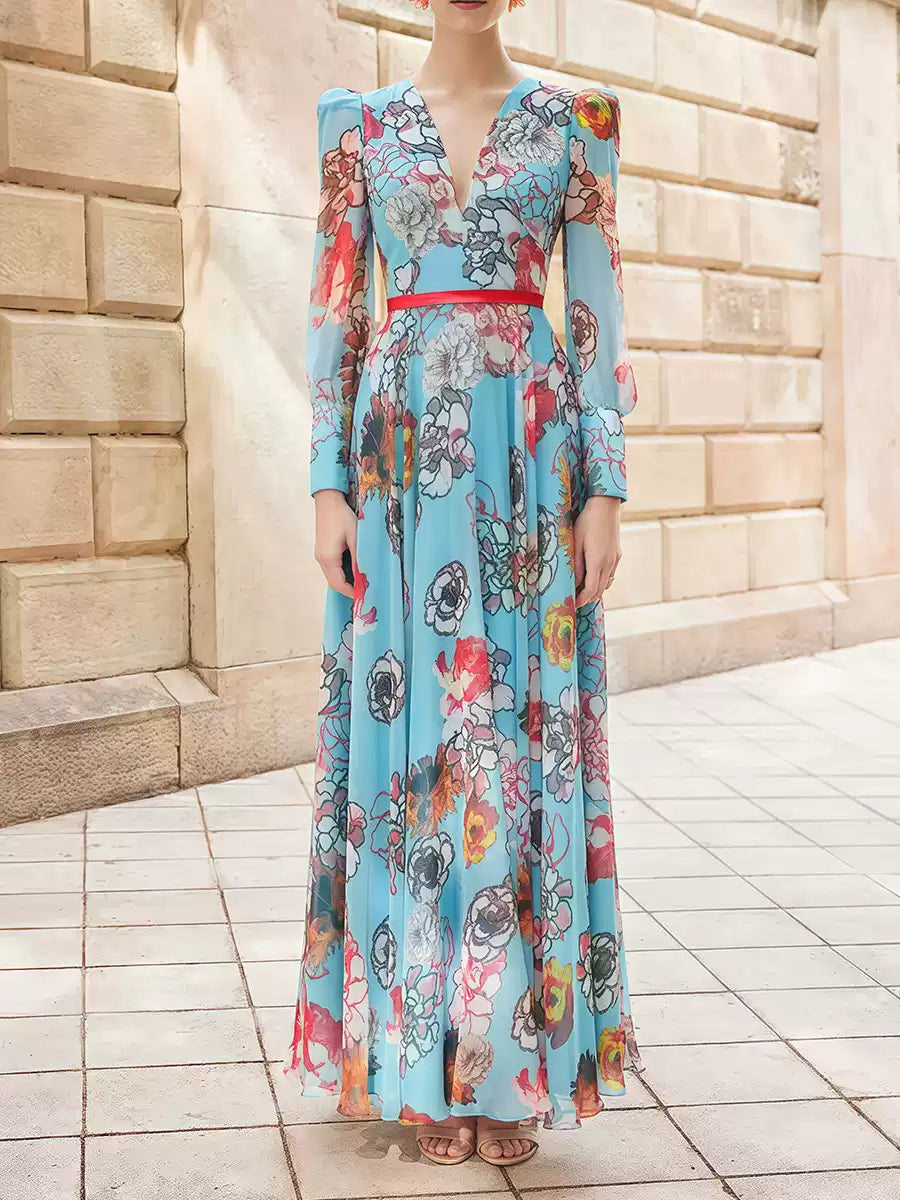 Blue Floral Print V - Neck Maxi Dress with Red Belt