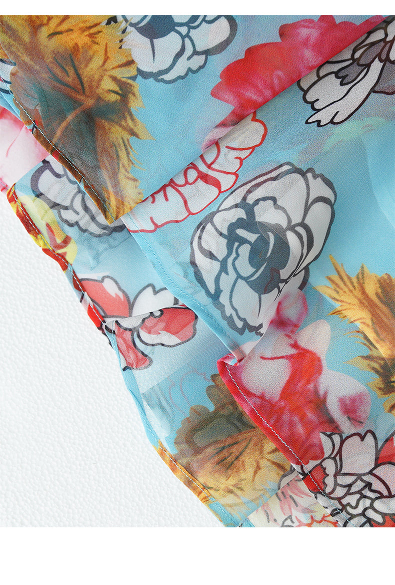 This dress features a blue base with colorful floral prints, a V - neckline, and a red belt for a pop of color. The sheer sleeves and maxi length create an elegant silhouette. Perfect for ��holiday break dress to impress�� moments, a ��beach pictures dress�� outing, or a garden party. Its bohemian - inspired design and vibrant details let you ��dress to impress�� with a summery, artistic charm, ideal for outdoor events or vacations where you want to stand out.