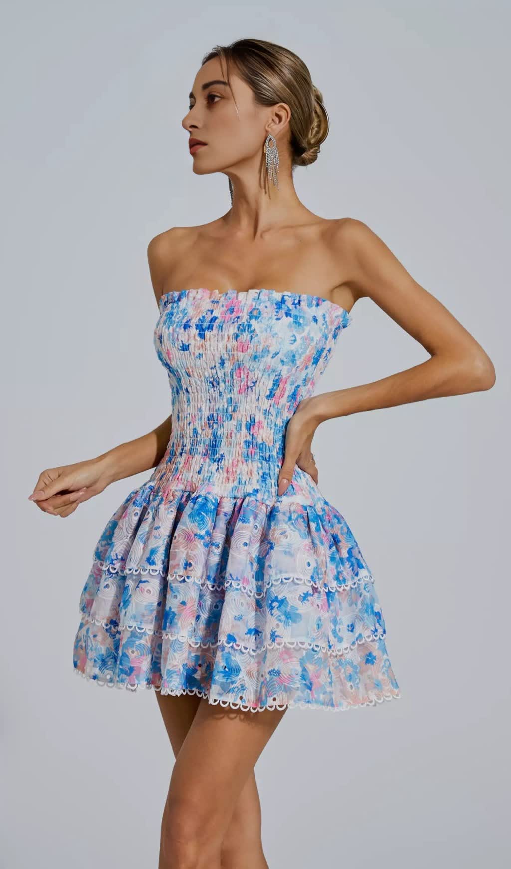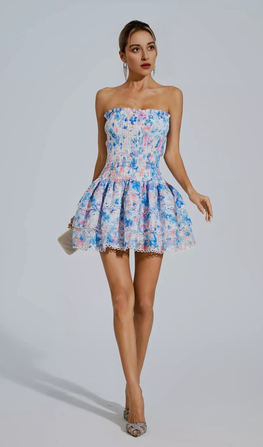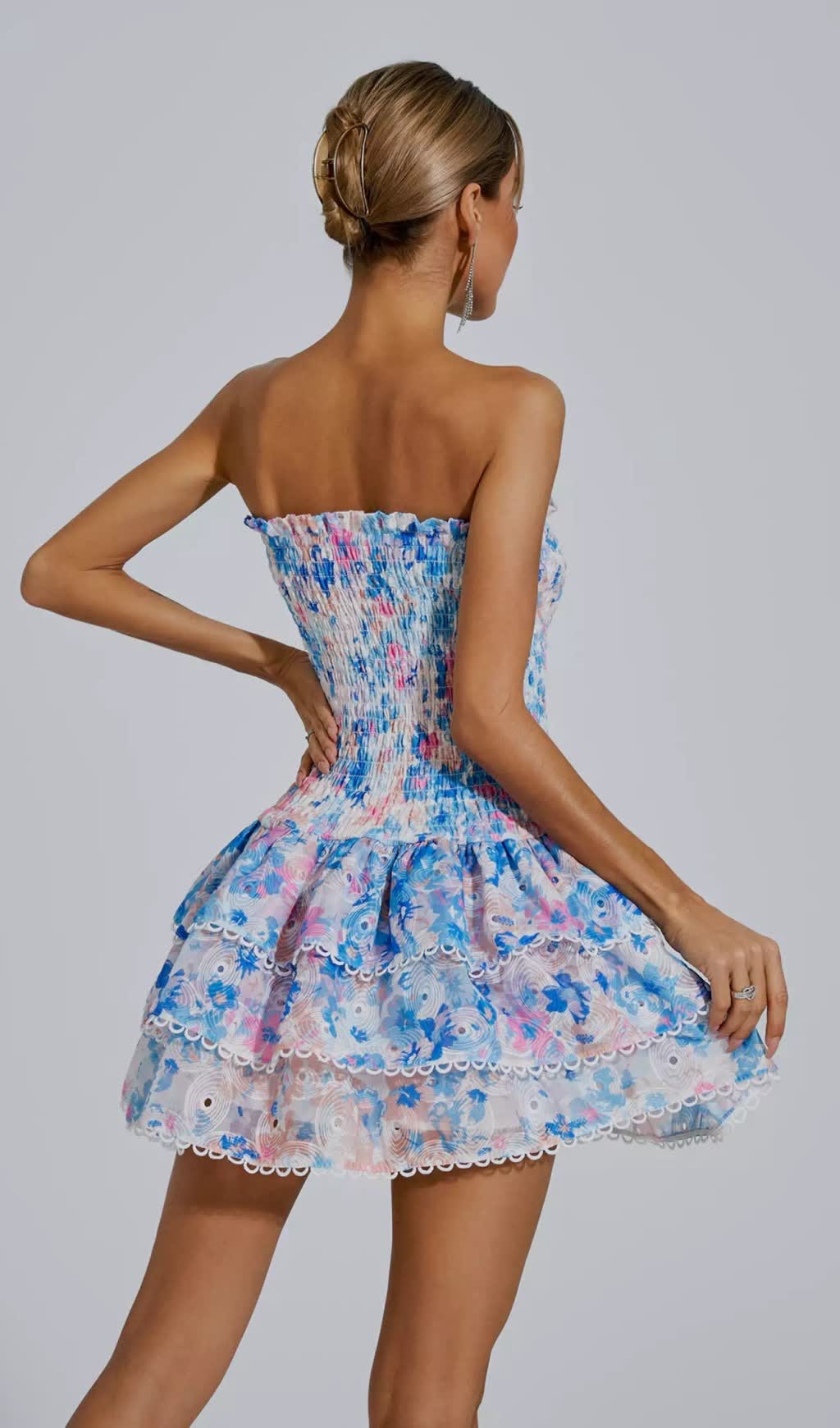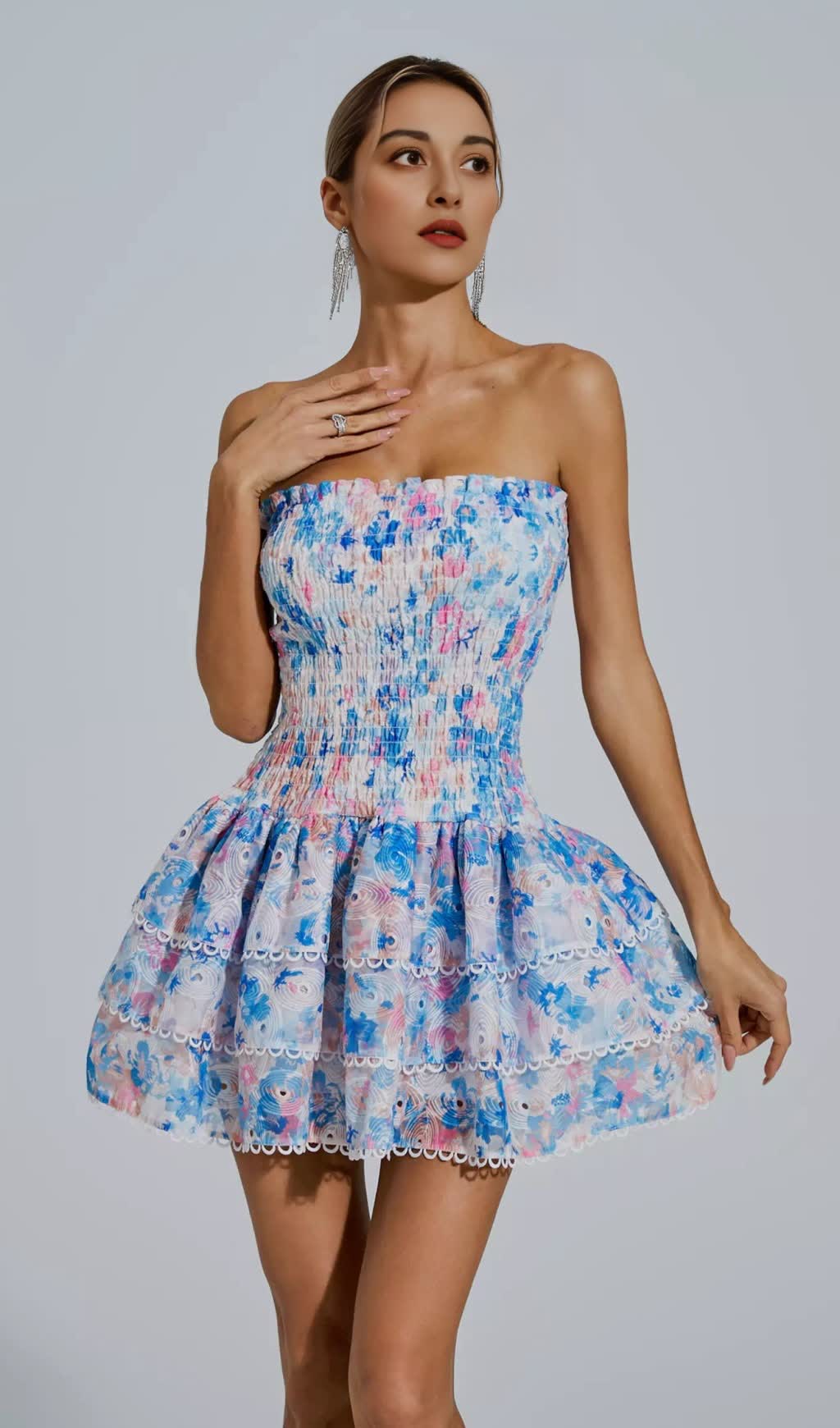 Featuring a stunning blue floral print and flattering ruched design, this strapless mini dress is perfect for any special occasion. Elevate your style and turn heads with this luxurious and exclusive piece.