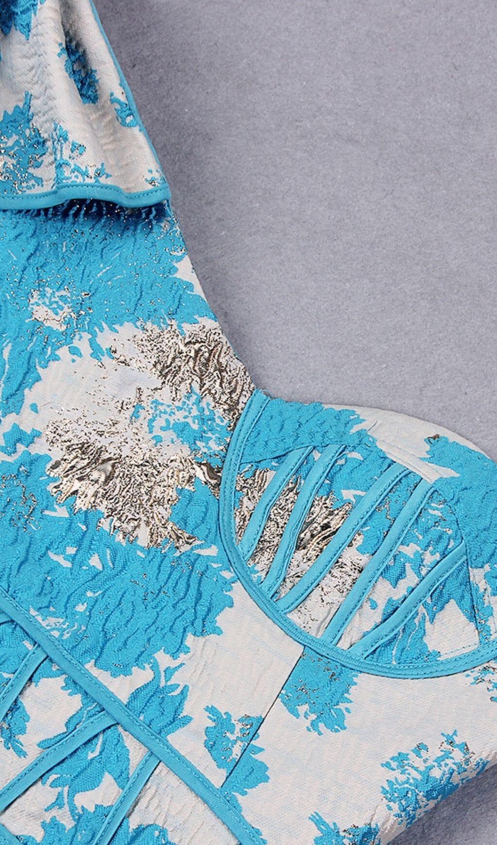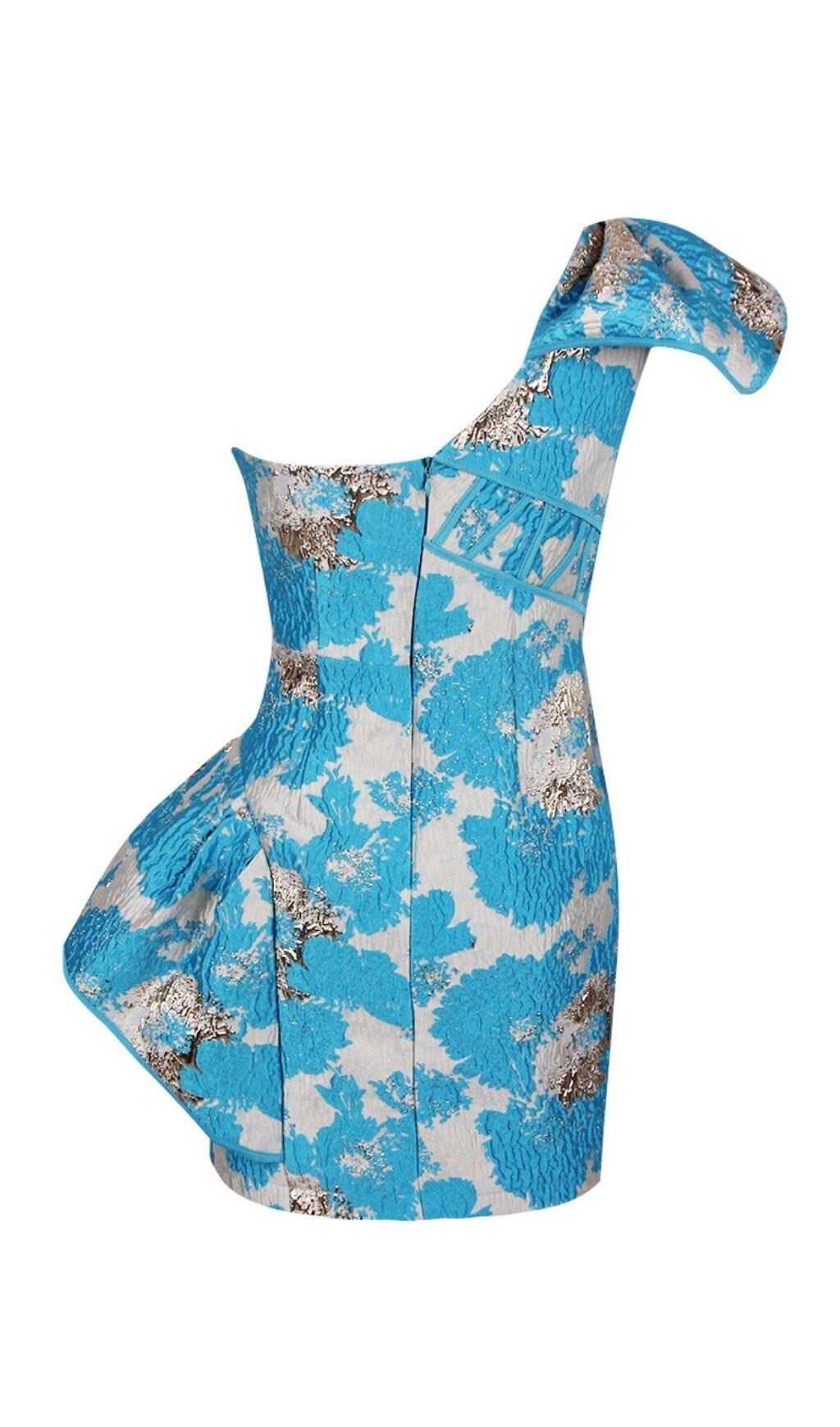 BLUE JACQUARD ONE SHOULDER MINI DRESS