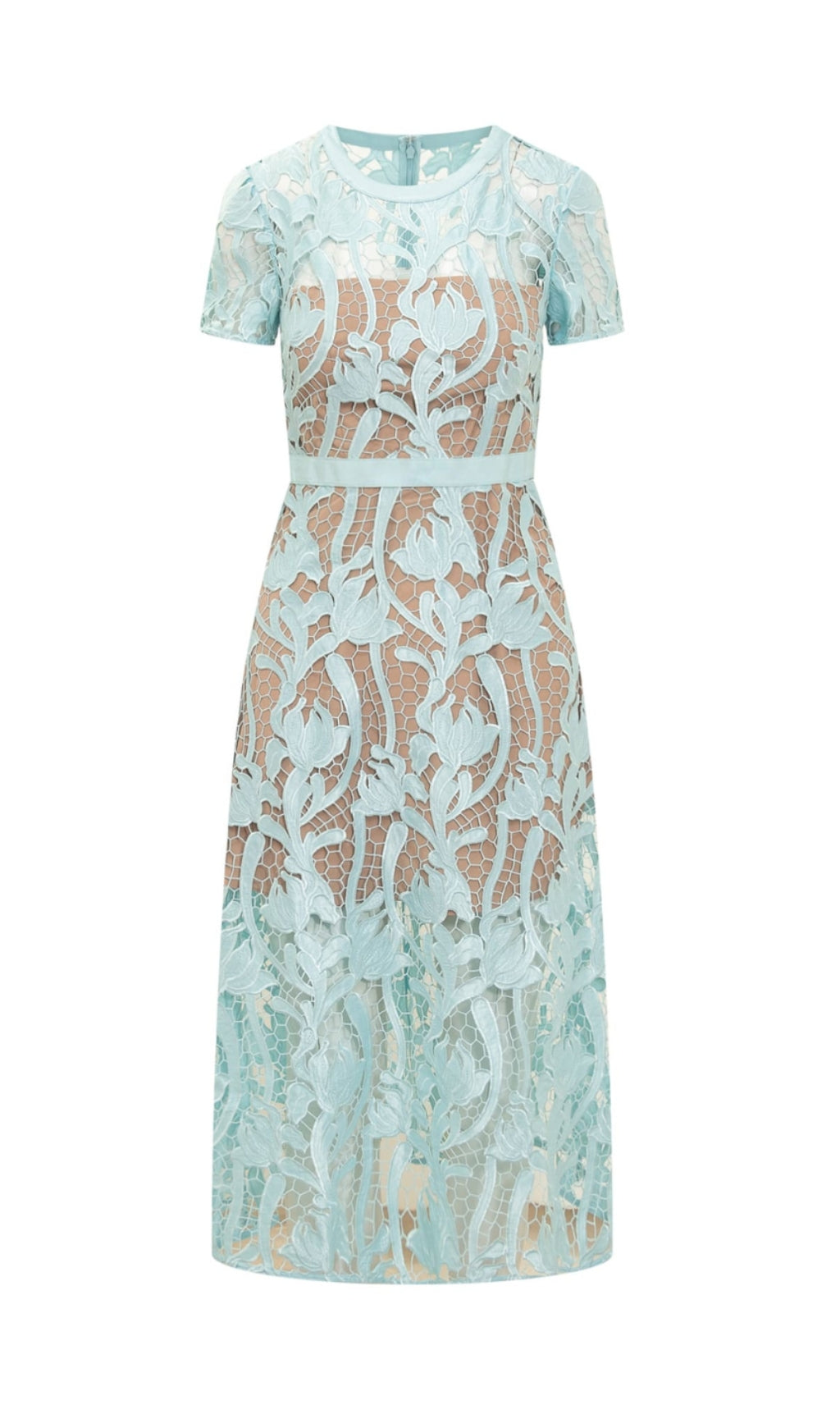 A figure-flattering vision in blue cut-out lace, this dress fuses a ladylike sensibility with photo-ready accents. Its chic crew neckline is lined with trim to echo its waist-cinching tonal belt, while a fitted bodice and full twirl-worthy skirt make for a universally beloved silhouette. Pair it with red lipstick and stilettos for a dose of old Hollywood glamour.