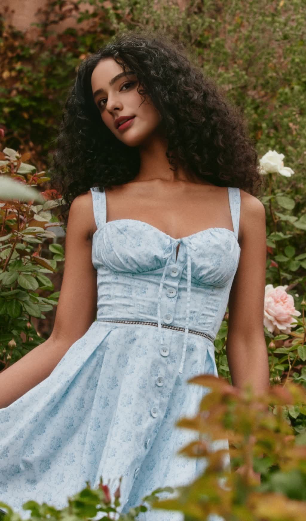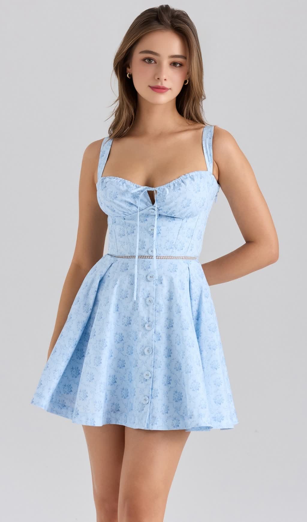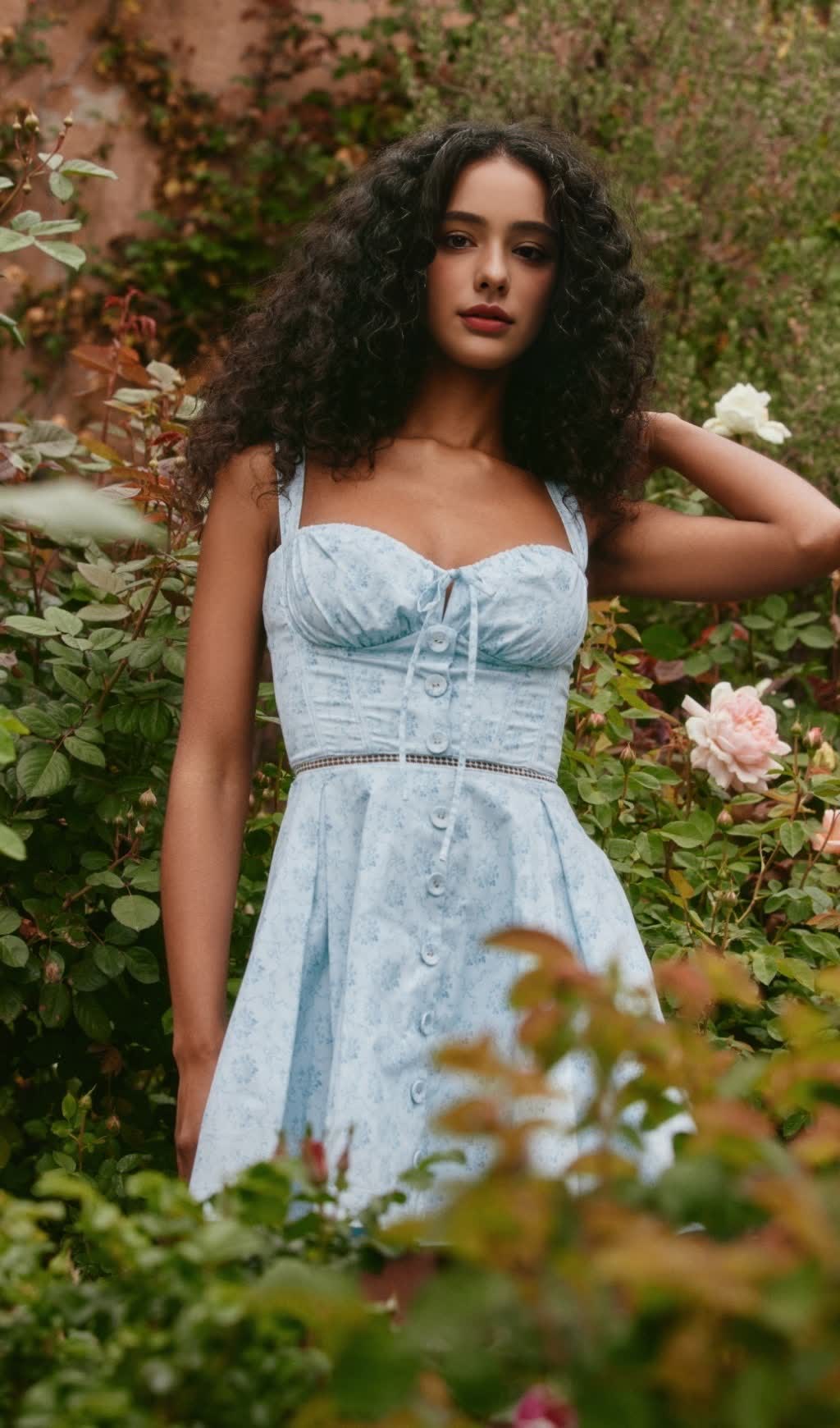 The stretch cotton fabric is used to outline the sweet mini skirt, and the skirt is embellished with delicate and charming floral patterns, as if wearing a spring garden. The cup-style upper body design is clever, and the drawstring ties and delicate buttons are arranged from the chest along the front body, which not only outlines the beautiful lines of the chest, but also adds a bit of retro and playful charm.