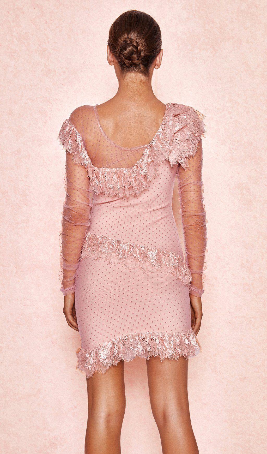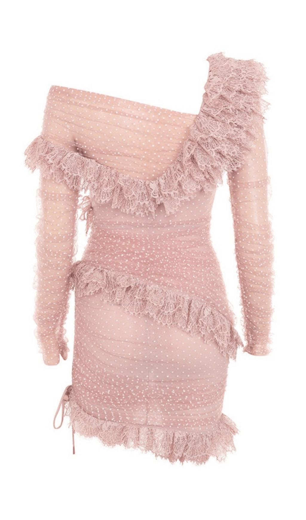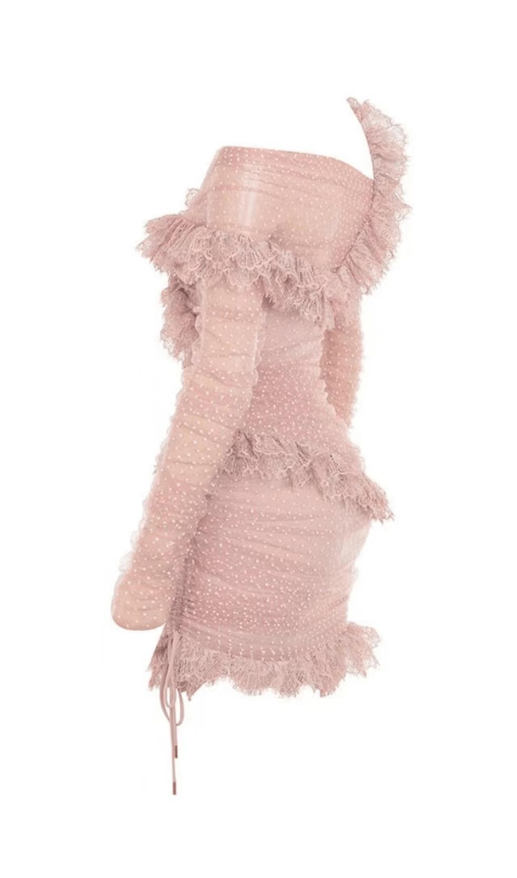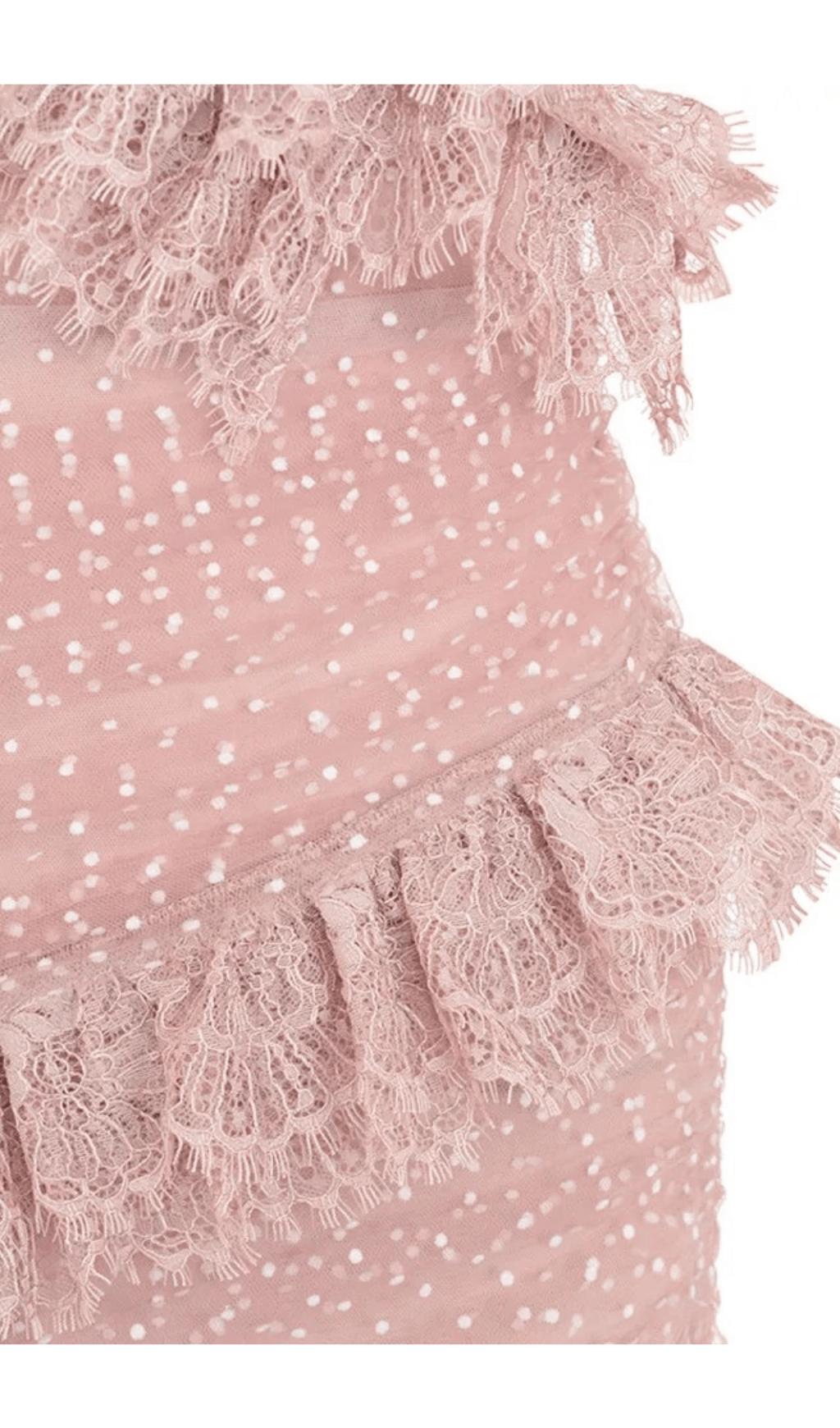 Introducing our Blush Lace Frill Mini Dress, a stunning combination of lace and frills that will make you stand out in any crowd. Made from a soft semi-sheer and stretchy dotted chiffon and lace, this dress is as comfortable as it is beautiful.