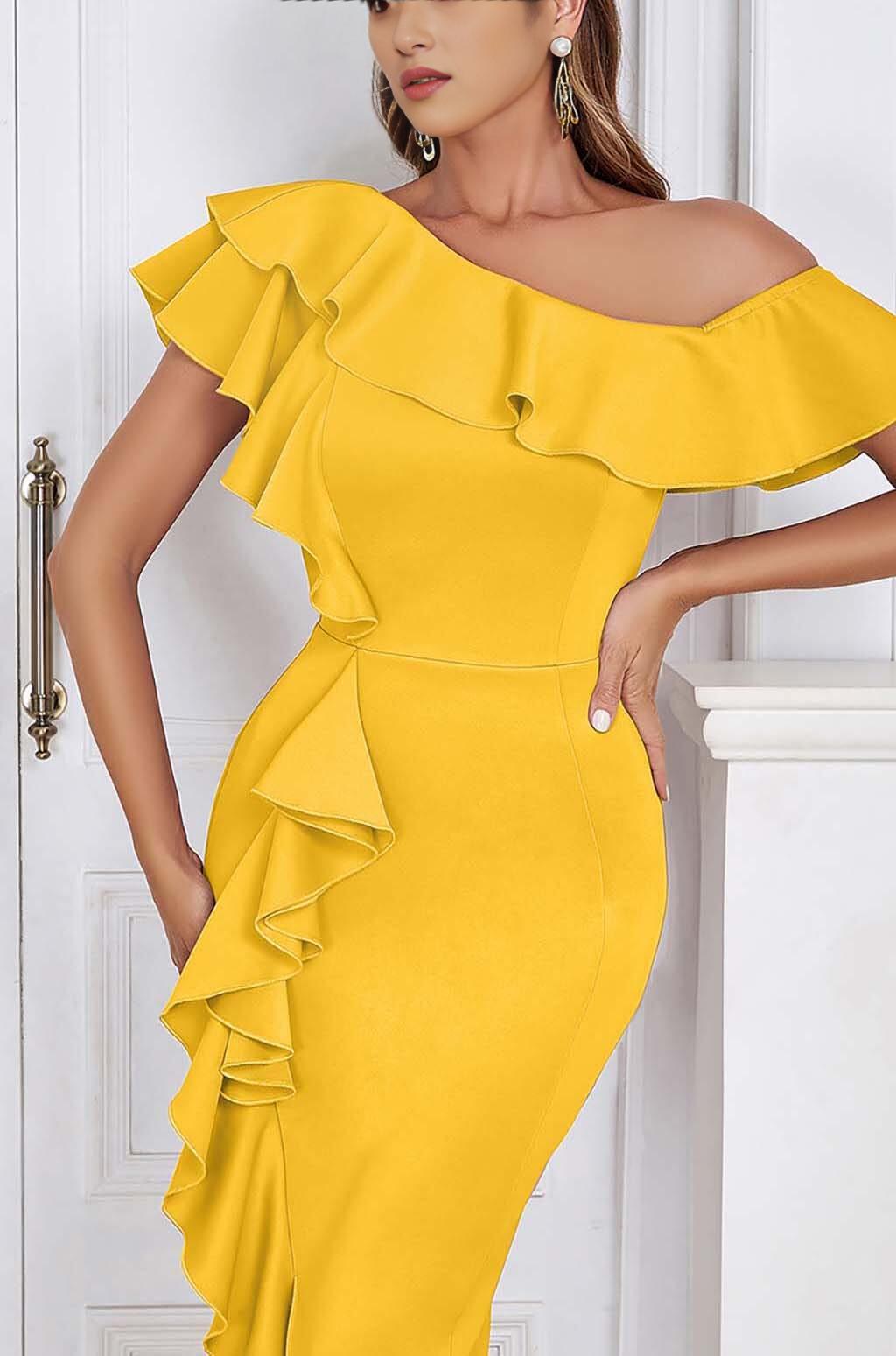 Elevate your style with this stunning Bodycon Ruffle Midi Dress in Apricot. With its sophisticated design and flirty details, this dress is perfect for any occasion. Whether you're attending a cocktail party, a wedding, or a special date night, this dress will make you feel confident and bold.