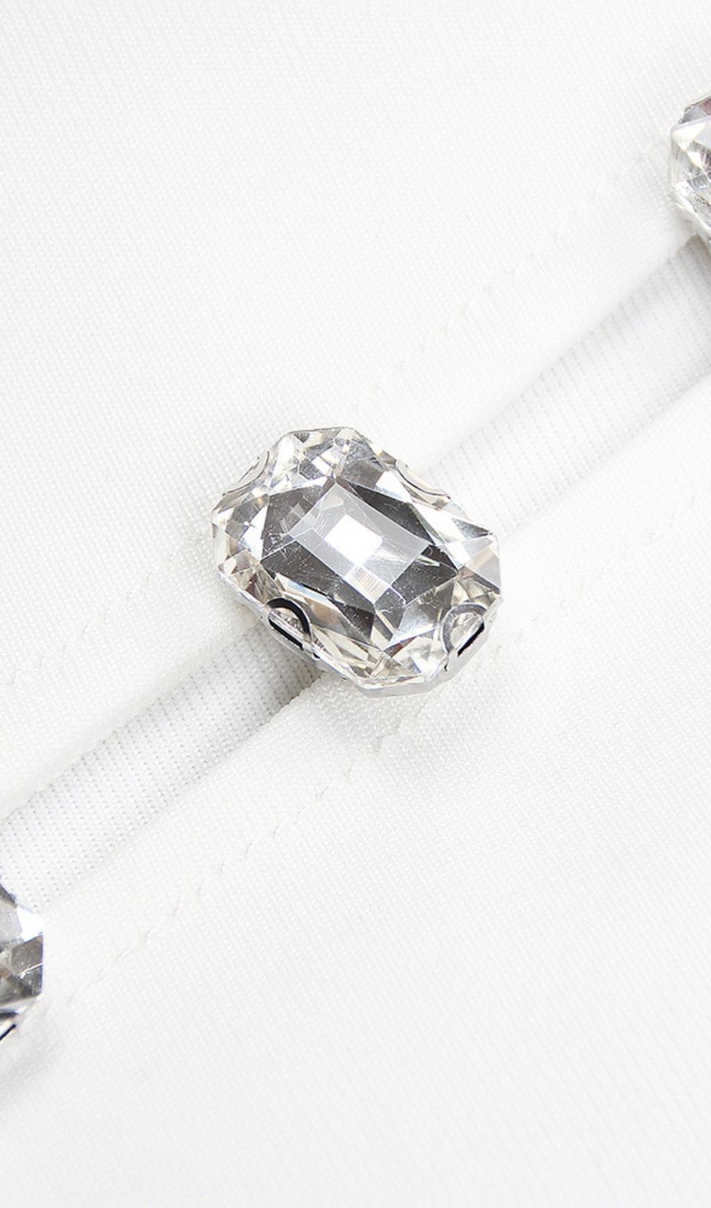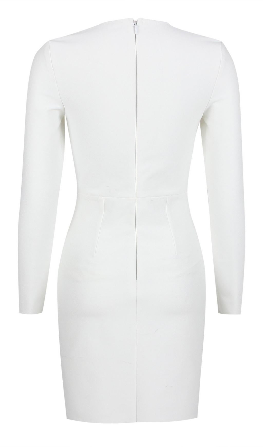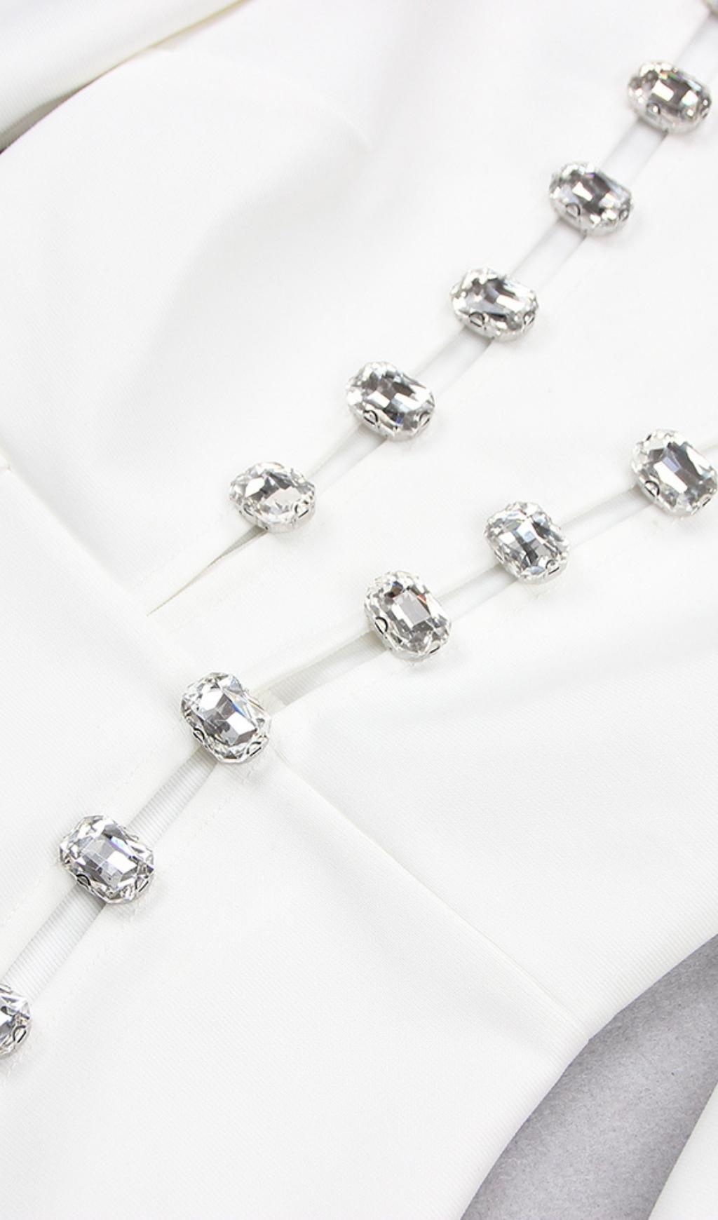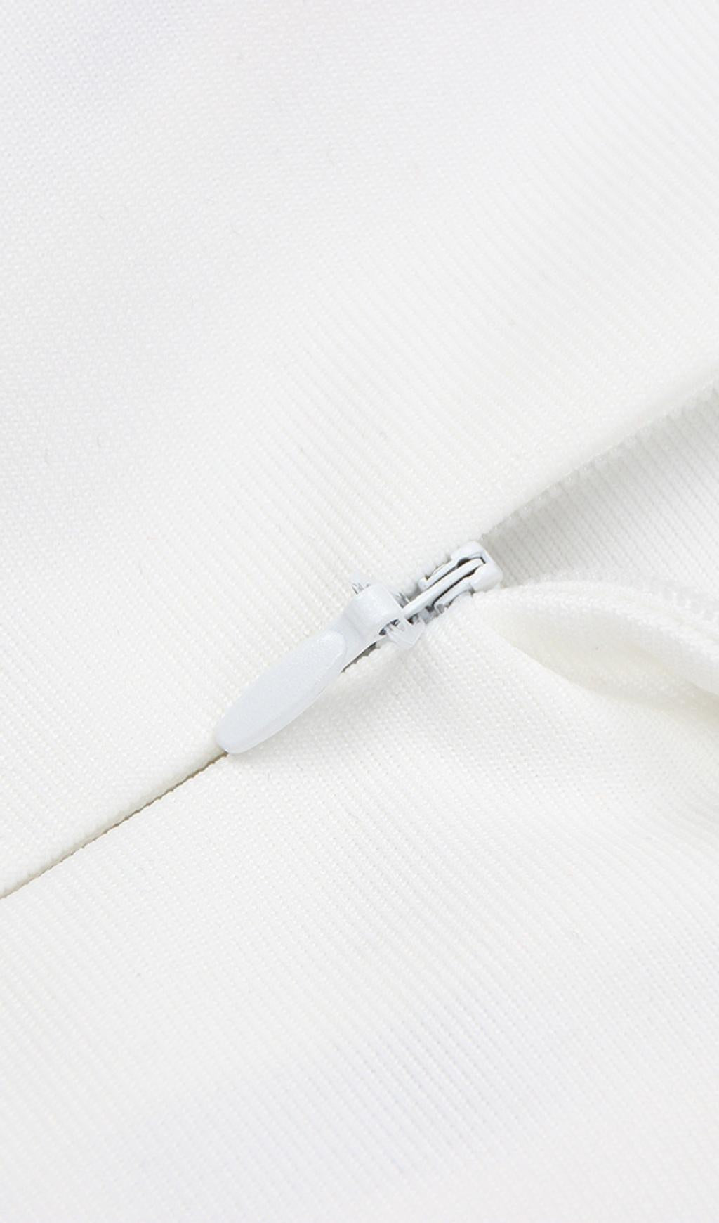 Turn heads and exude sultry femininity with our Bodycon Split Dress in White. This dress is a must-have for those who want to make a statement and embrace their confidence. Featuring sparkling diamond embellishments along the neckline and under the bust, as well as an incredible corset that cinches the waist, this dress is designed to accentuate your curves and make you feel like a star.
