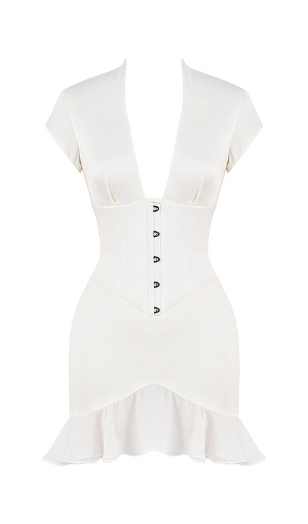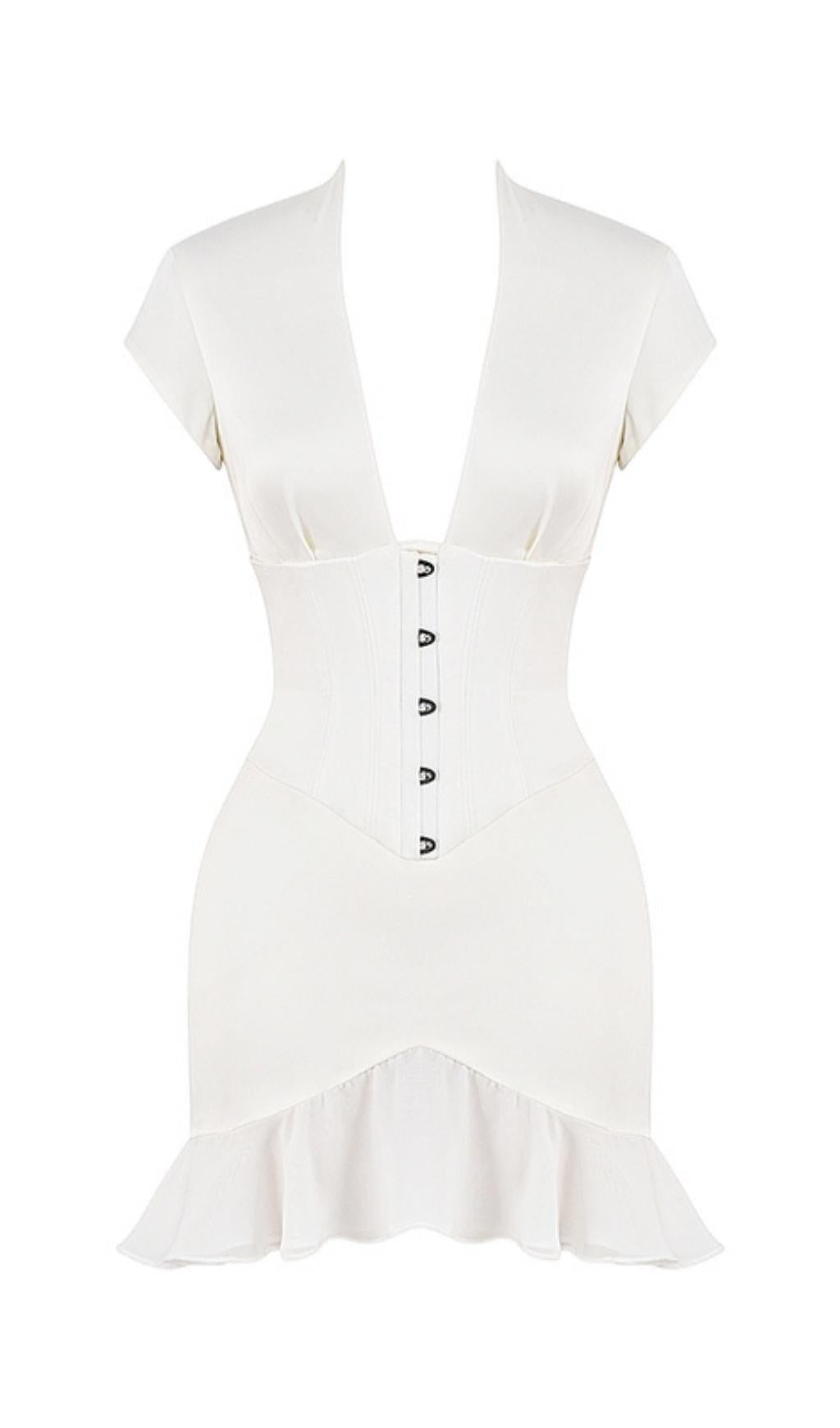 Elevate your wardrobe with our Bodycon V Neck Mini Dress in White. Its corset frame, fitted lines, and pleated hem make it stand out from the crowd. Shop now and experience the perfect blend of style and comfort.