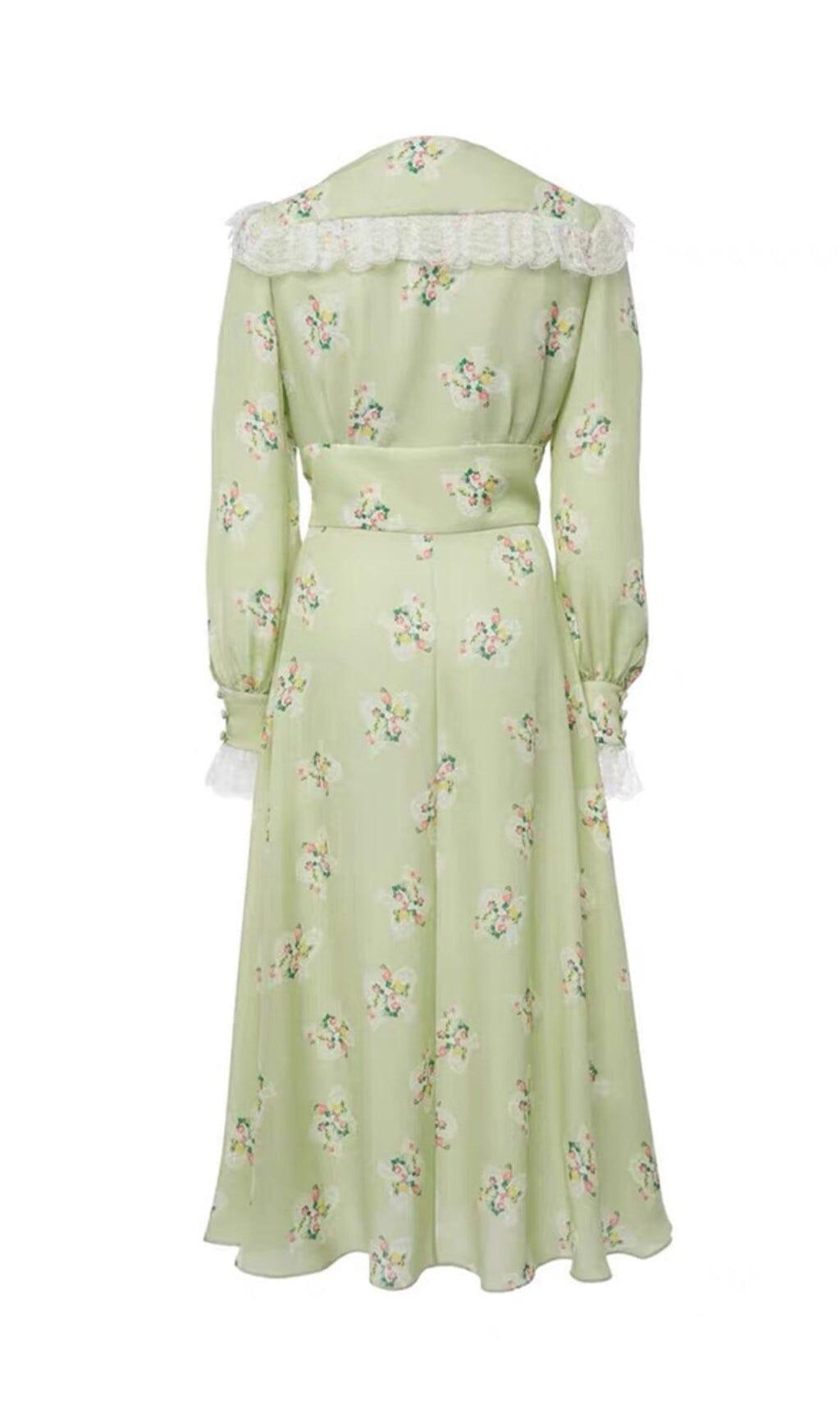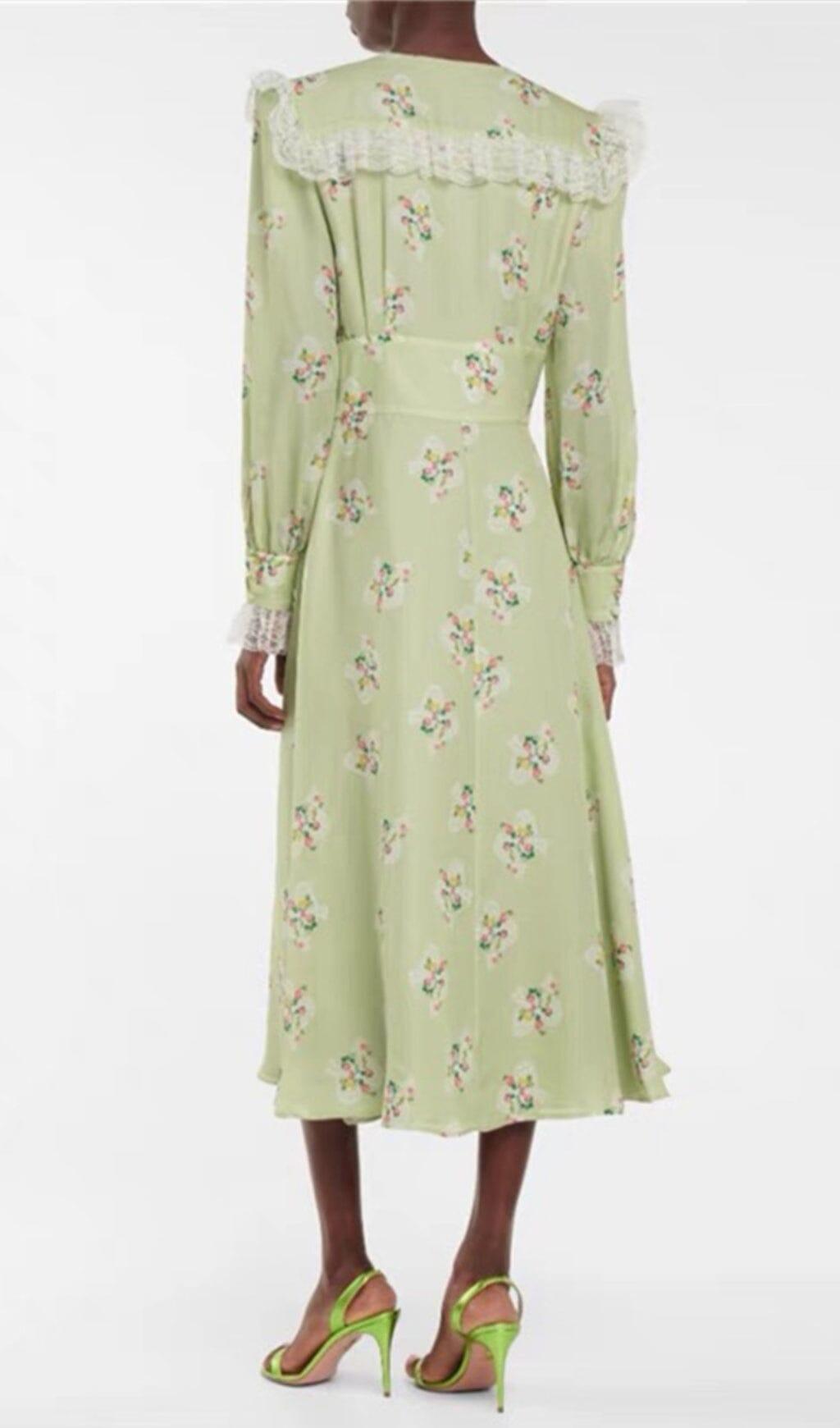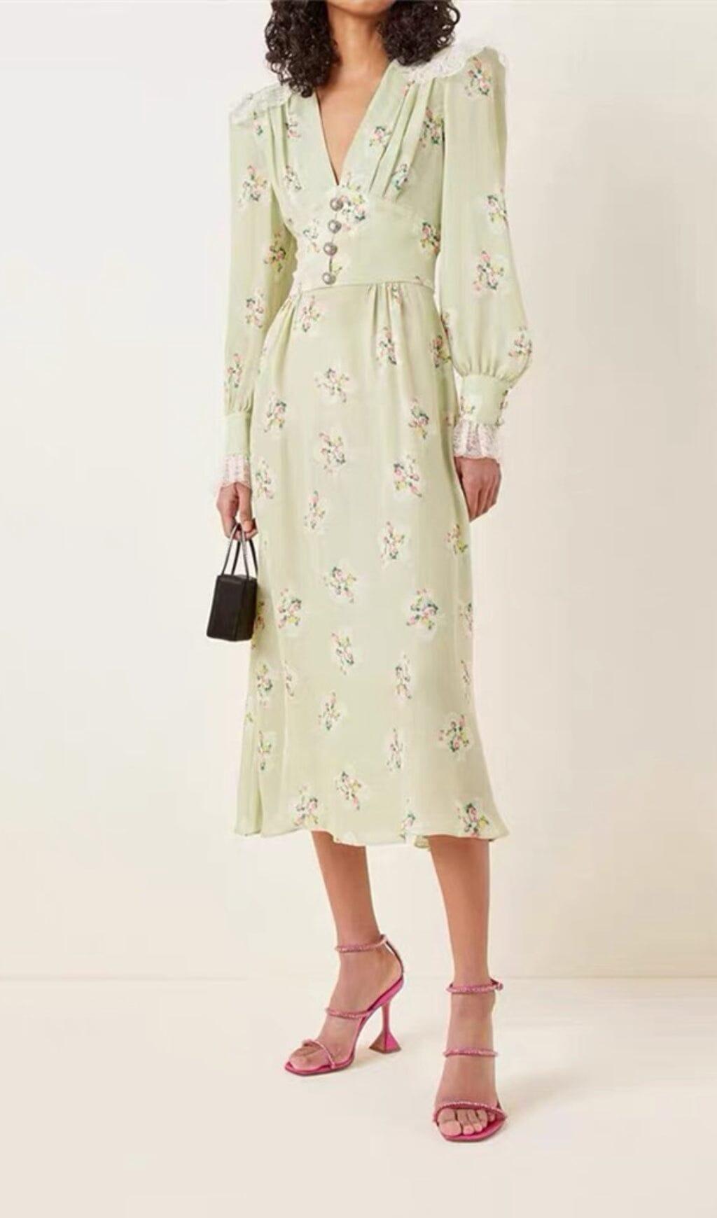 LIGHT GREEN V NECK FLORAL SILK MIDI DRESS