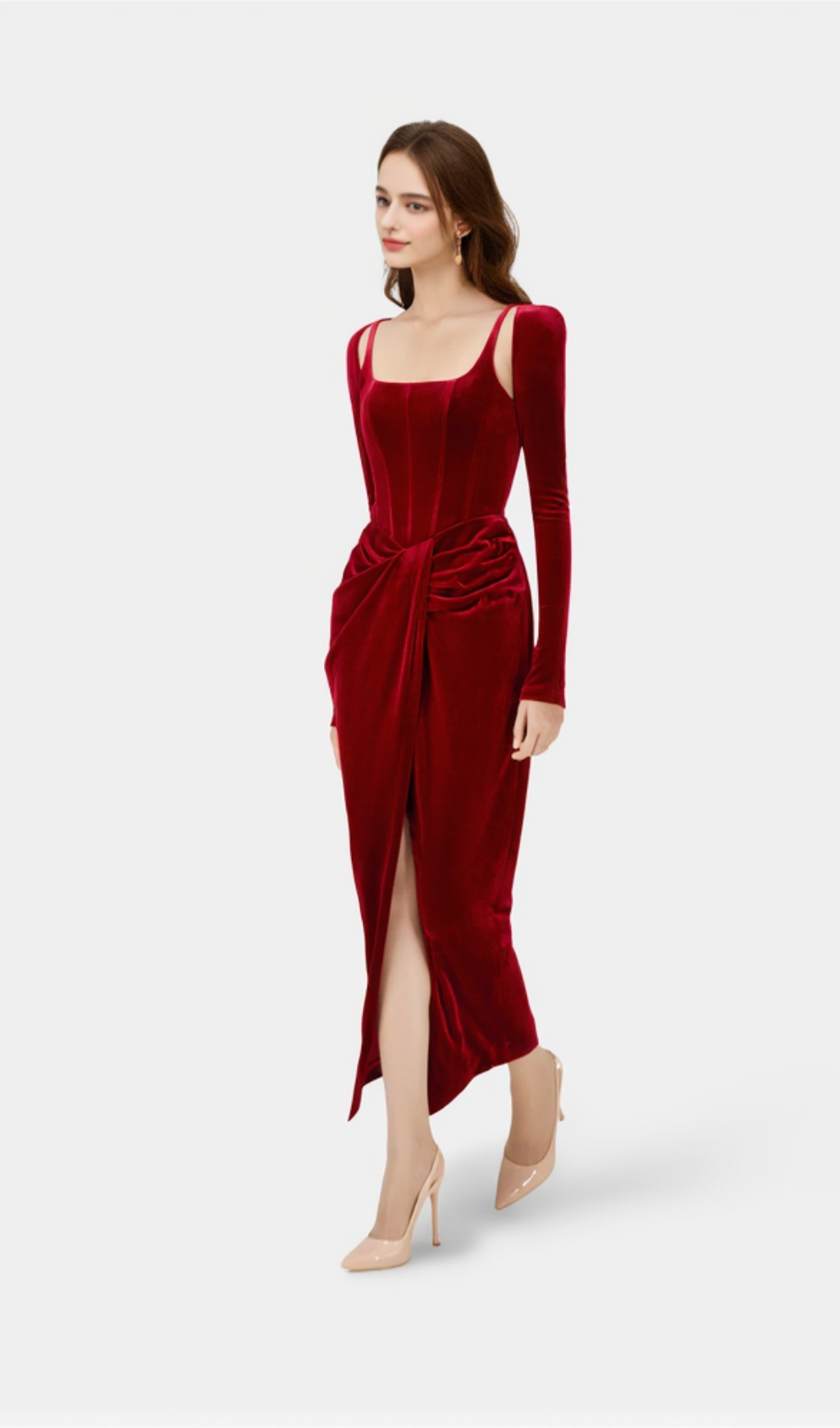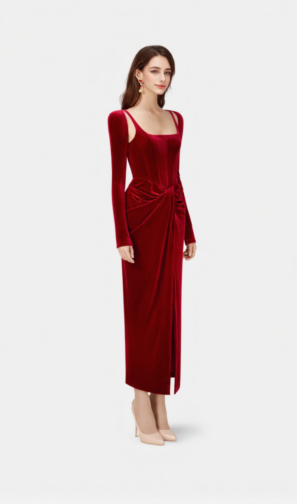 Expertly crafted with rich Bordeaux velvet, this midi dress exudes elegance and sophistication. The draped design flatters all body types, while the luxurious fabric adds a touch of opulence. Perfect for special occasions or a night out, this dress is a timeless addition to any wardrobe.