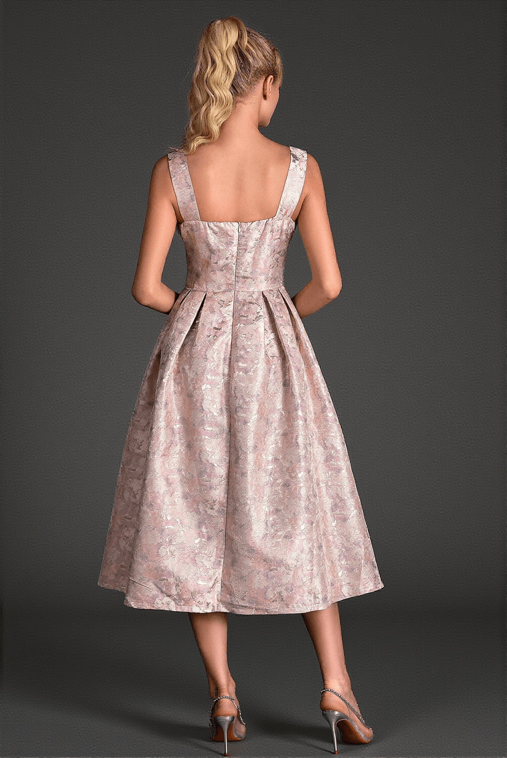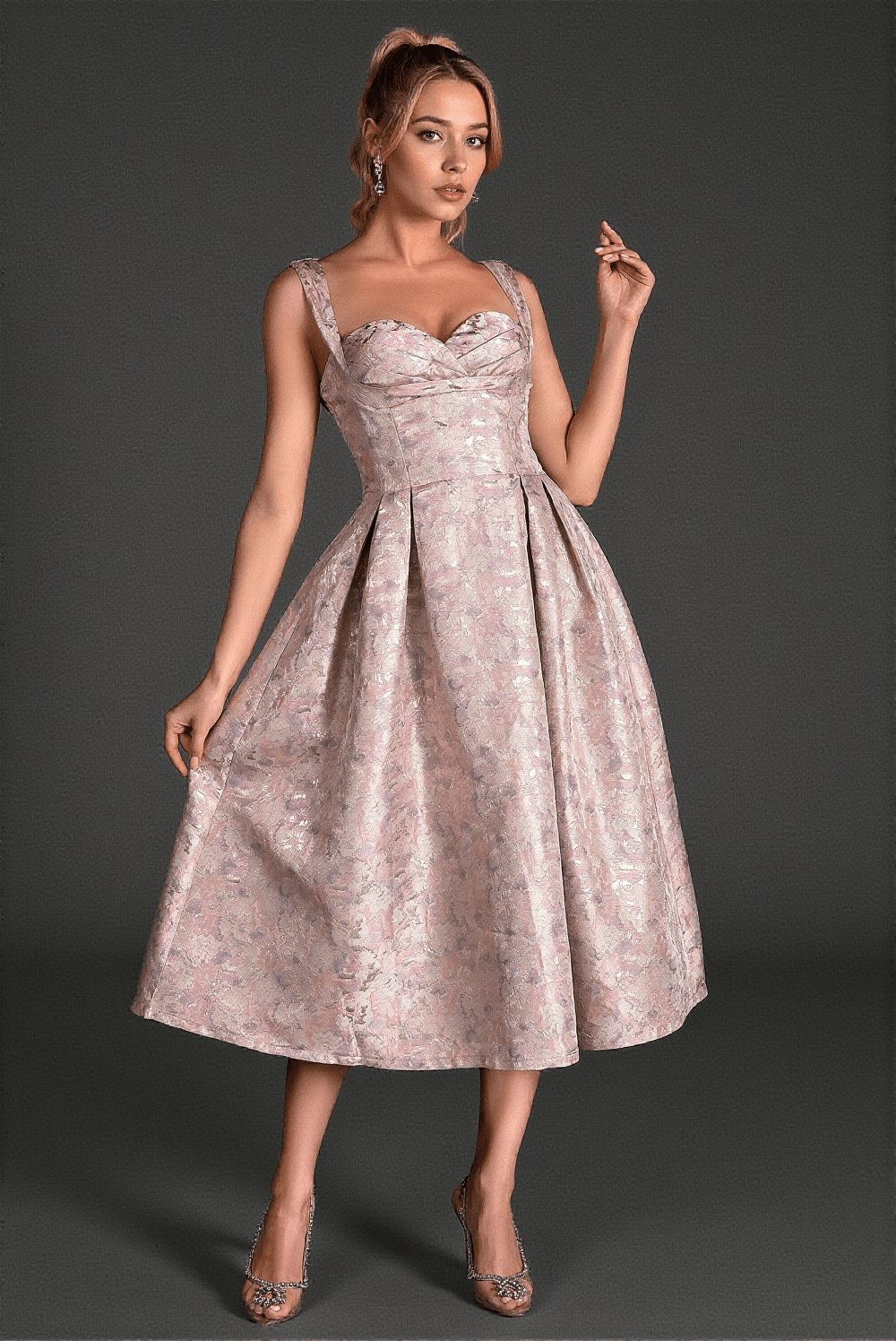 The Boulilis Strap Woven Midi Dress exudes elegance and sophistication, perfect for garden parties, weddings, or any elegant evening event. Crafted from luxurious materials, this dress features delicate straps that beautifully accentuate the shoulders, while its intricate jacquard weave adds a touch of texture and glamour.