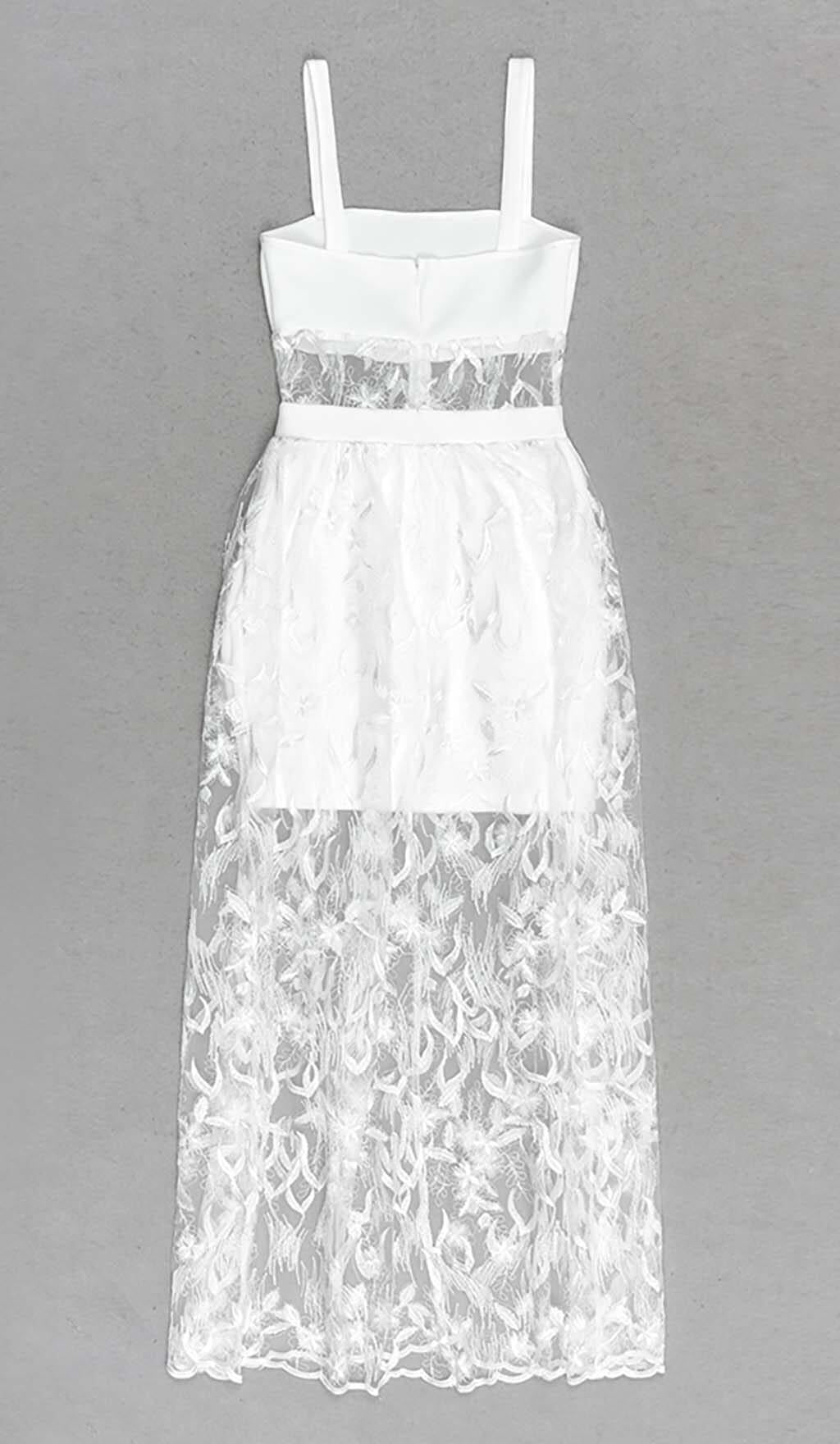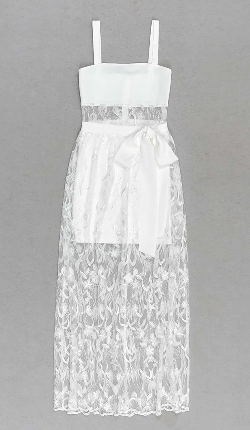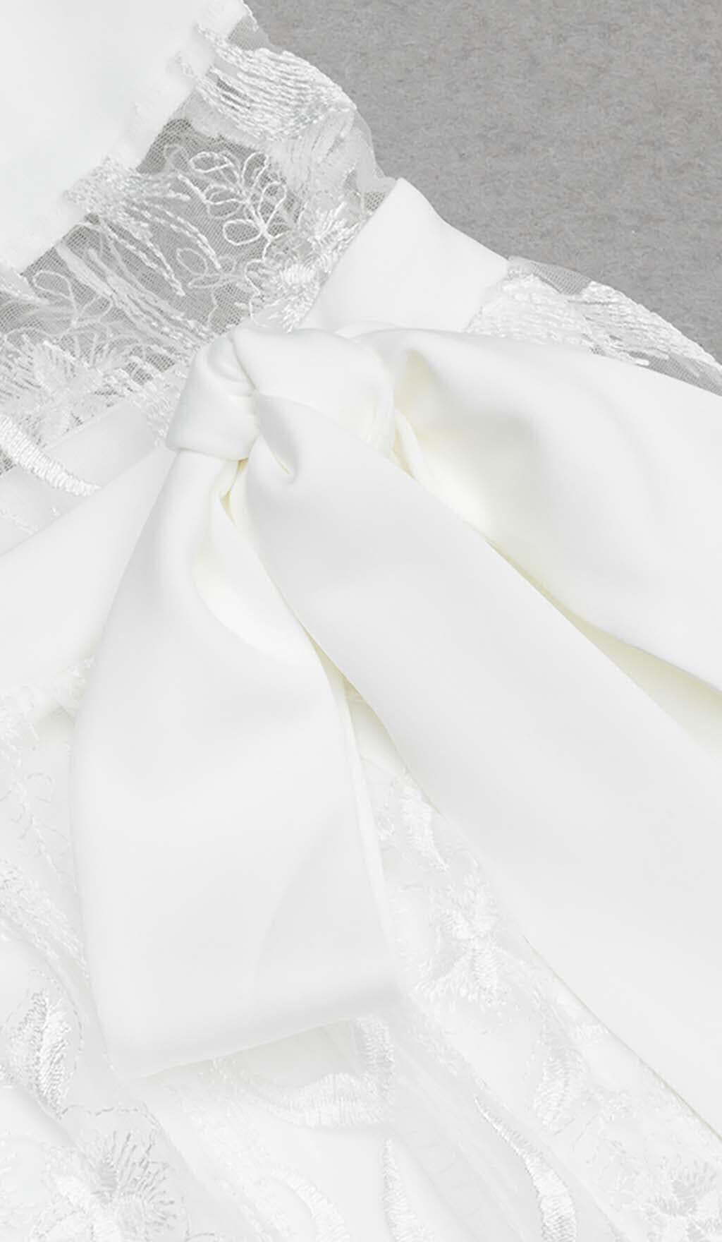 BOW-EMBELLISHED LACE MIDI DRESS IN WHITE