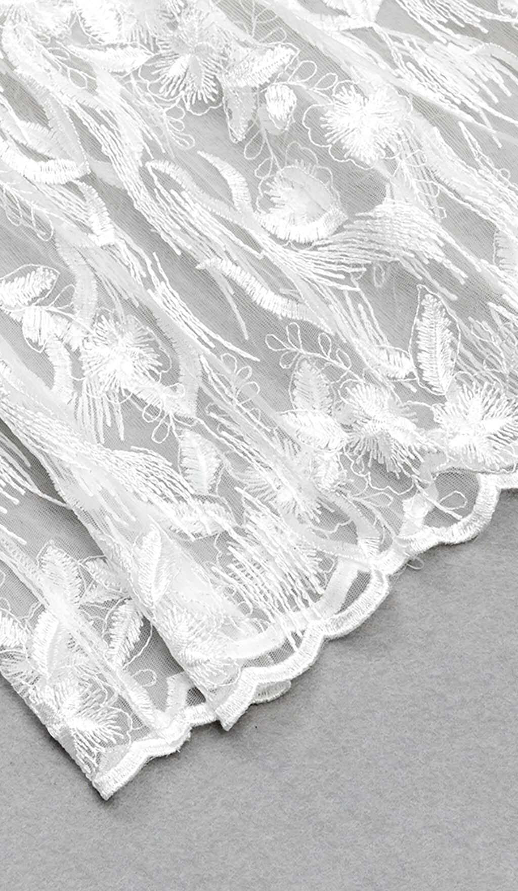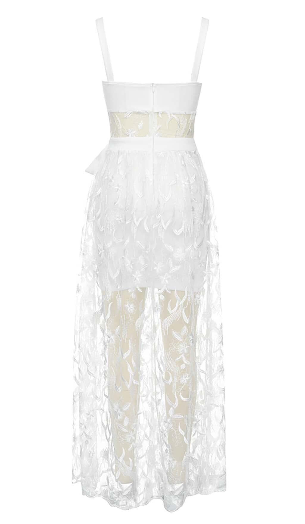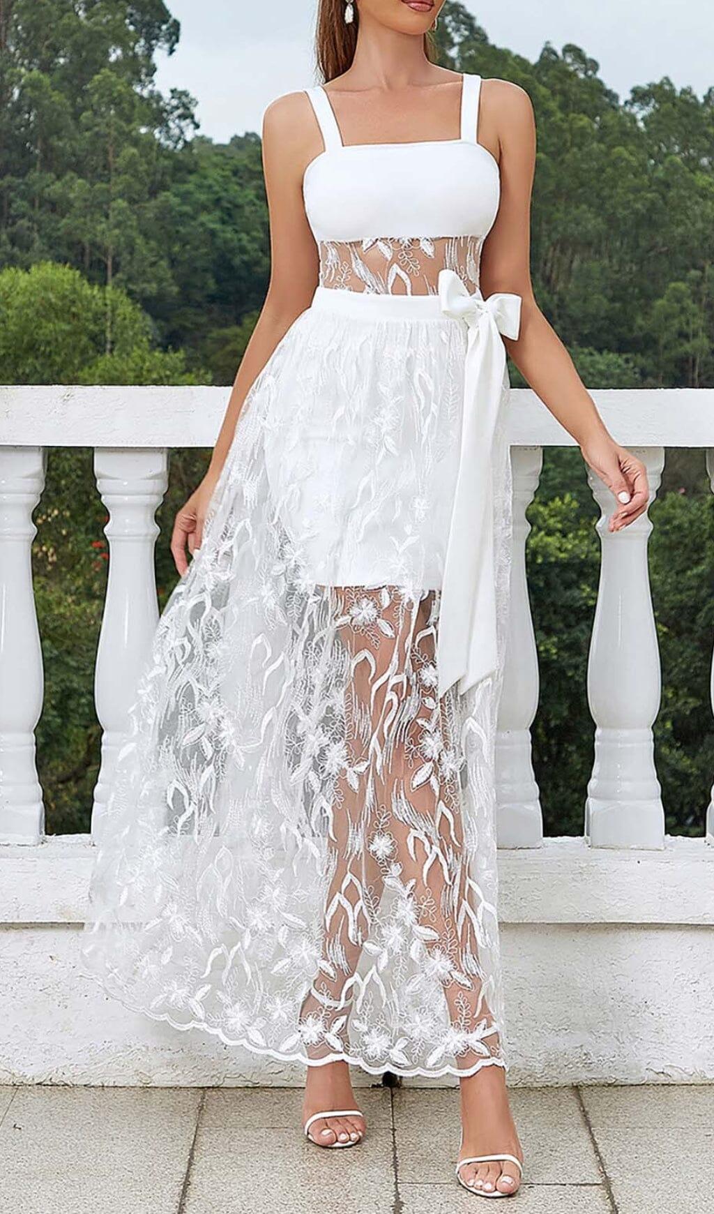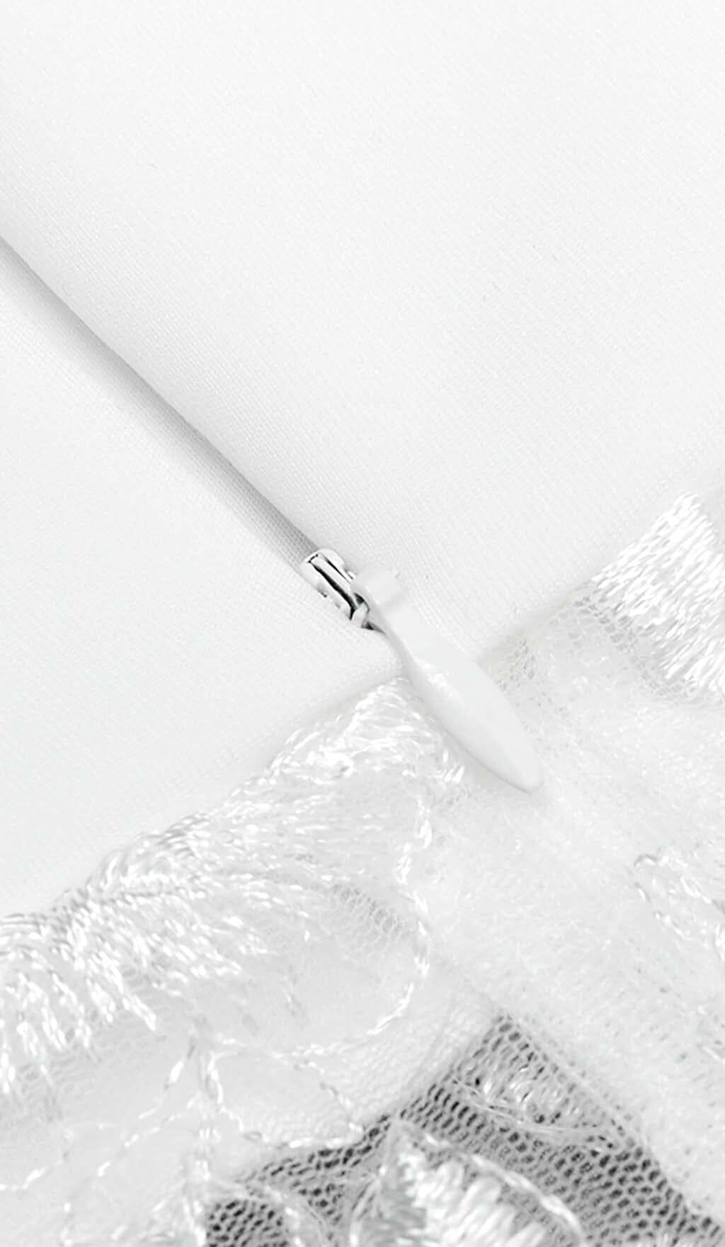 BOW-EMBELLISHED LACE MIDI DRESS IN WHITE