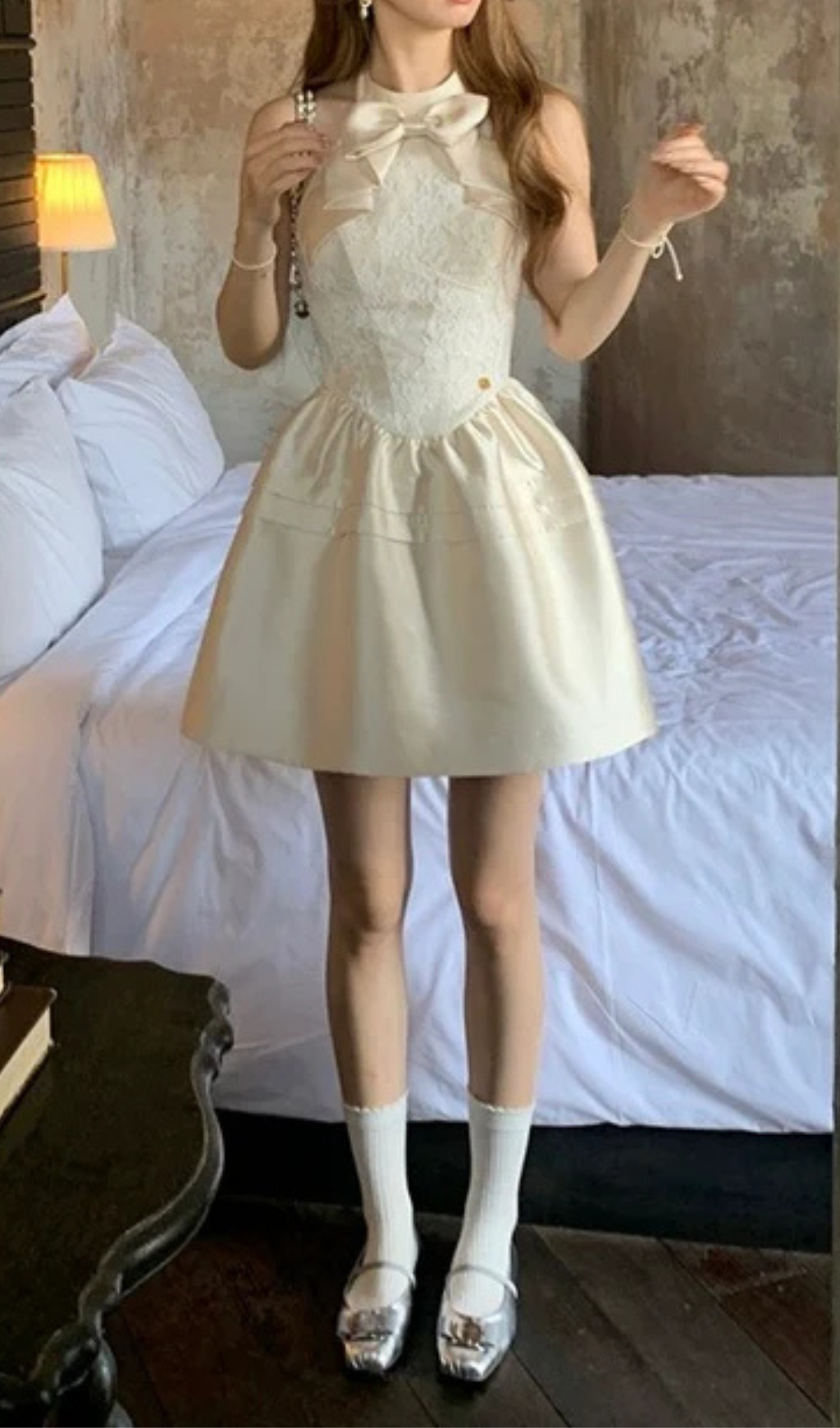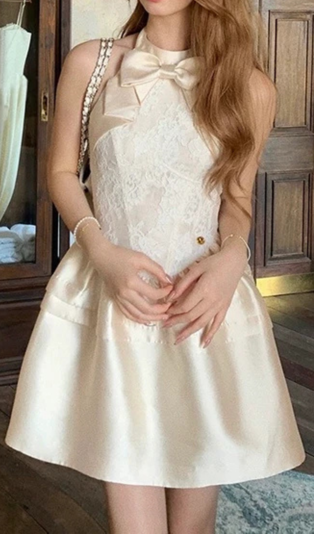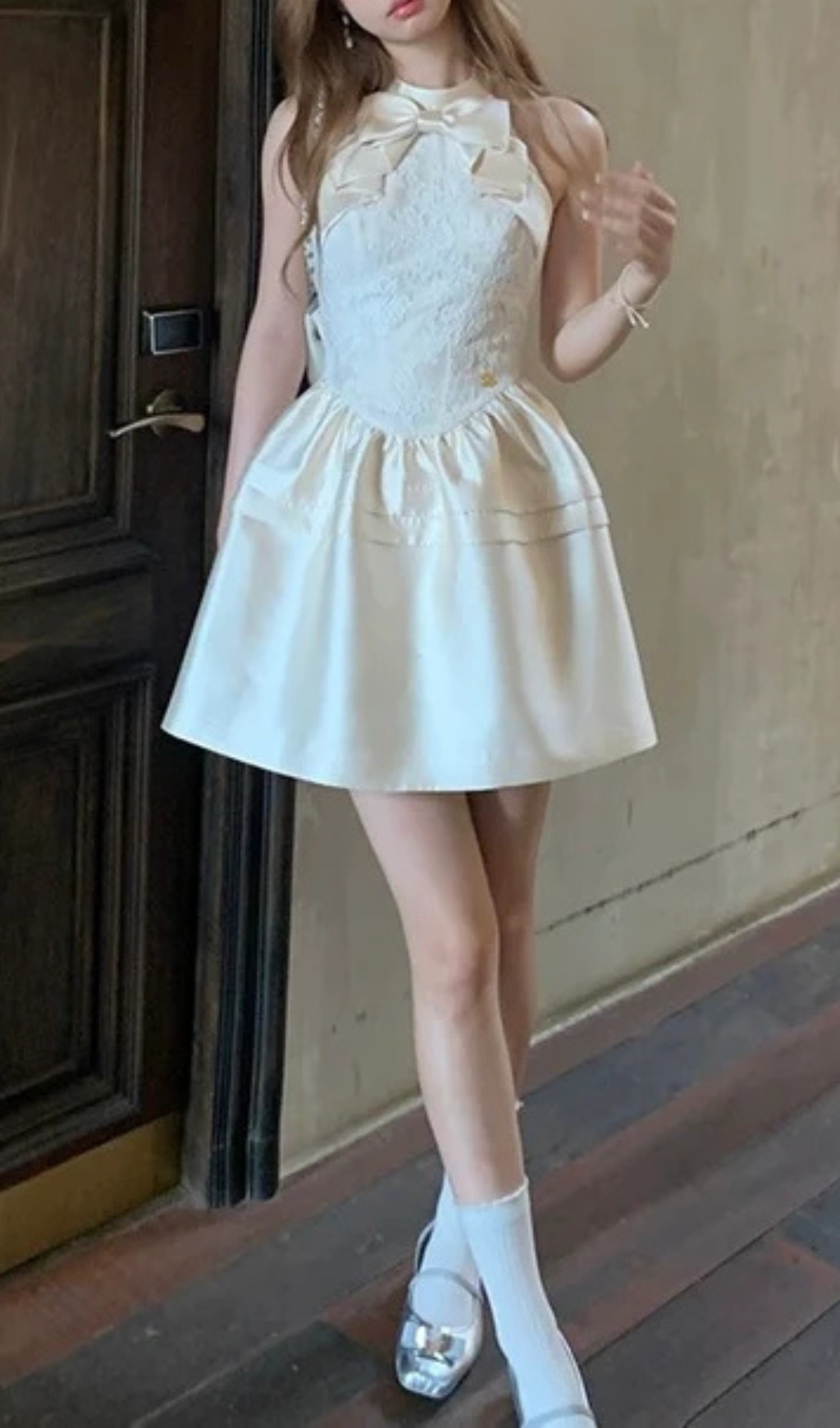 BOW EMBELLISHED LACE PATCHWORK MINI DRESS