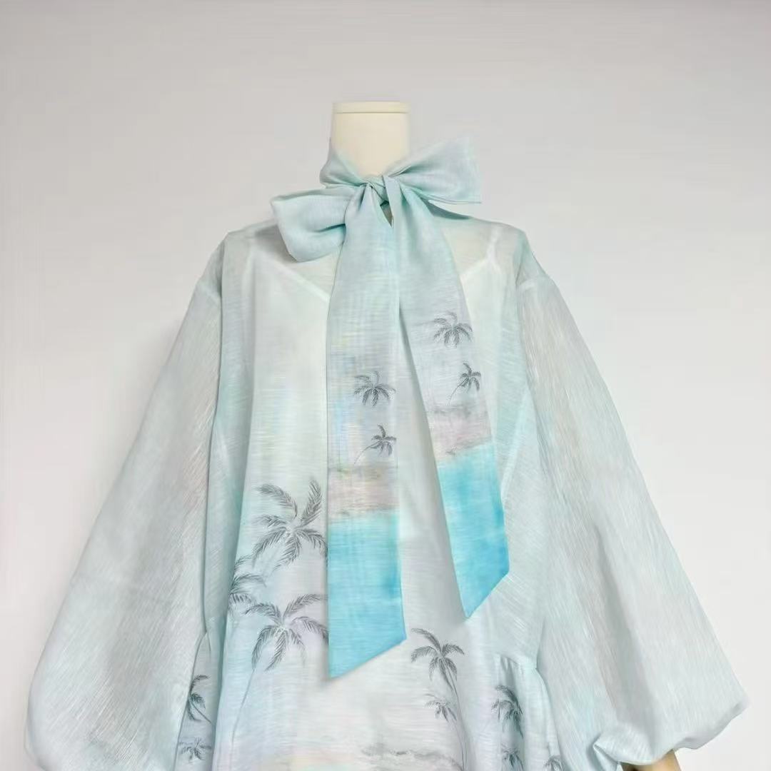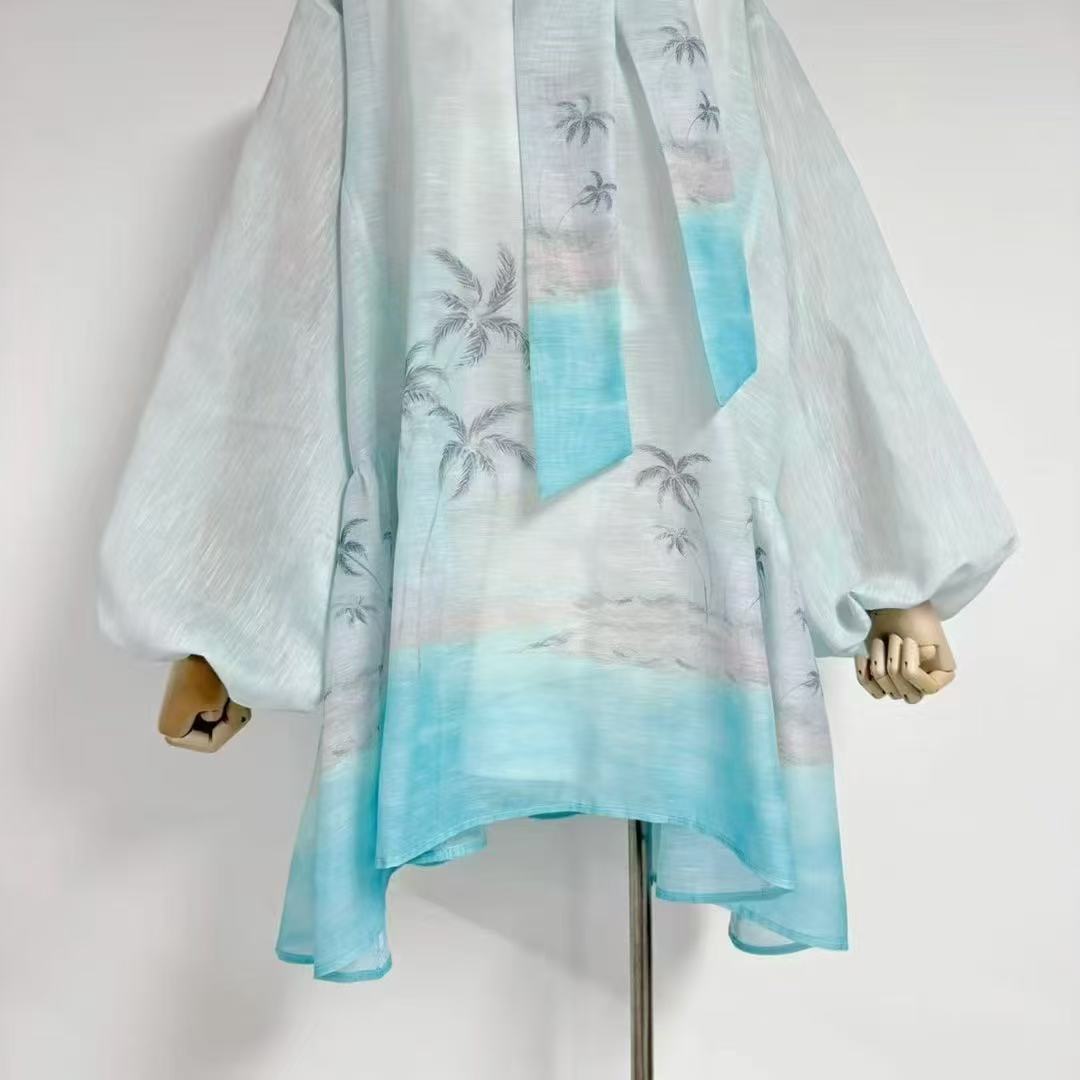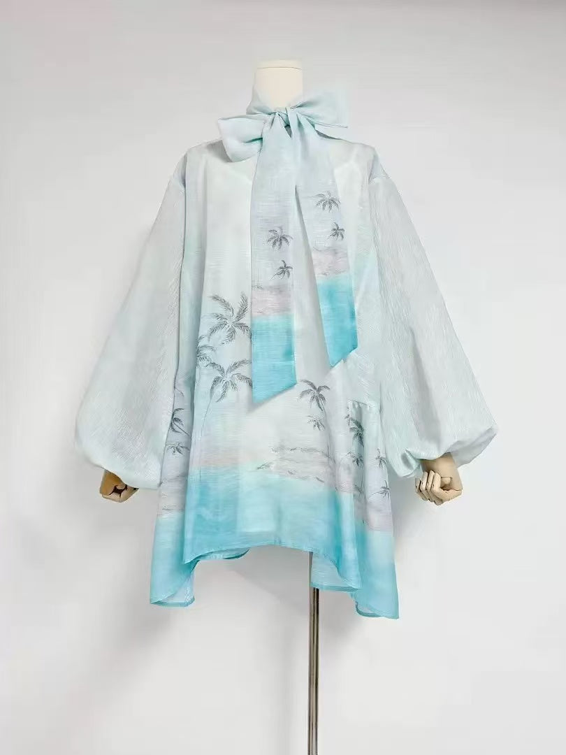 Bow tie neck irregular skirt lantern sleeves coconut tree print dress