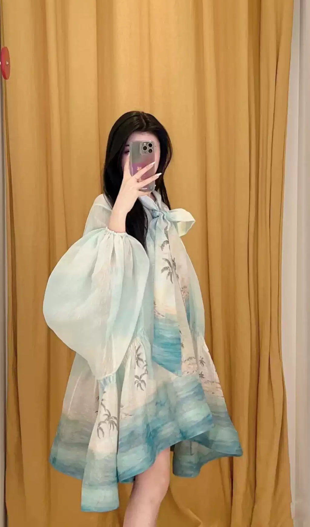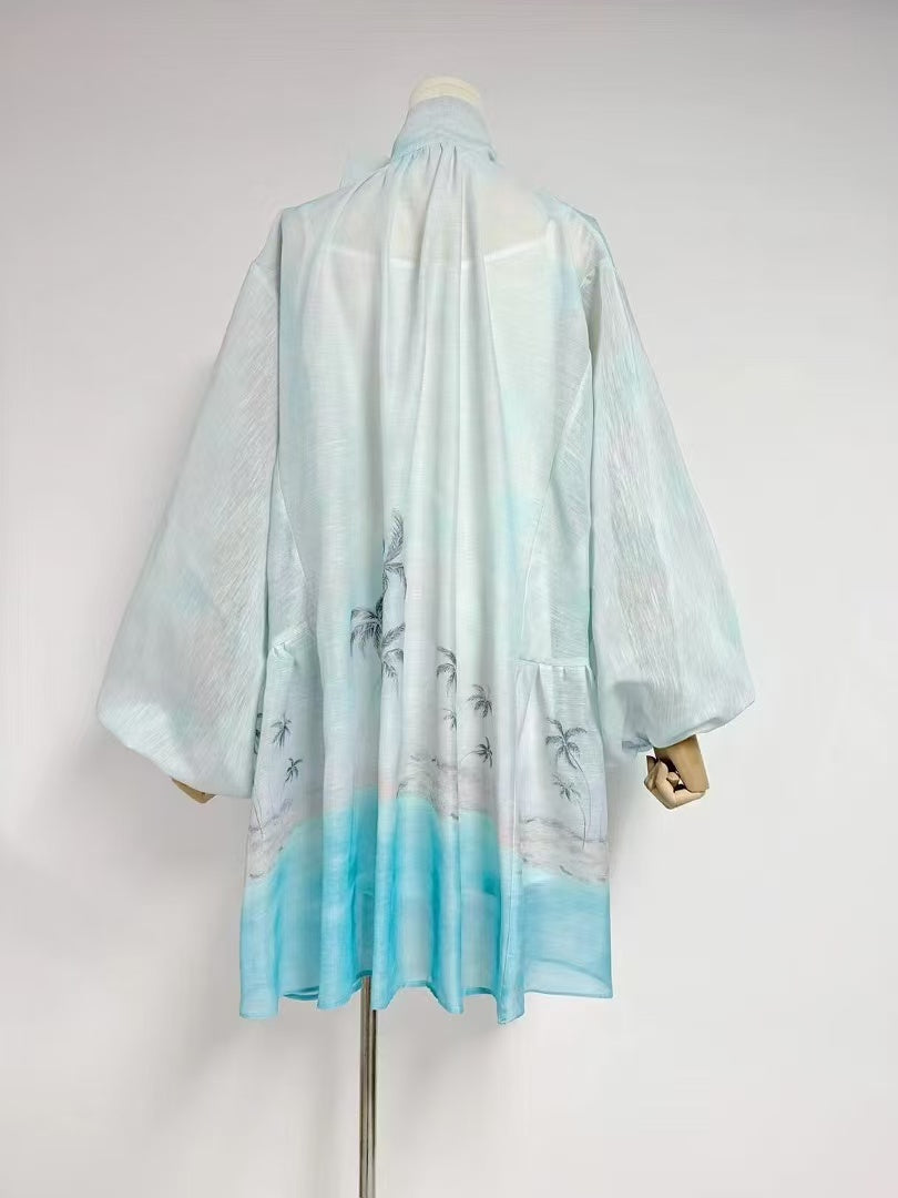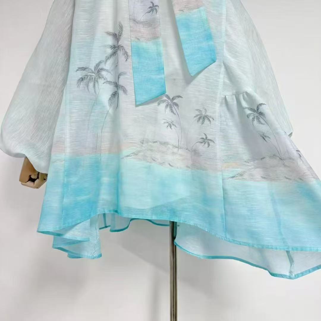 Bow tie neck irregular skirt lantern sleeves coconut tree print dress