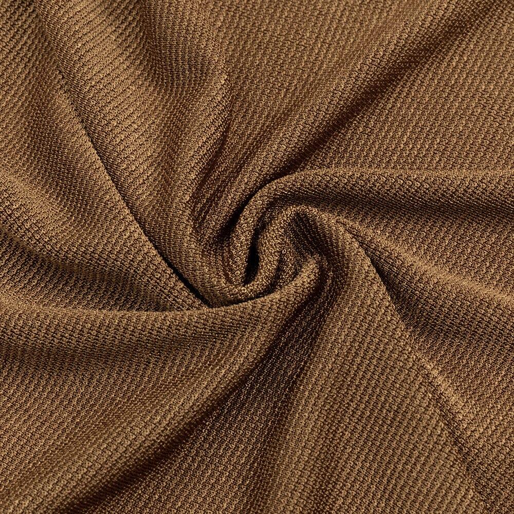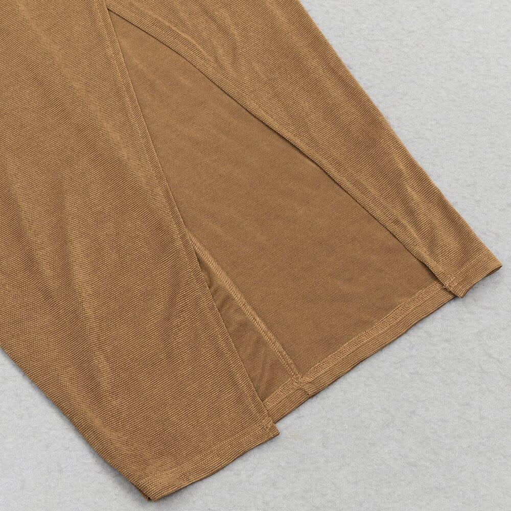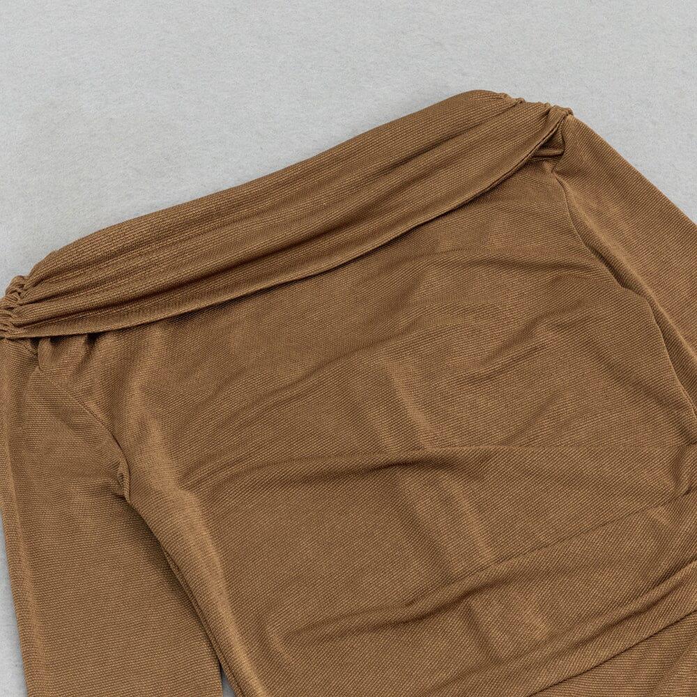 Experience the thrill of taking fashion risks with our Brown Ruffled Slit Shoulder Waist Maxi Dress! The striking slit shoulder and waist ruffles add a daring touch to this dress, perfect for the bold and adventurous. Make a statement and stand out with this unique and stylish dress!