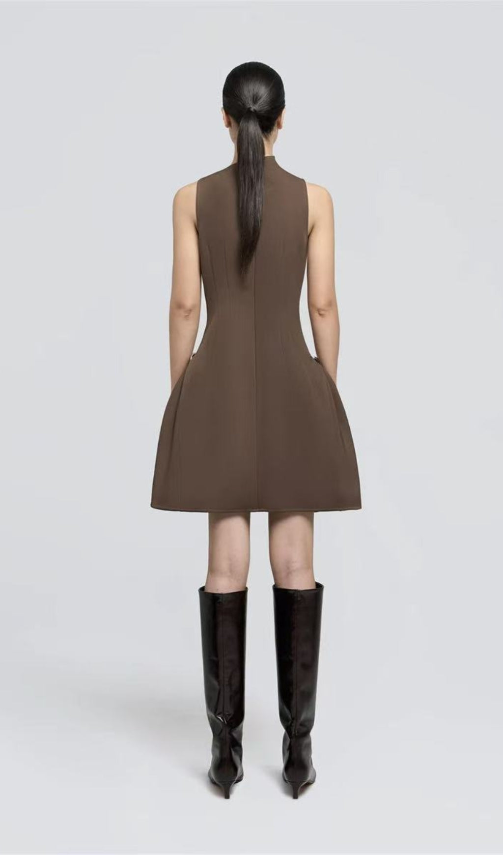 The paired long boots have a shaft height reaching near the knees. The pointed - toe design elongates the leg lines, making the legs look more slender and straight. The metallic decorations at the toe of the boots echo those at the pockets of the dress. The overall style is simple yet refined, presenting a cool and elegant fashion sense, making it suitable for various occasions in autumn and other seasons.