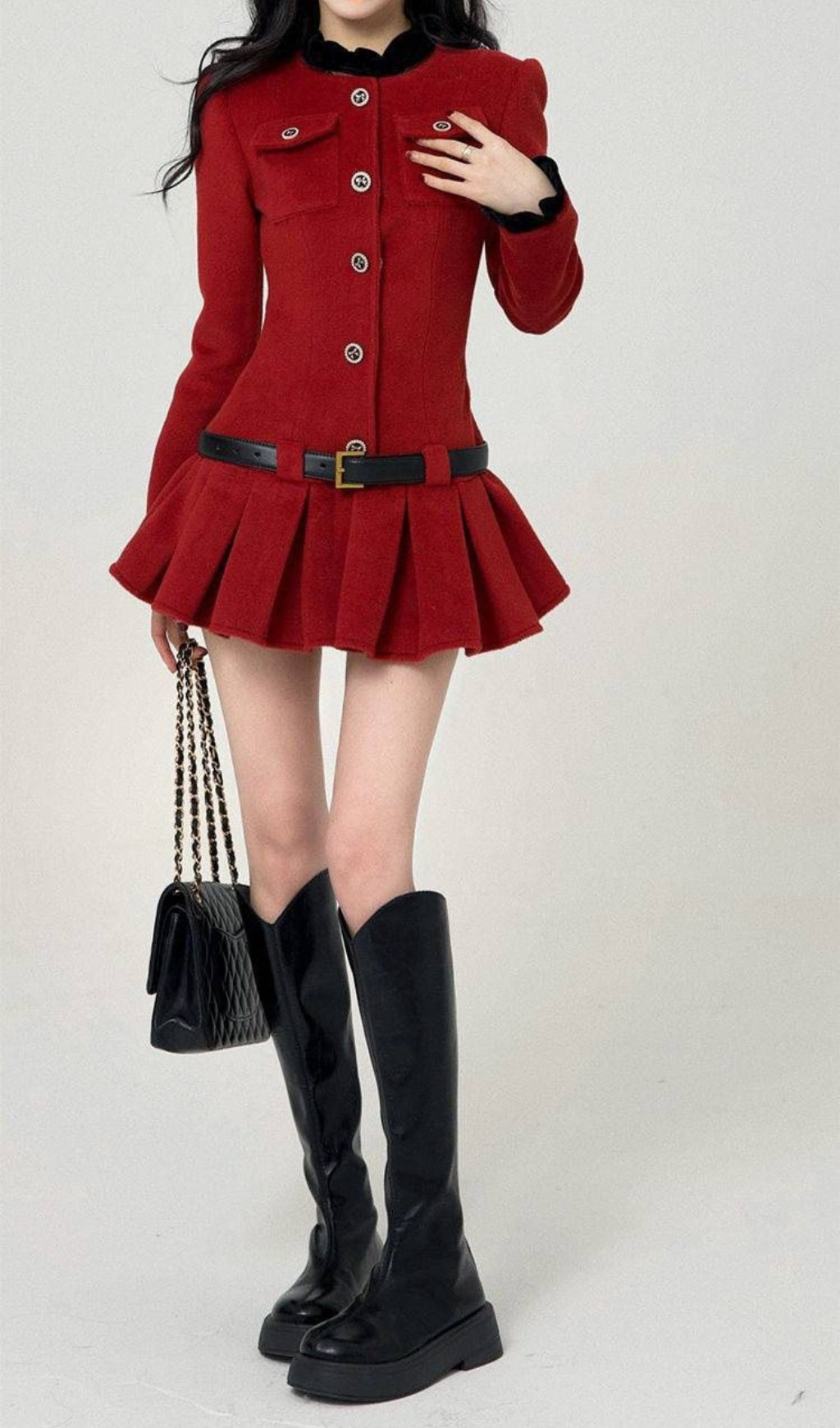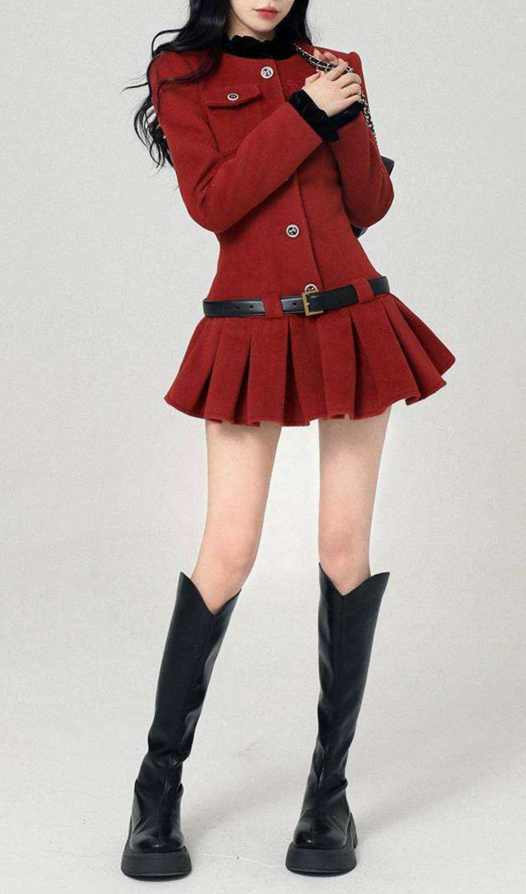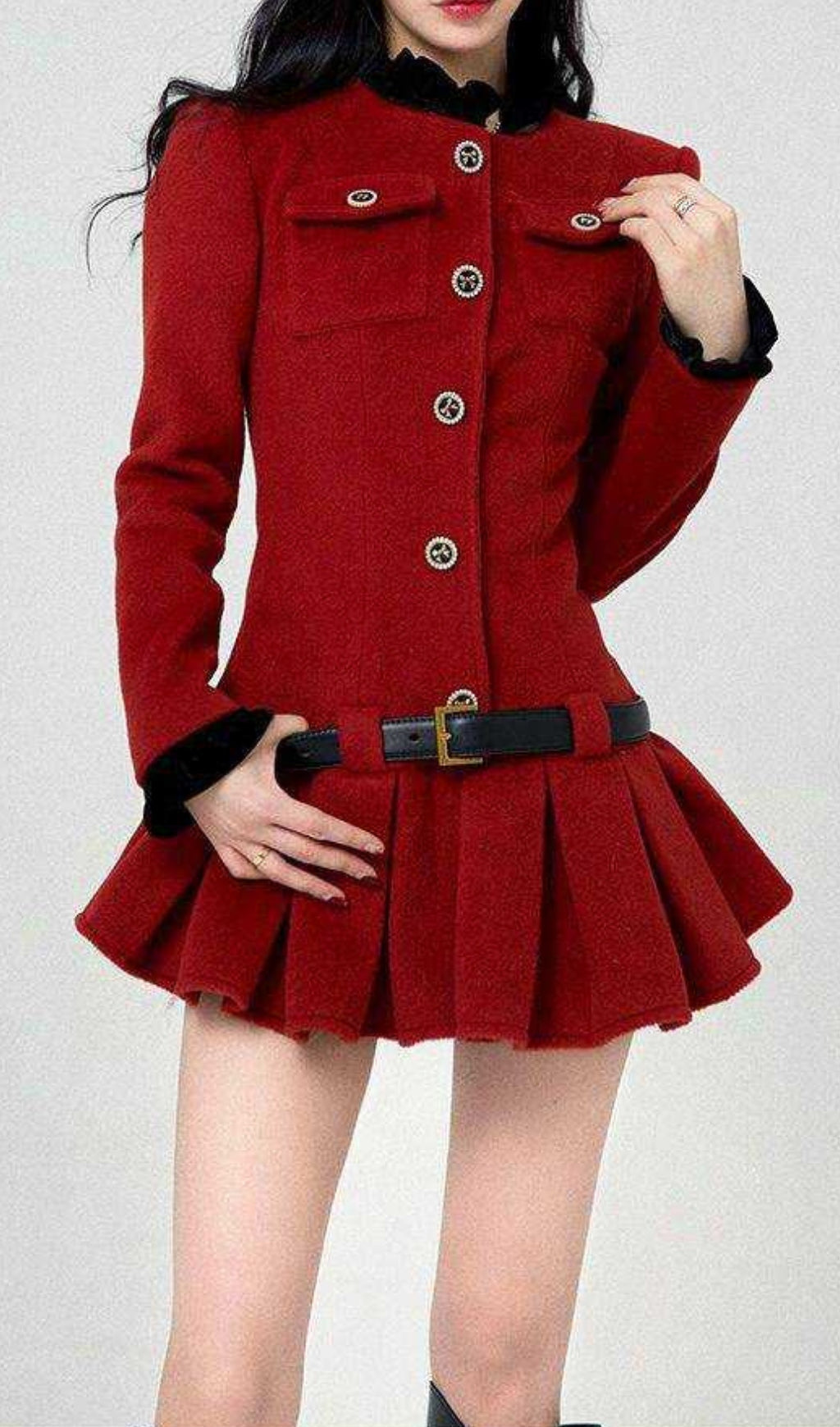 Effortlessly chic and playful, this burgundy long-sleeved dress features a unique ultra-short length with pleated detailing. Adorned with button decorations and a black sleeve collar, this dress is perfect for those looking to make a statement with their style.