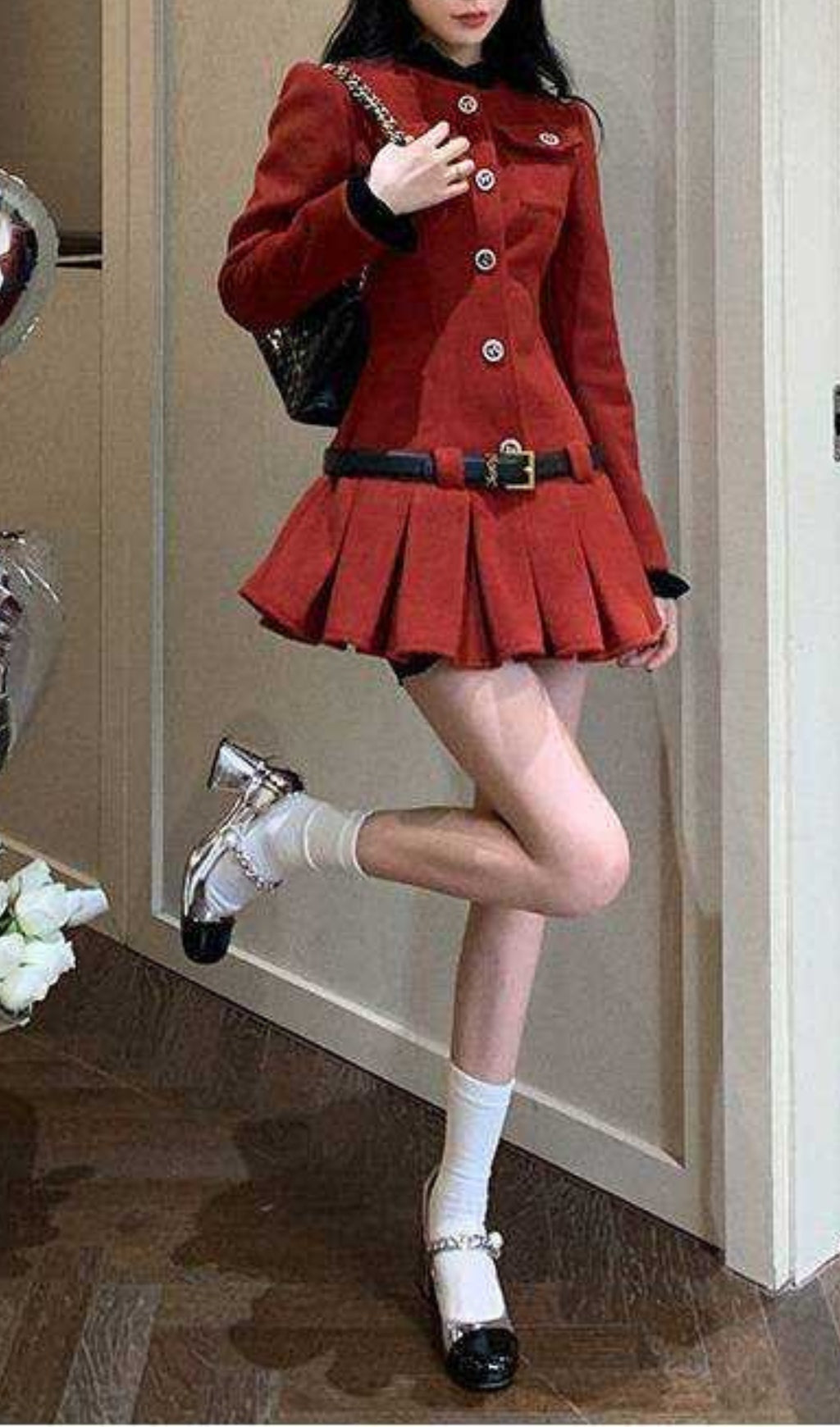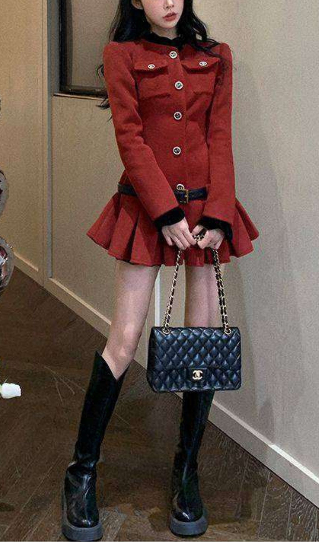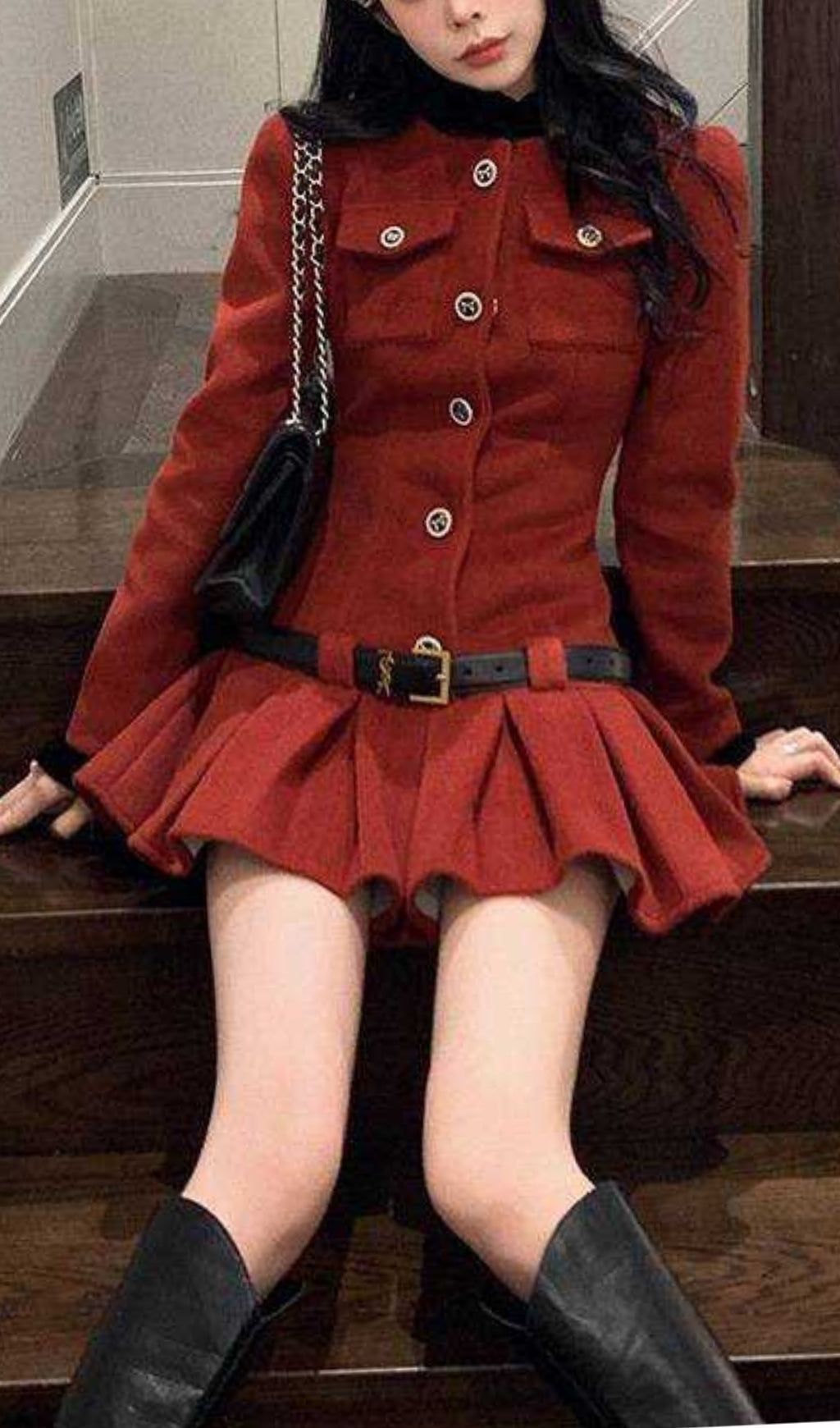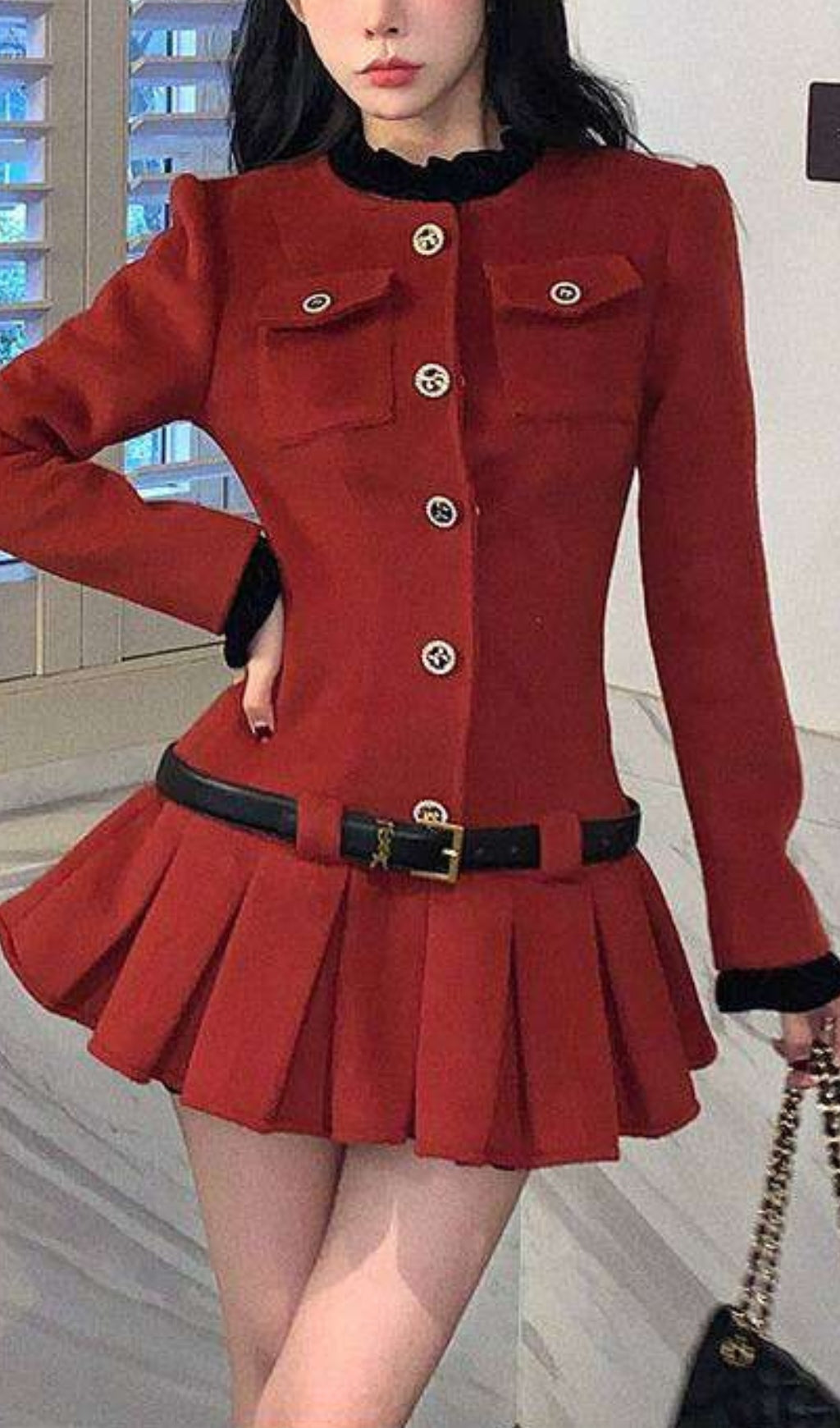 Effortlessly chic and playful, this burgundy long-sleeved dress features a unique ultra-short length with pleated detailing. Adorned with button decorations and a black sleeve collar, this dress is perfect for those looking to make a statement with their style.