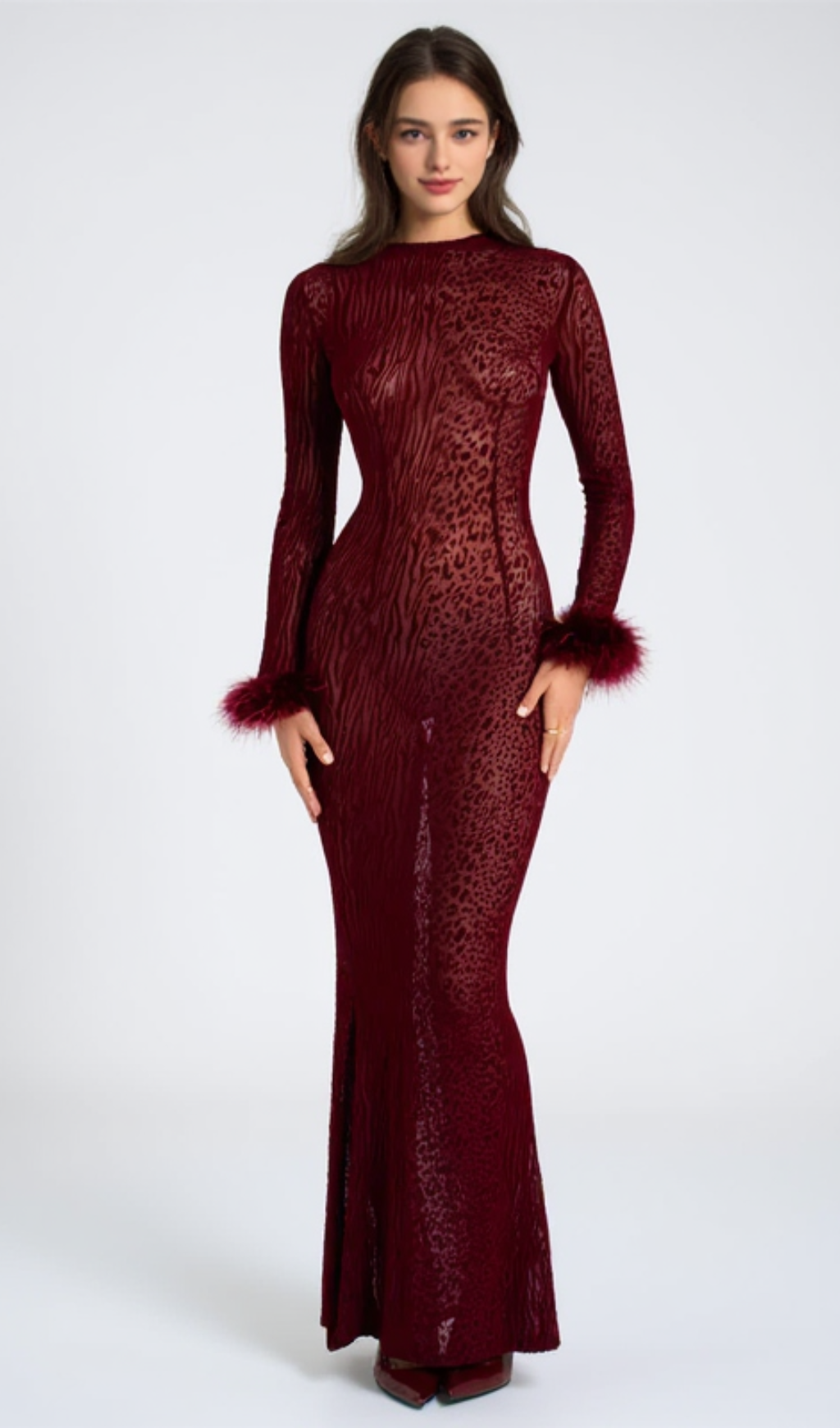 burgundy mesh feather maxi dress