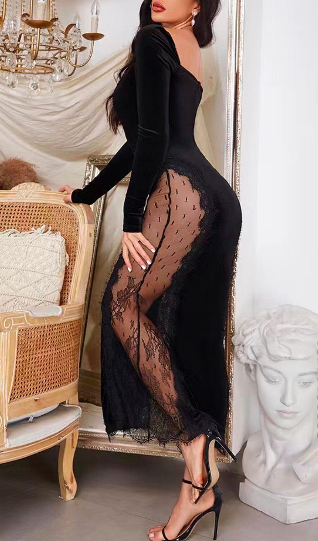 BURGUNDY SQUARE-NECK LACE STITCHED BAG BUTTOCK VELVET MAXI DRESS