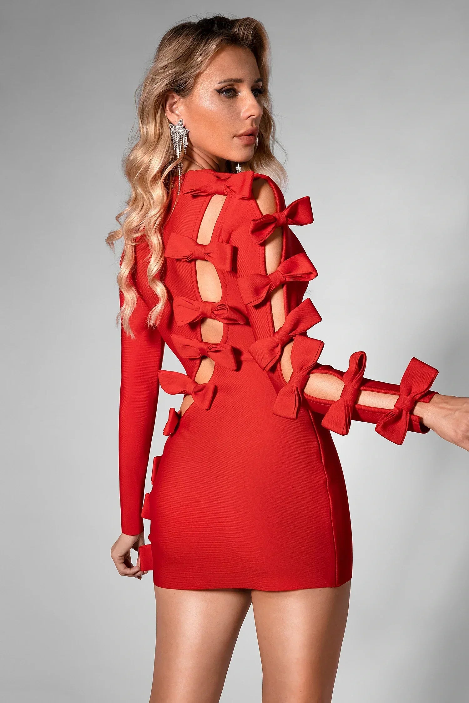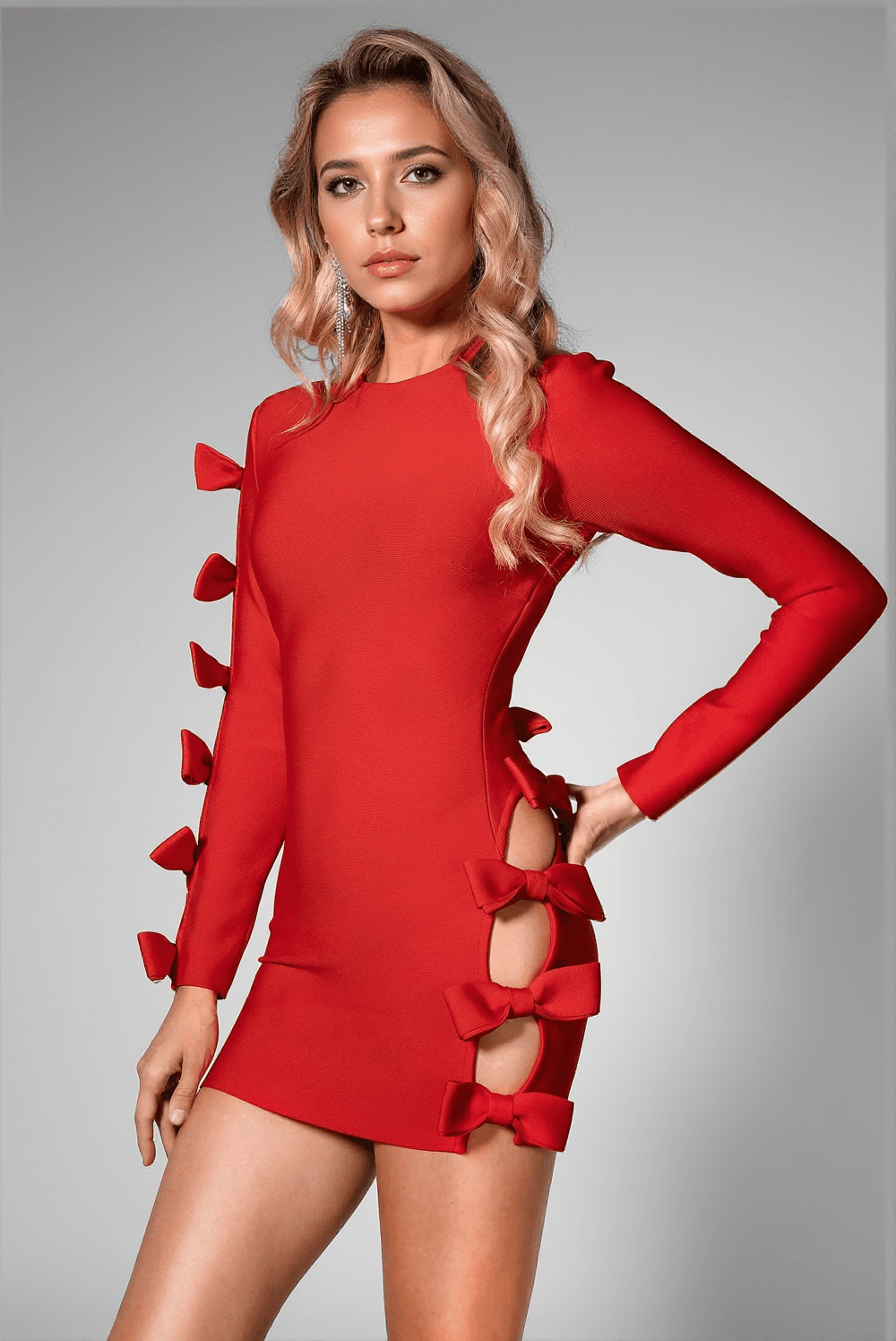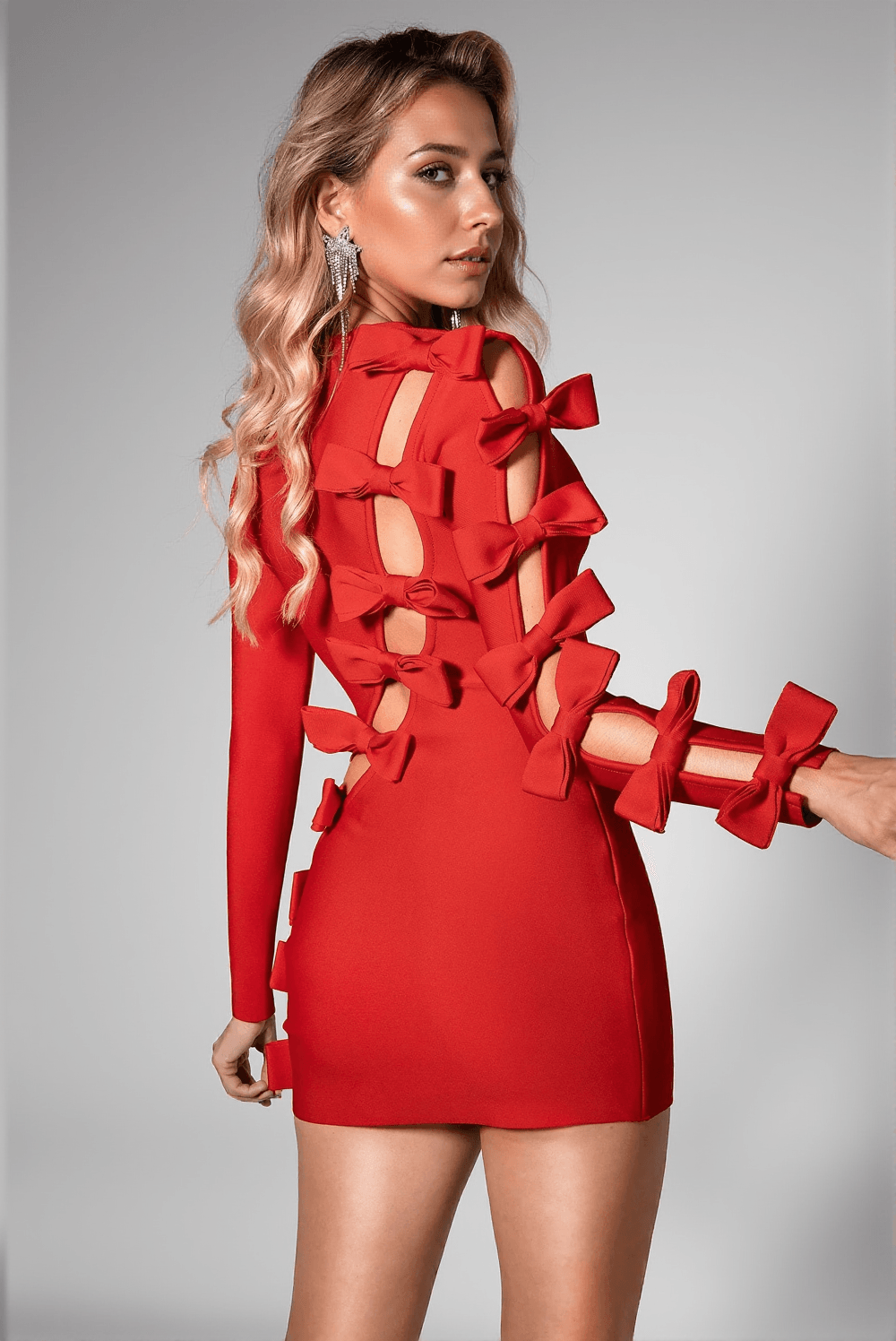 Whether you're heading to a glamorous cocktail party or planning a romantic evening out, this body-hugging mini dress with its flattering bow detail will make sure you stand out from the crowd. Perfectly balanced between elegance and allure, it's designed to captivate every eye.