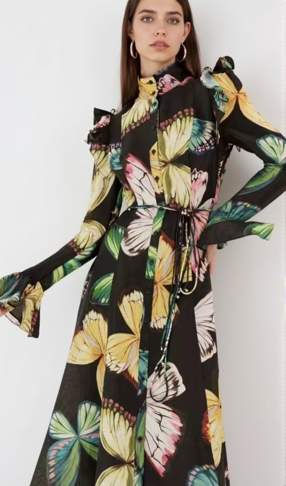 The stunning butterfly sleeves and papillon print add a touch of whimsy, while the flattering midi length offers a versatile and elegant look. Stand out in this unique and beautiful dress that will surely turn heads.