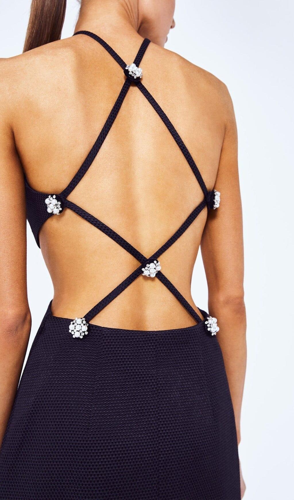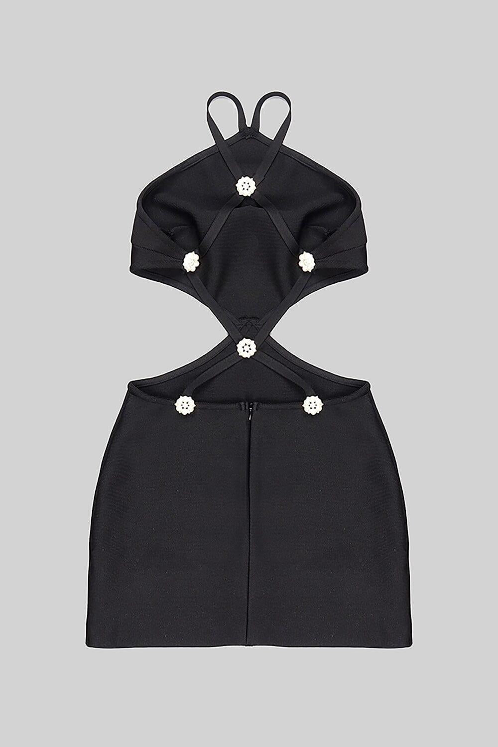 BUTTON BACKLESS HALTE MINI BANDGE DRESS IN BLACK