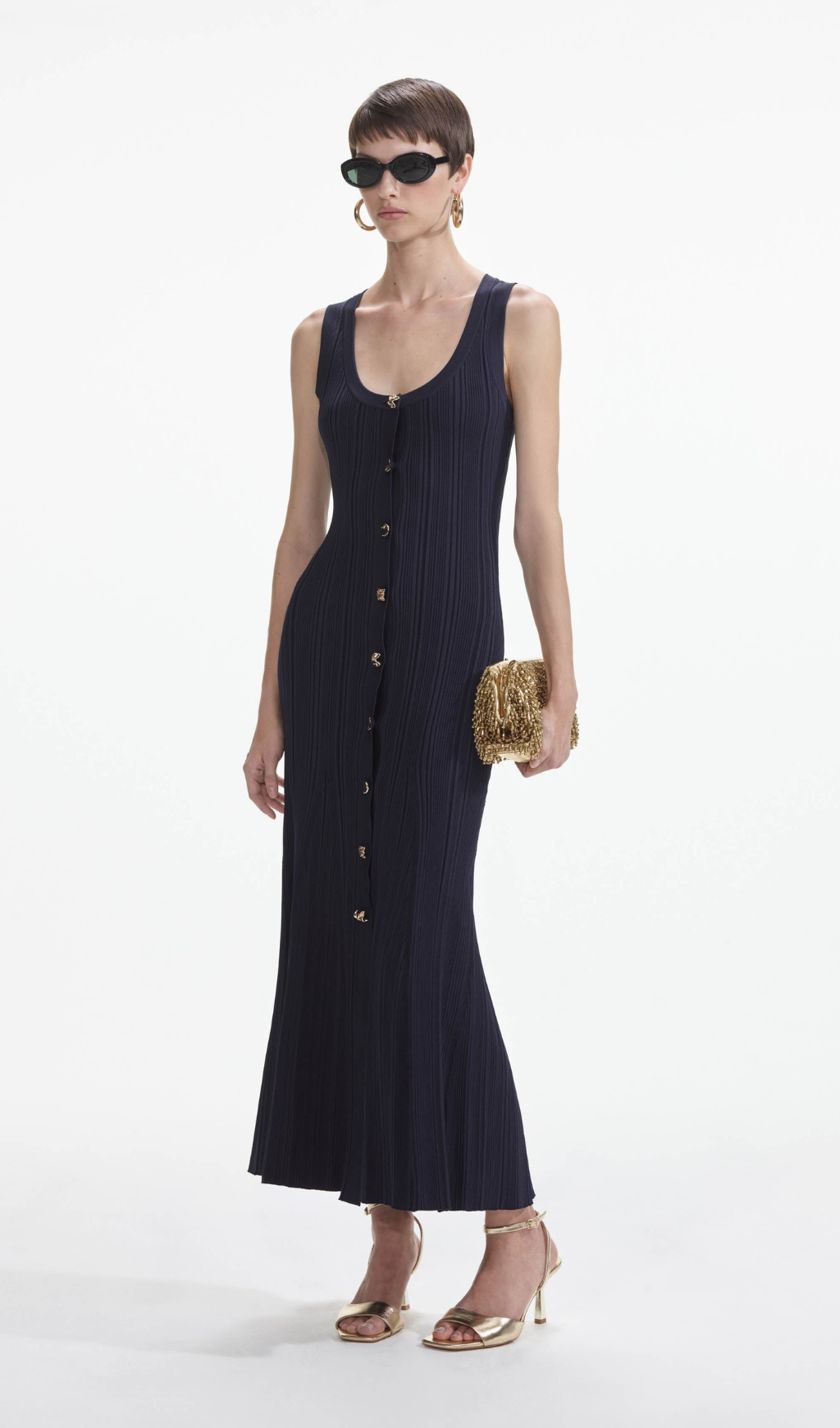 Add a touch of elegance to your wardrobe with our navy ribbed-knit midi dress. The button embellishments elevate this dress, making it perfect for any occasion. With its comfortable fit and versatile design, you'll look and feel your best. A must-have for any fashion-forward individual.