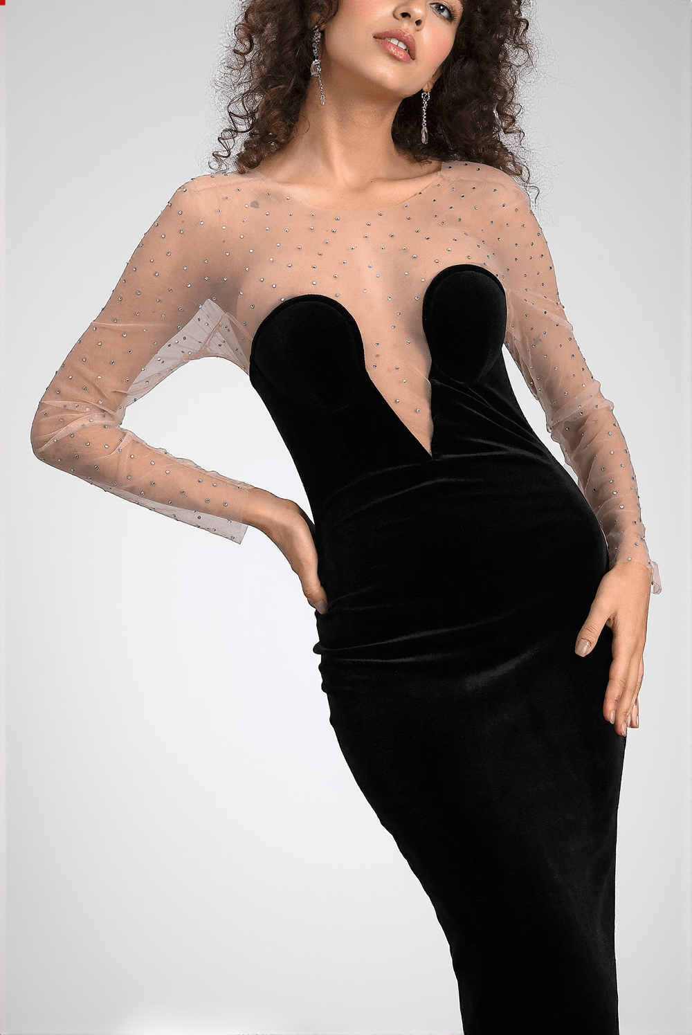 Designed to accentuate the natural beauty of any silhouette, this dress offers a perfect blend of comfort and elegance. The intricate mesh detailing on top contrasts beautifully with the rich velvet skirt, creating a captivating visual effect that turns heads wherever you go.