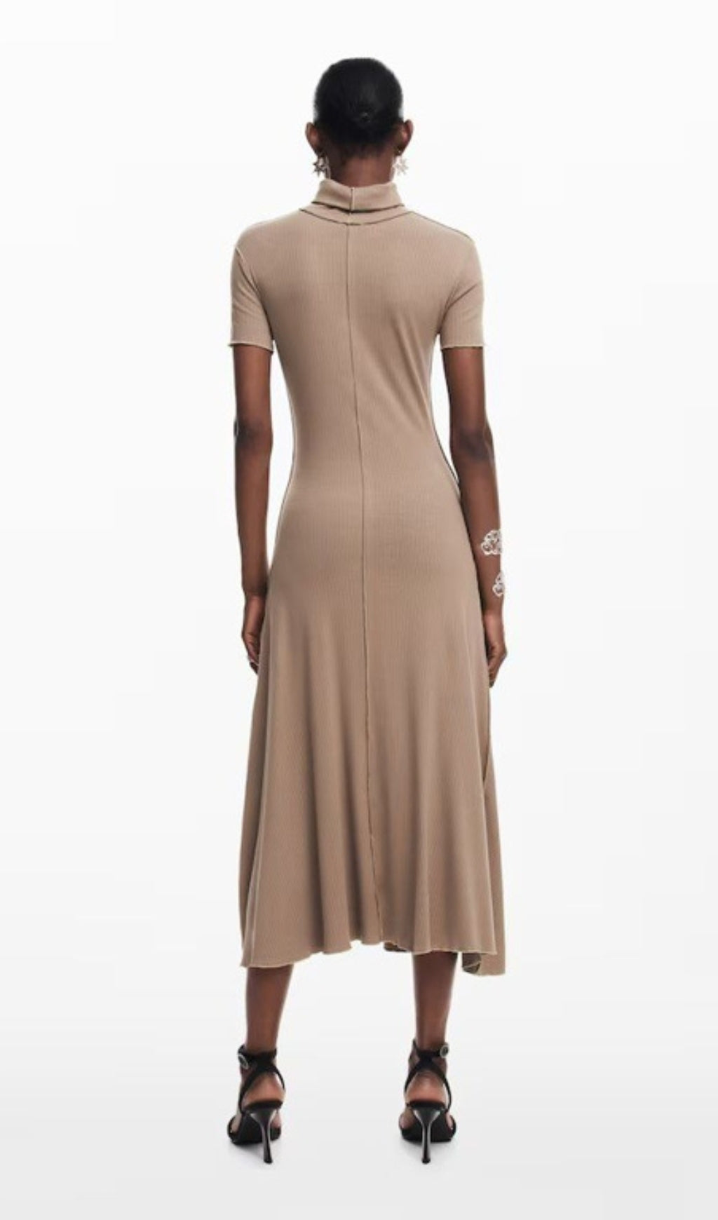 camel bodycon midi dress with high neck