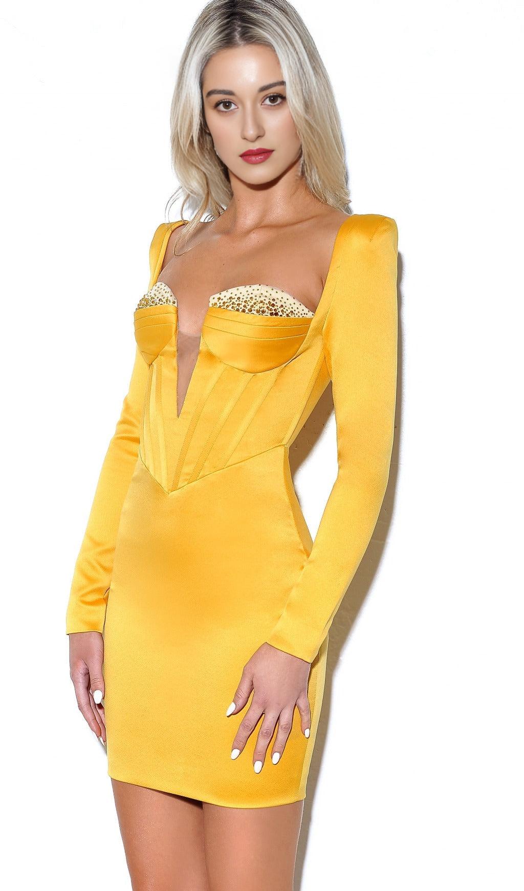 Elevate your style and shine bright in the Camila Gold Satin Corset Dress with Crystals. Order yours today and be the center of attention wherever you go!