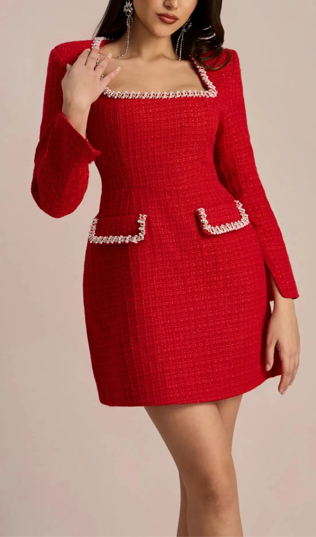 Experience timeless elegance with our Camilla Square Neck Tweed Mini Dress. Crafted from luxurious tweed fabric, this dress showcases a classic square neckline and long sleeves adorned with exquisite pearl trims. With padded shoulder accents, it exudes sophistication in every detail.