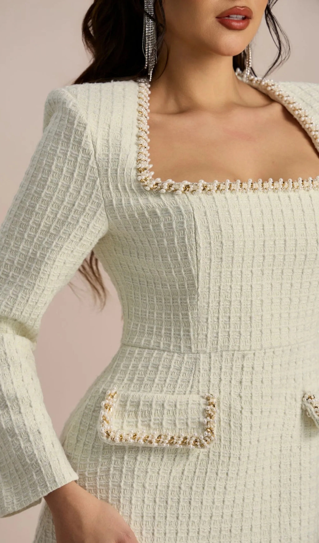 Experience timeless elegance with our Camilla Square Neck Tweed Mini Dress. Crafted from luxurious tweed fabric, this dress showcases a classic square neckline and long sleeves adorned with exquisite pearl trims. With padded shoulder accents, it exudes sophistication in every detail.