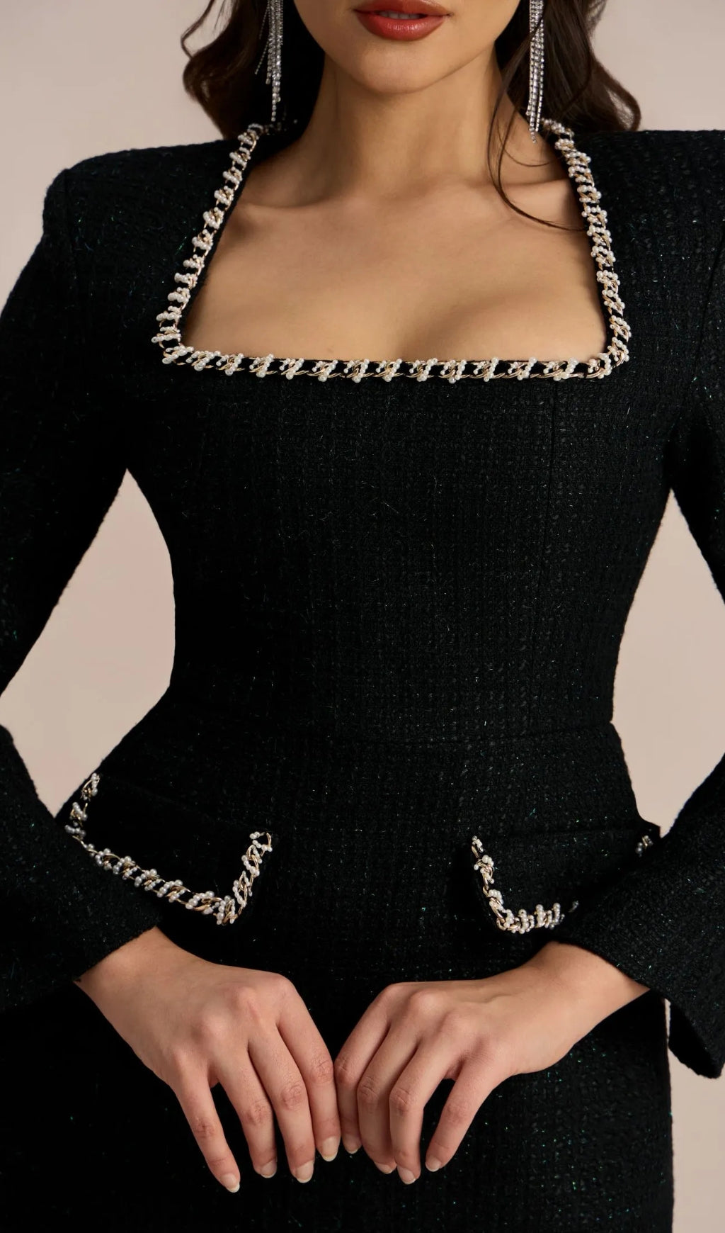 Experience timeless elegance with our Camilla Square Neck Tweed Mini Dress. Crafted from luxurious tweed fabric, this dress showcases a classic square neckline and long sleeves adorned with exquisite pearl trims. With padded shoulder accents, it exudes sophistication in every detail.