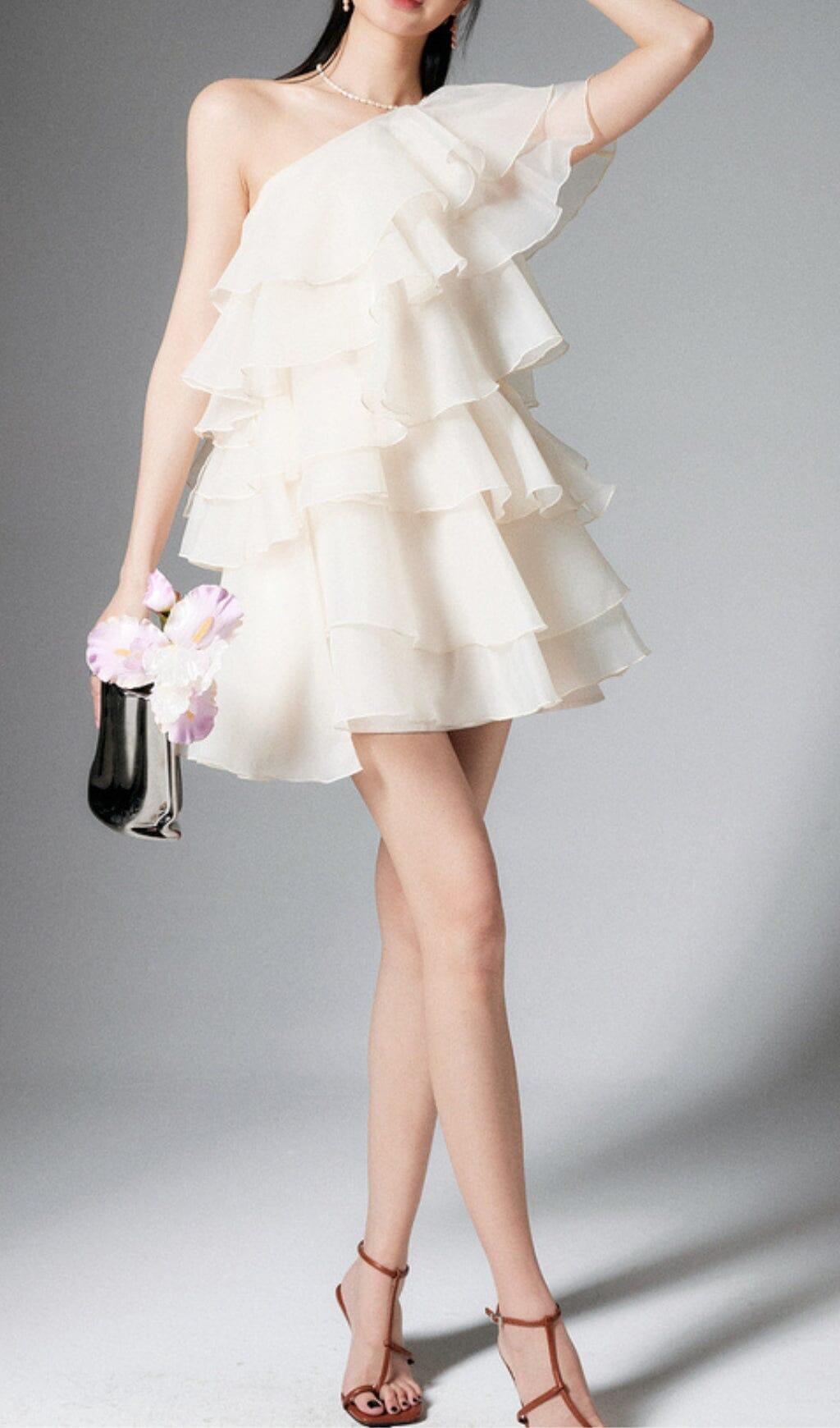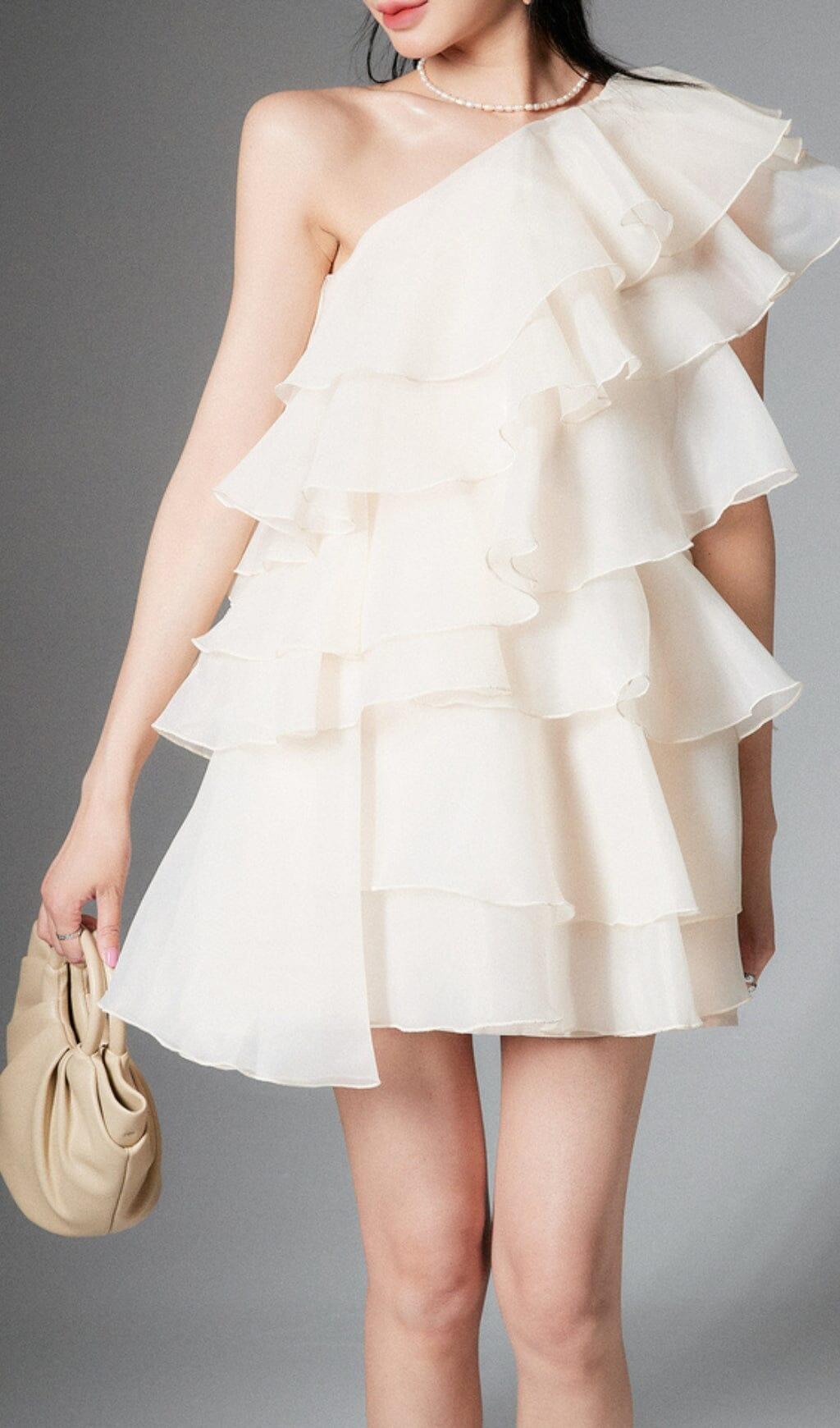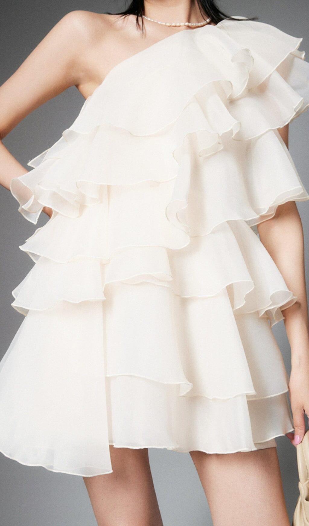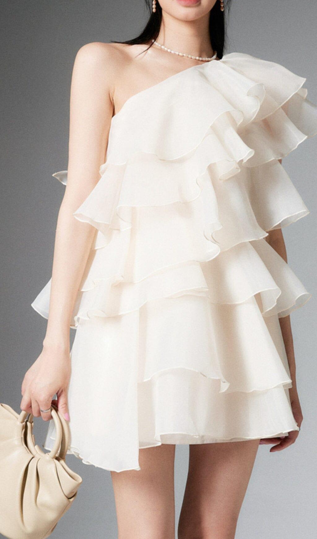 CAP-SLEEVE ONE-SHOULDER PLAIN TIERED MINI DRESS