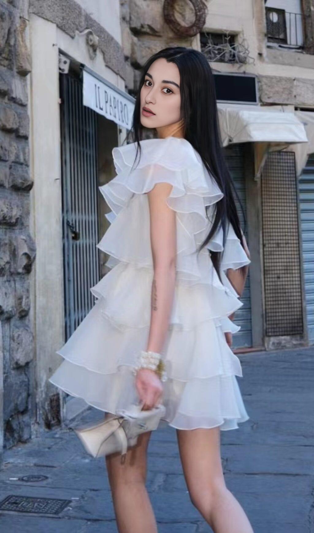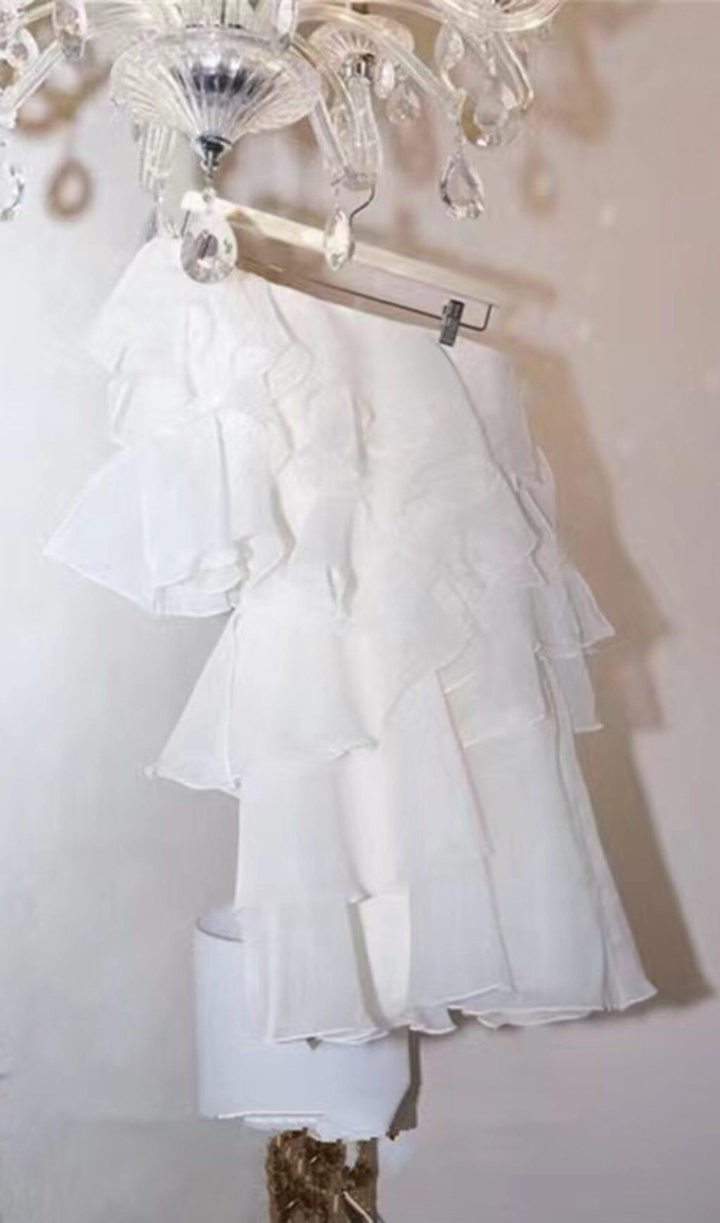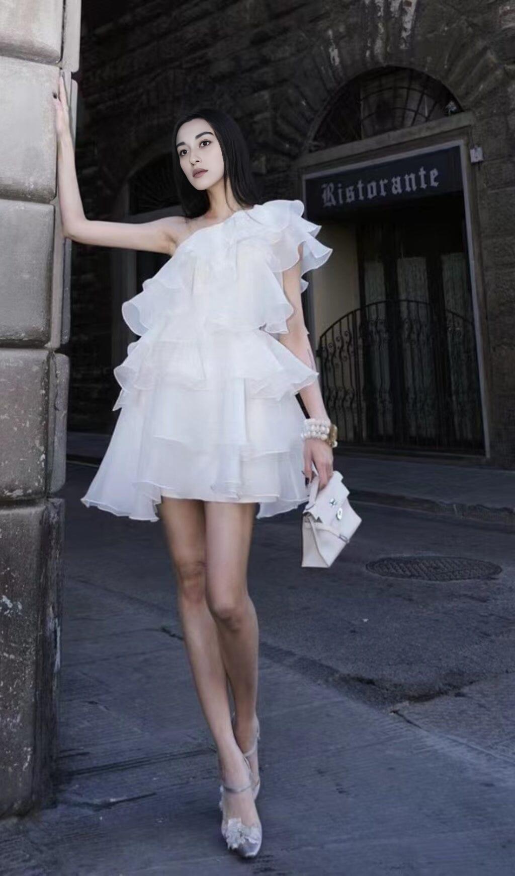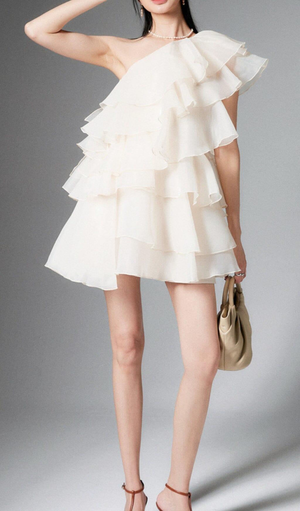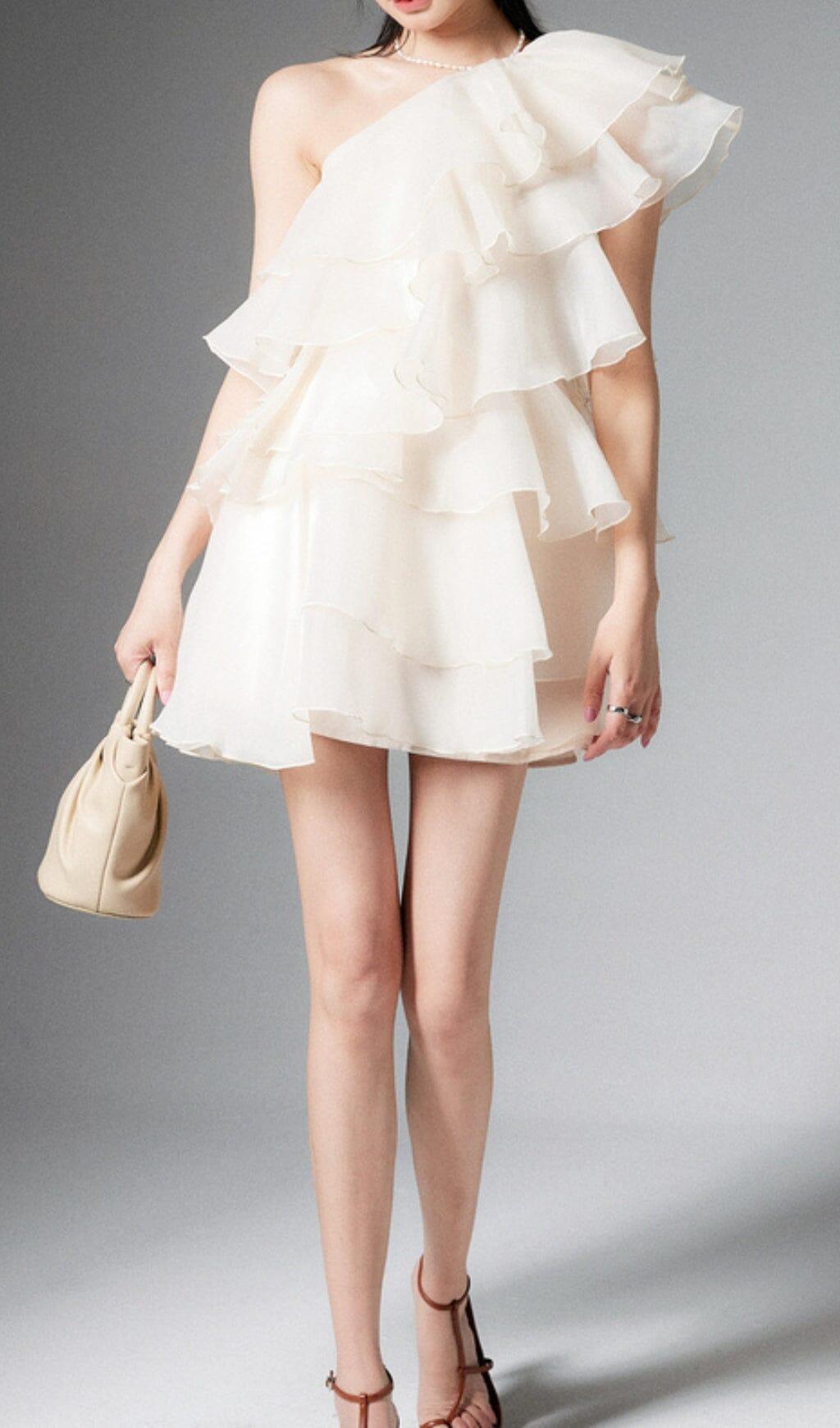 CAP-SLEEVE ONE-SHOULDER PLAIN TIERED MINI DRESS
