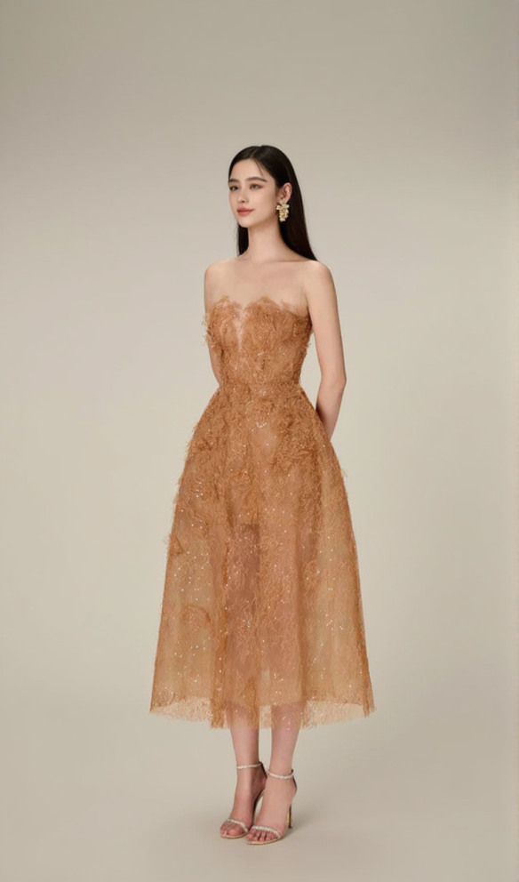 CARAMEL FLORAL LACE EMBROIDER MIDI DRESS