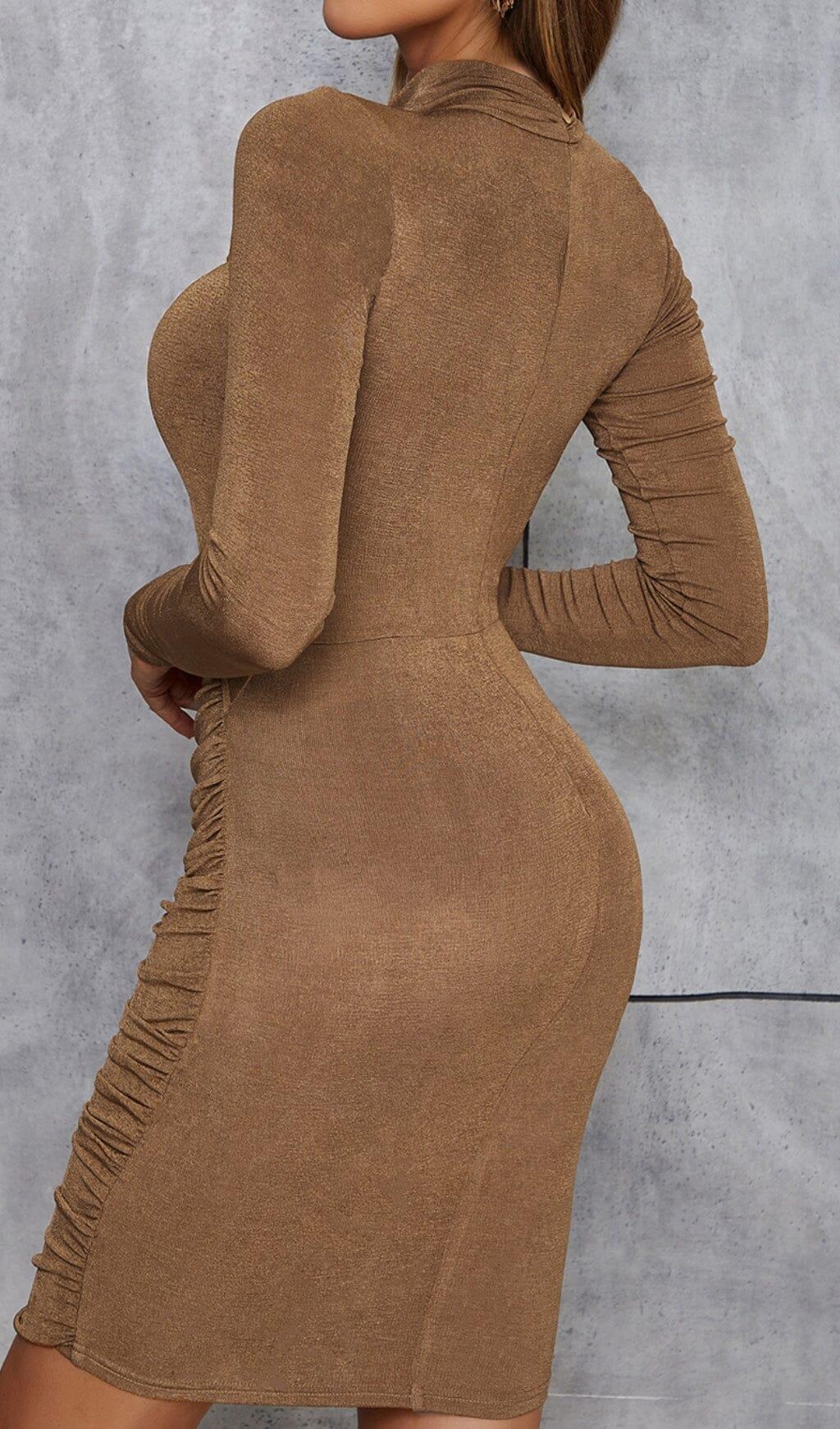 • Indulge in the European and American temperament with this caramel turtleneck cut-out slim dress