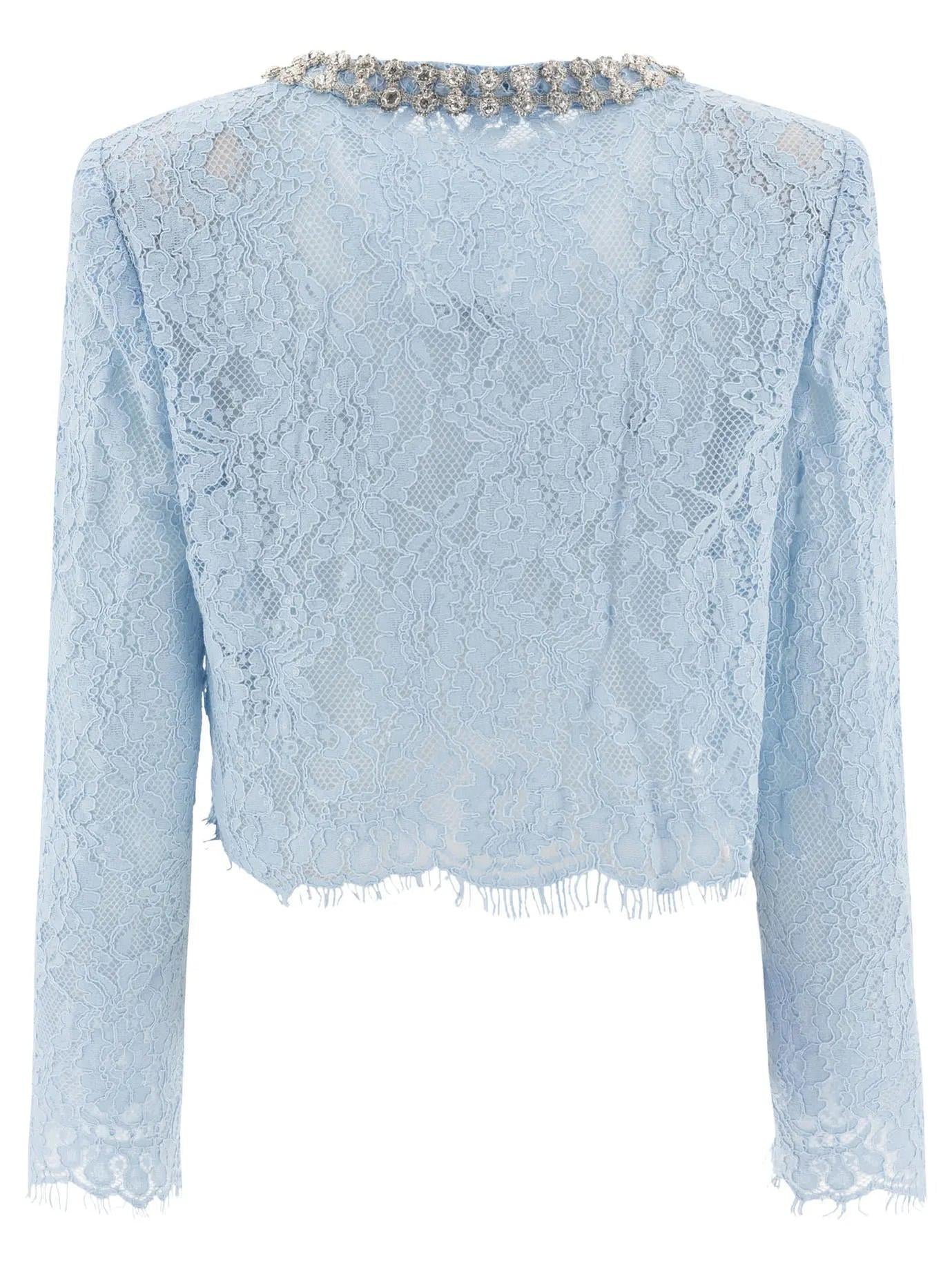 As an expert in fashion industry, I cannot emphasize enough the elegance and glamour this carol lace embellished top in blue brings to your wardrobe. With delicate lace details and stunning blue hue, this top exudes sophistication and style while adding a touch of femininity. Perfect for any occasion, this top will surely make you stand out in a crowd.