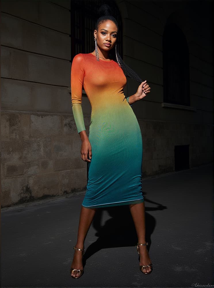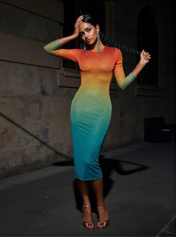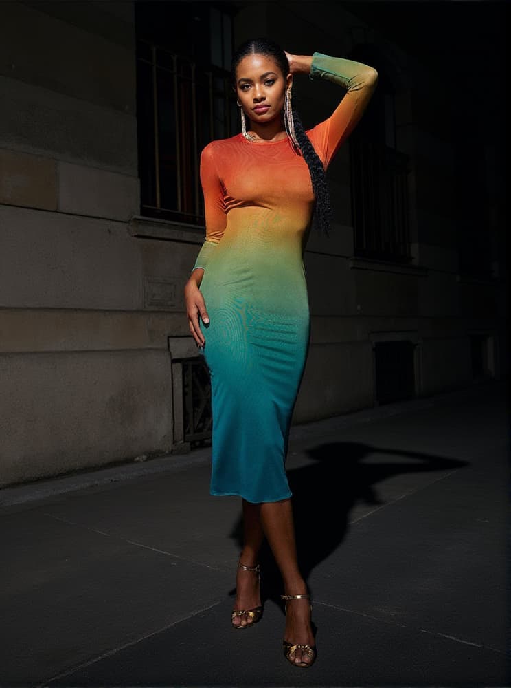 Our Celestial Ombre Long Sleeve Mesh Midi Dress is perfect for making a bold statement! With a stunning multi-coloured ombre effect and airy mesh material, this unique piece will have you looking and feeling your best. Plus, the midi length provides a flattering silhouette.